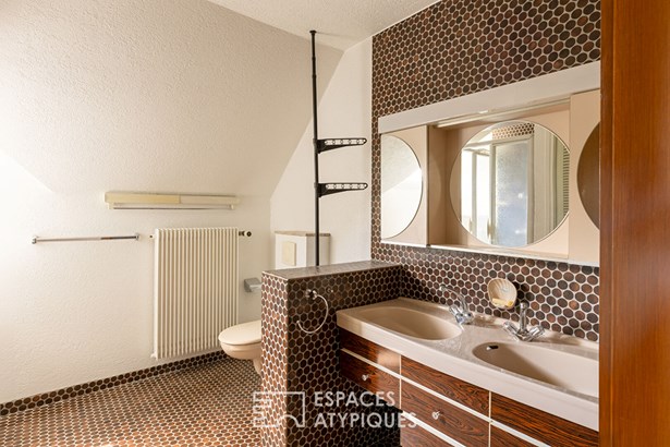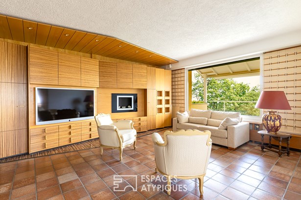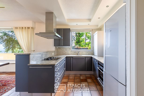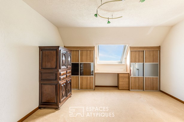 Situated in the highly sought-after Hunabuhl district of Niedermorschwihr, this architect-designed house built in 1975 offers 191 m2 of living space (282 m2 floor area) on 8.63 acres of land. In a dominant position, it enjoys exceptional panoramic views over the Alsace plain. Its generous volumes and rare features, such as an indoor swimming pool and a lift, make this a unique property that is just waiting for a contemporary refresh to reveal its full potential.