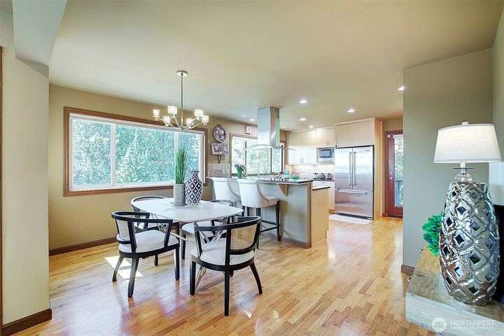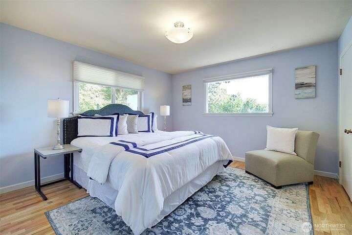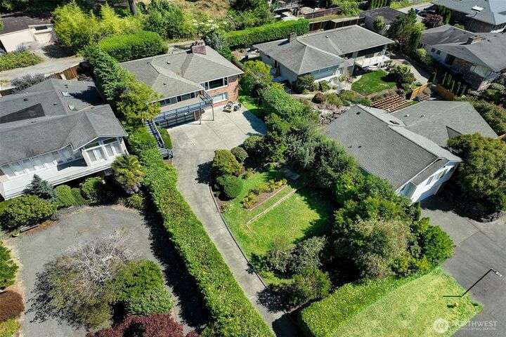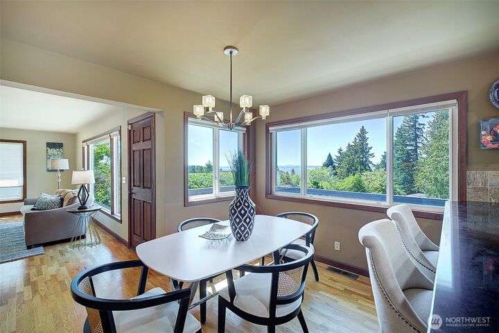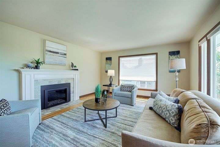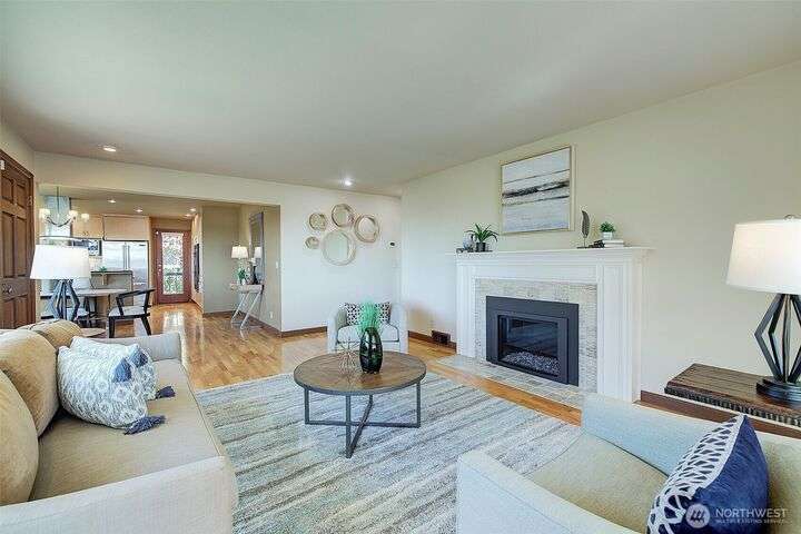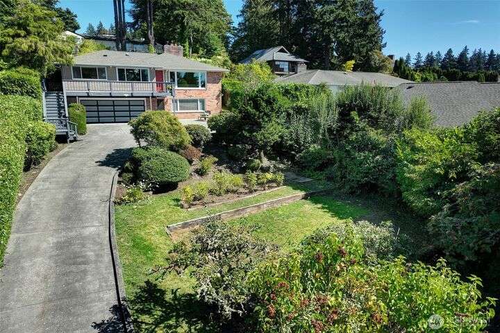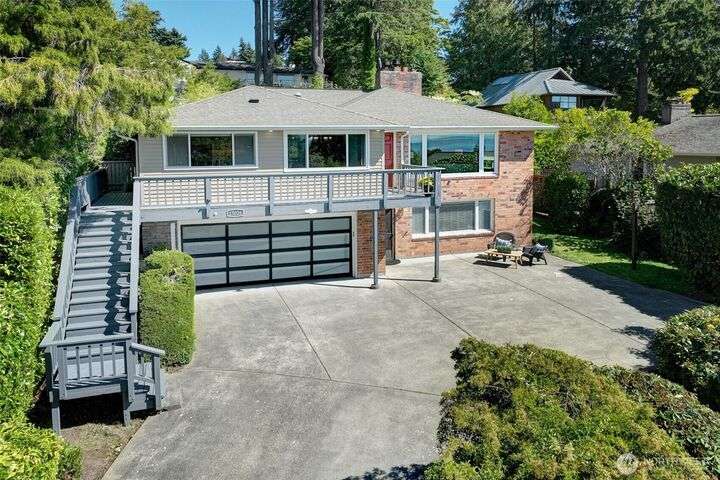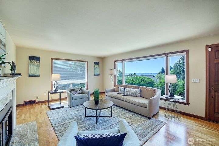 Discover timeless luxury in this private Broadview masterpiece with stunning Puget Sound & Olympic Mountain views. Nestled on a sprawling lot, this modern gem blends elegance w/serenity. Expansive panoramic windows, sleek hardwood floors, 2 gas fireplaces, tankless water heater, new deck paint, new garage door and a chef’s kitchen w/stainless steel appliances & prep sink create the perfect setting for both daily living & stylish entertaining. The upper level boasts light-filled living spaces & 2 bdrms, incl. a spa-like primary suite w/custom closet, jetted tub, stone shower & dual vanities. The lower level offers a chic living area, 2 bdrms & a spacious laundry room. Located near shops, restaurants, schools, Carkeek Park & so much more!