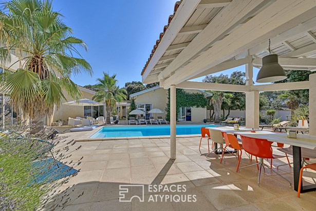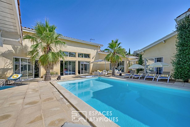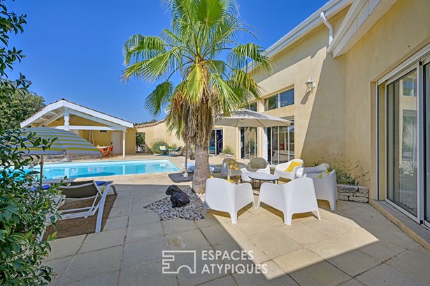A house where style is not guessed, it asserts itself. Upon entering, a majestic wooden door of extraordinary dimensions, pivoting on itself like an opening secret, sets the tone. Light floods in generously.