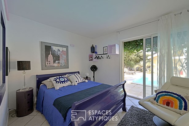 On the ground floor, the sleeping area brings together three bedrooms, an additional TV area, and leads, via an intimate patio, to a separate apartment. Two bedrooms, a kitchenette, all bathed in calm and autonomy, perfect for entertaining without encroaching.