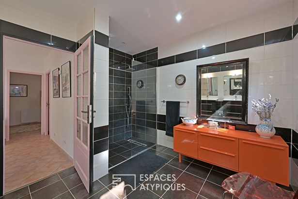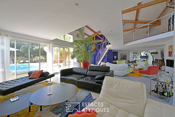 The vast living space, six meters high, open and structured like a living painting, offers several atmospheres: an intimate living room, a cozy dining area, a relaxation area to escape.