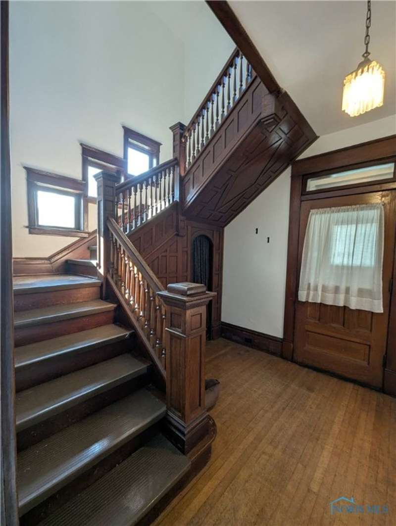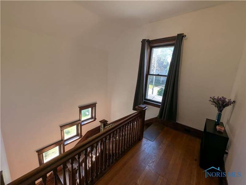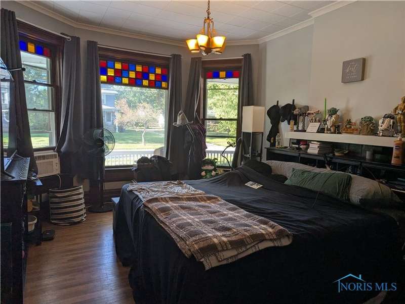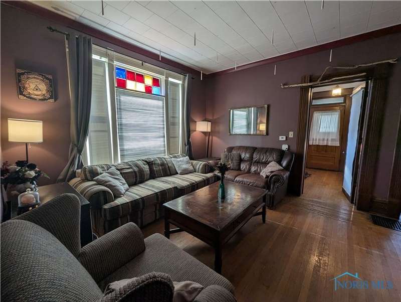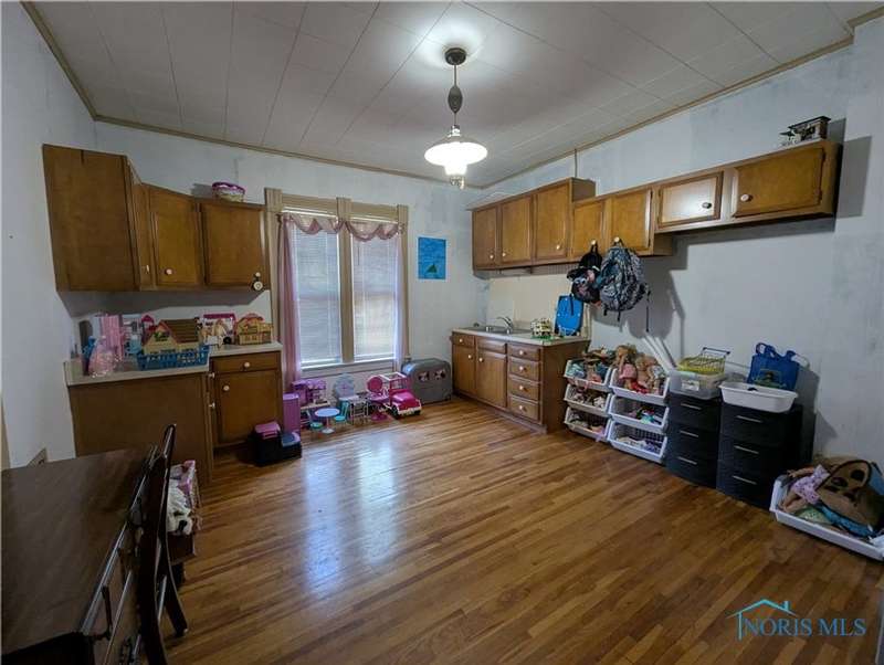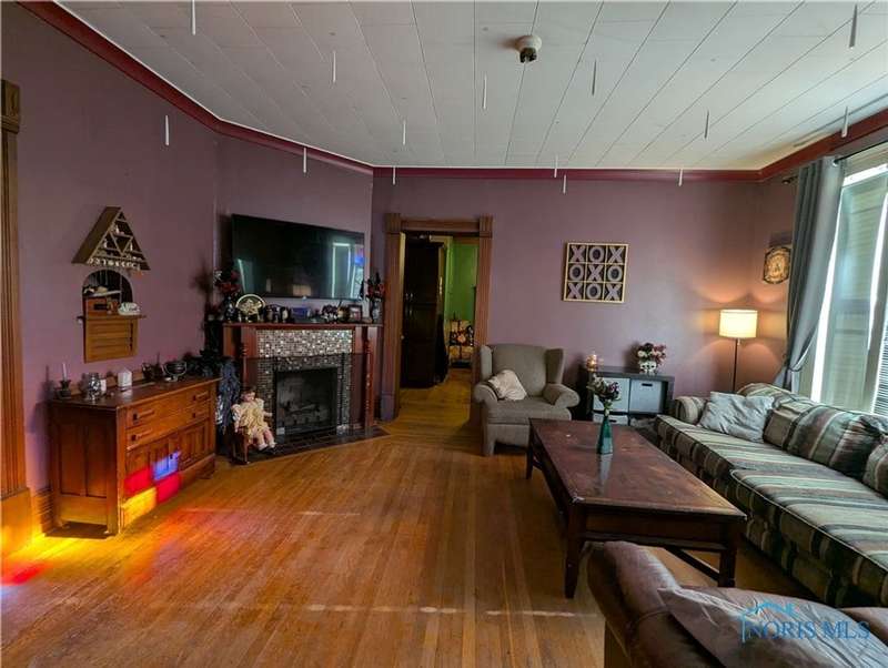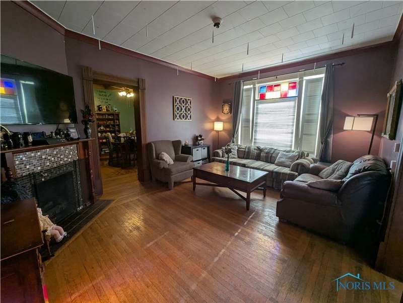 Victorian beauty featuring 4-5 bedrooms & a delightful wrap-around porch. Step inside to a formal 2 story foyer adorned w/exquisite beveled glass windows, showcasing the original woodwork & hardwood flooring. Kitchen boasts cherry cabinetry & a unique tin ceiling, while the DR impresses w/its wood ceiling & cherry beams. Enjoy cozy evenings in the LR or MB, both featuring dec fireplaces & stained glass windows. W/2 baths & upstairs kitchen currently serving as a playroom, this home offers versatility or potential duplex living. Large lot includes a 2.5 car garage w/extra finished heated room.