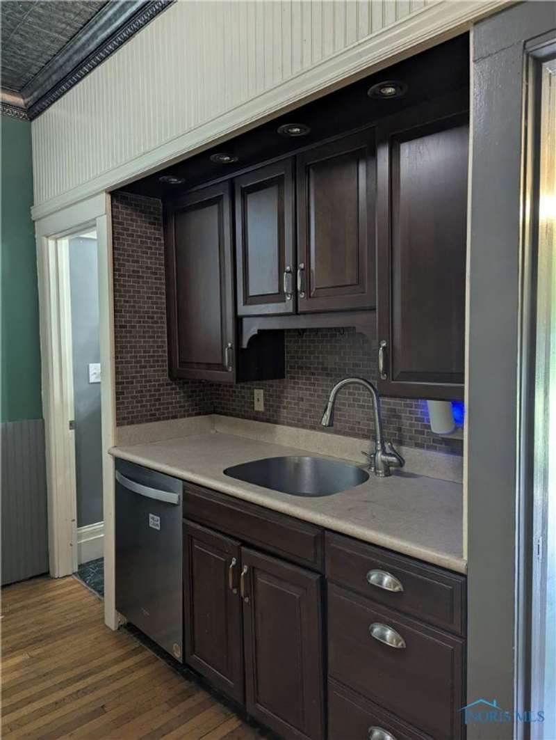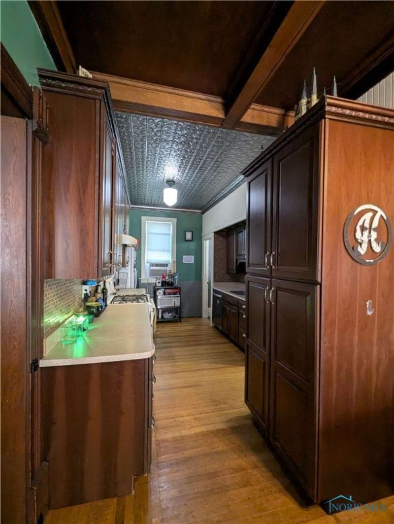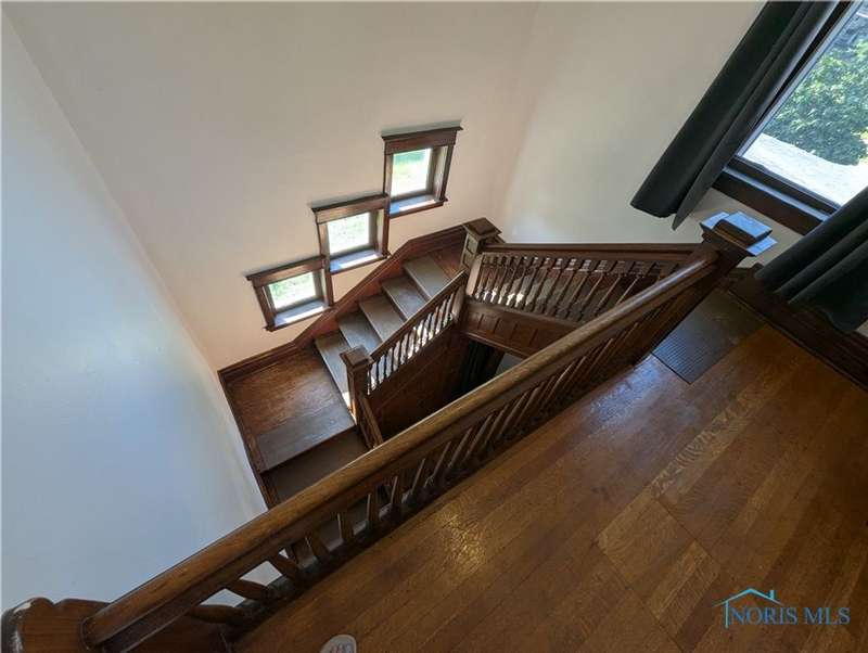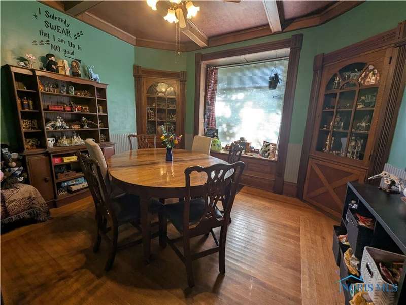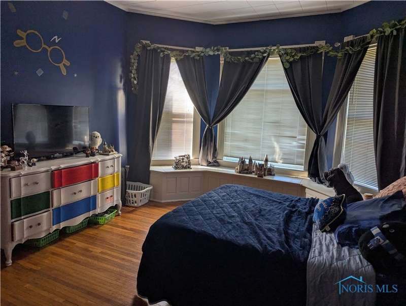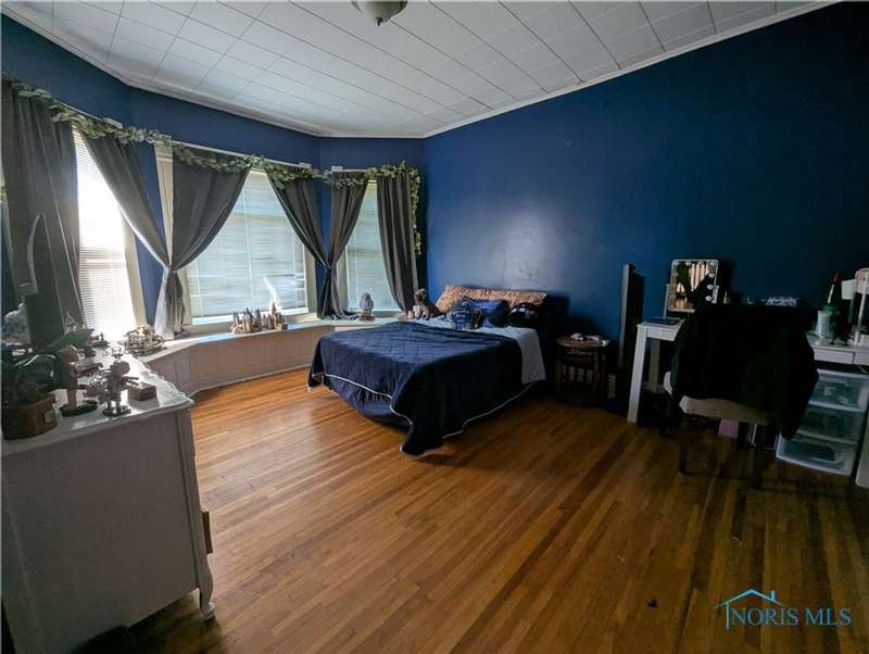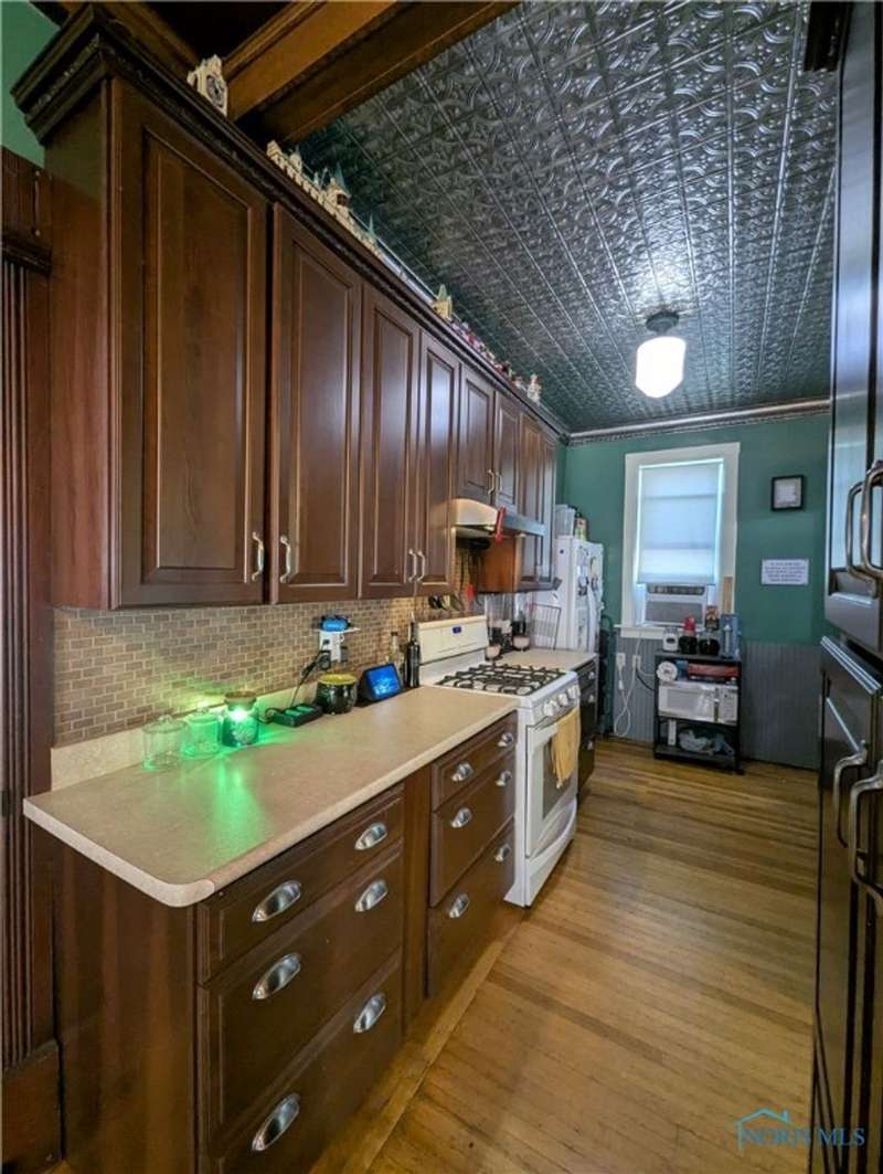 Victorian beauty featuring 4-5 bedrooms & a delightful wrap-around porch. Step inside to a formal 2 story foyer adorned w/exquisite beveled glass windows, showcasing the original woodwork & hardwood flooring. Kitchen boasts cherry cabinetry & a unique tin ceiling, while the DR impresses w/its wood ceiling & cherry beams. Enjoy cozy evenings in the LR or MB, both featuring dec fireplaces & stained glass windows. W/2 baths & upstairs kitchen currently serving as a playroom, this home offers versatility or potential duplex living. Large lot includes a 2.5 car garage w/extra finished heated room.