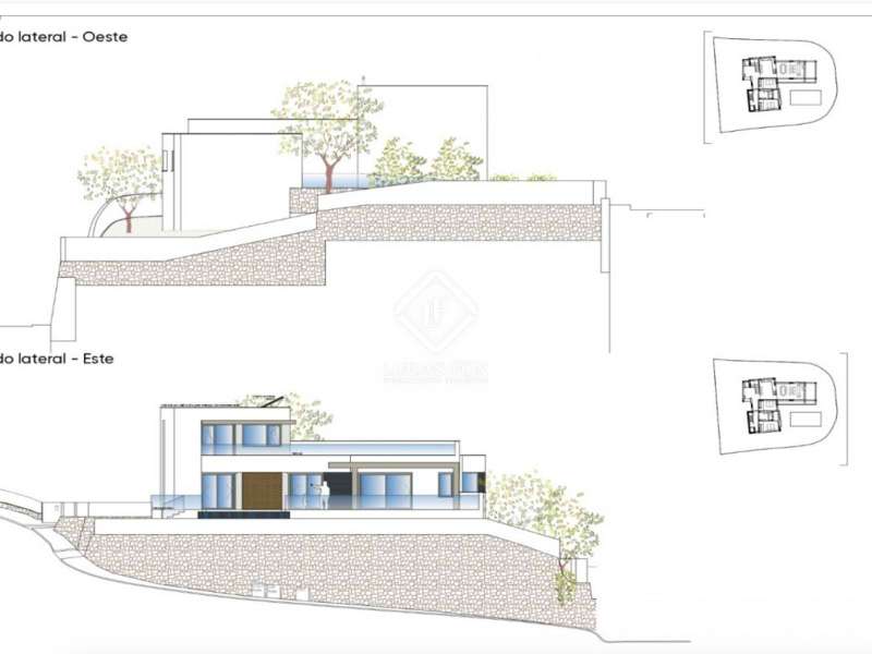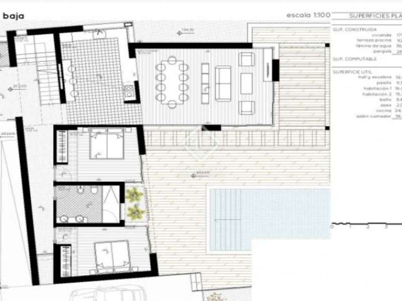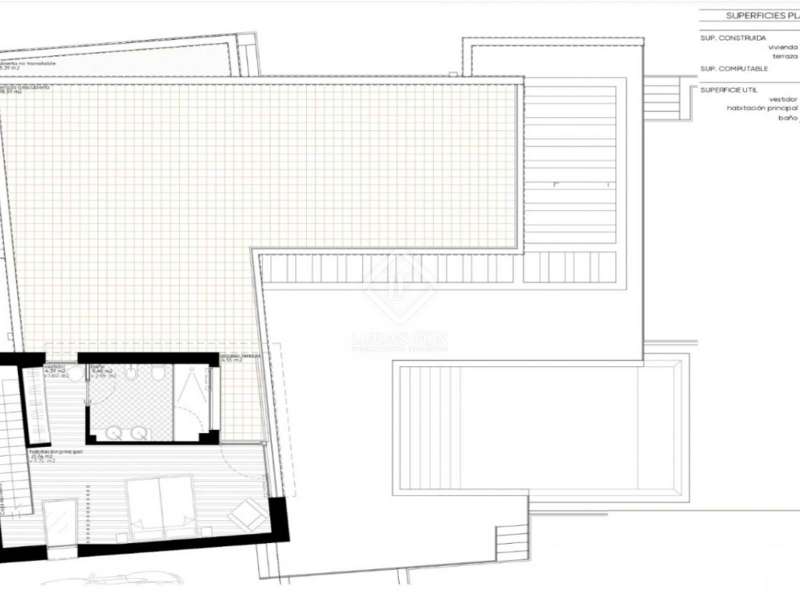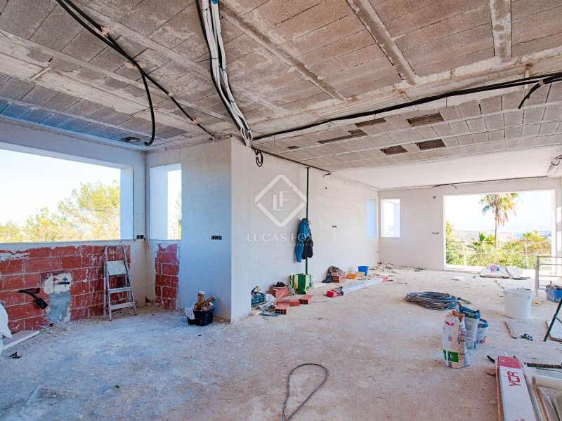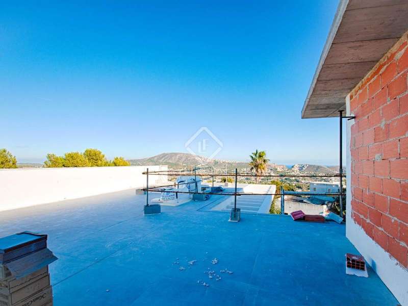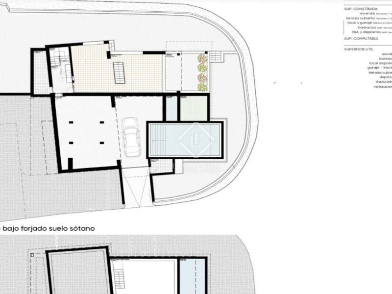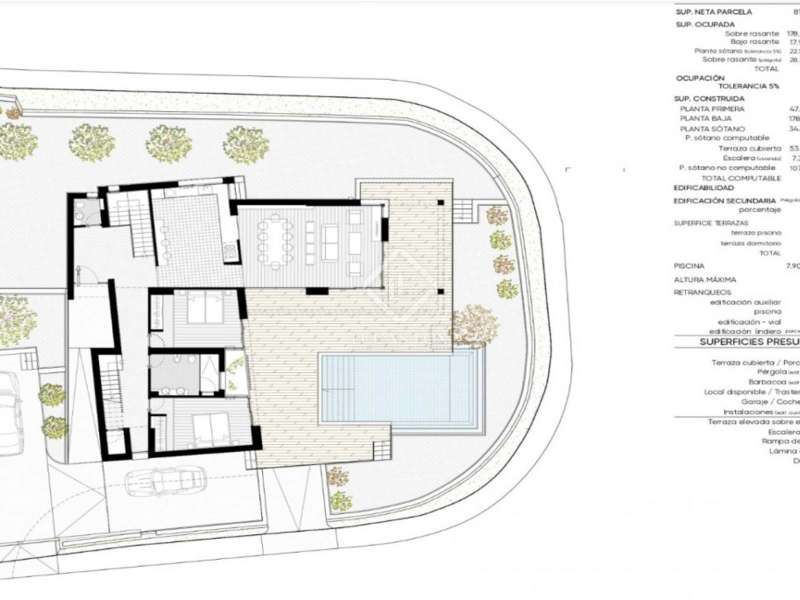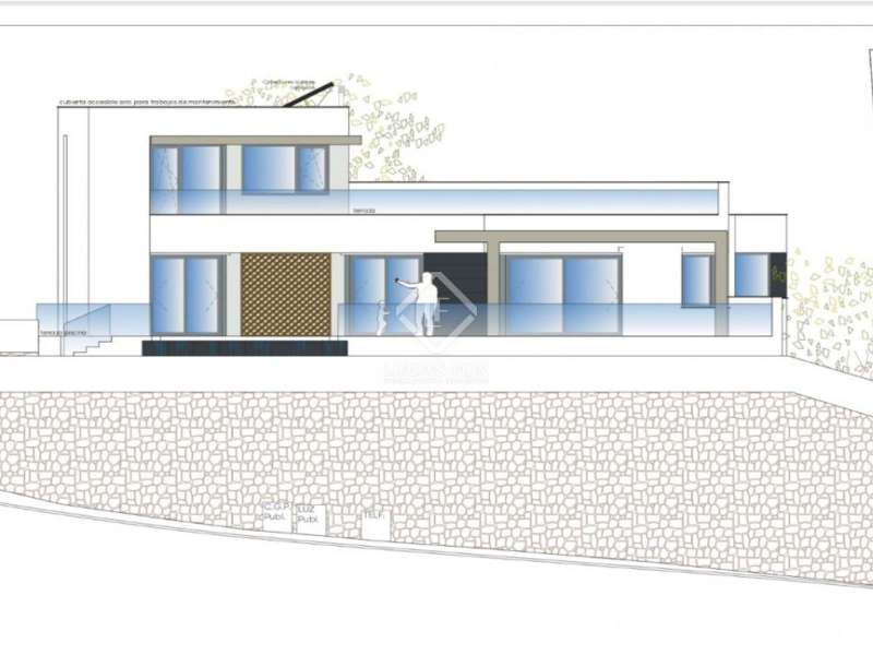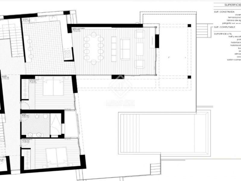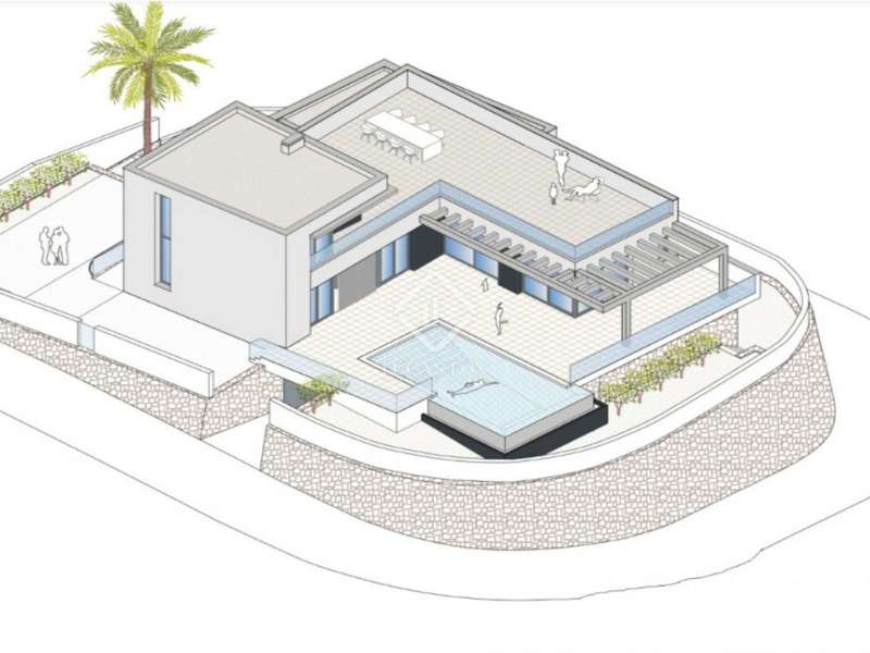 This villa consists of 4 floors. The main living floor has a spacious living/dining room with access to the pool terrace, a very large kitchen, two double bedrooms with built-in closets and access to the terrace; both bedrooms share a bathroom with walk-in shower. On this floor, there is also a guest toilet. On the second floor, you find the master bedroom with en suite bathroom, a walk-in closet, and access to a private sun terrace. Beneath the main living floor, there is a large under build with space to create another 3 (bed) rooms and where the garage is located. From here there are stairs down to the basement. Extras: several suns and covered terraces, 8x4m swimming pool, double glazing, underfloor heating, basement for storage and an off-road parking spot.