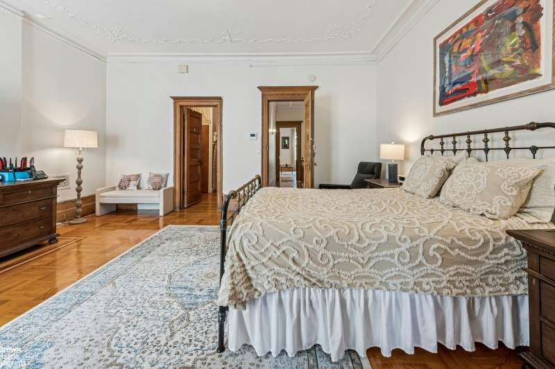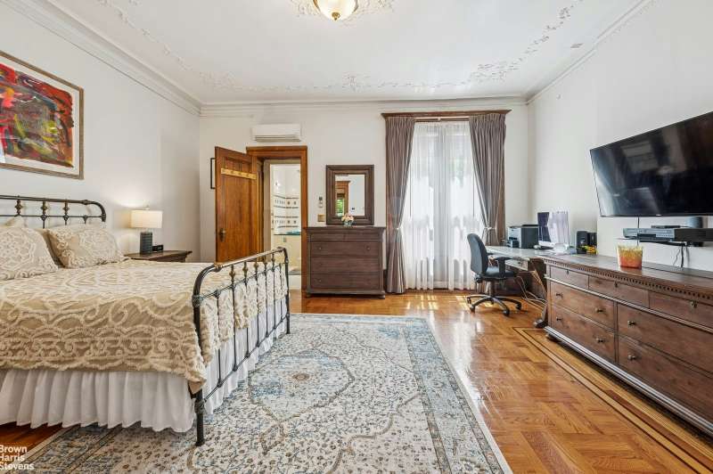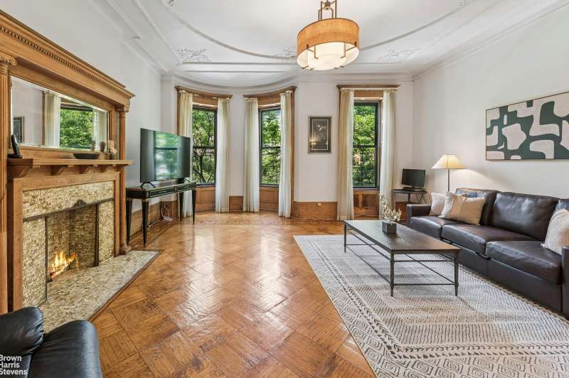Showcasing the distinctive characteristics of Renaissance Revival with Romanesque and Italianate influences, the townhouse boasts original limestone cladding adorned with ornate carvings, a classic brownstone stoop, and a striking pressed-metal cornice. Inside, you'll find decorative plaster ceilings, exposed beams, and a sense of craftsmanship that speaks to a bygone era while inviting you to create new memories within its walls.