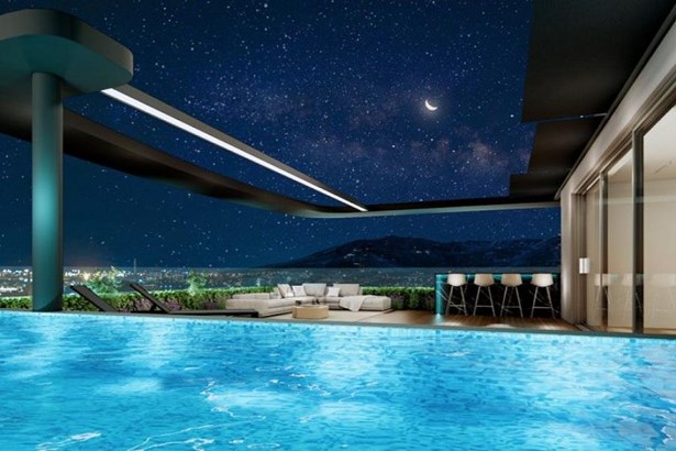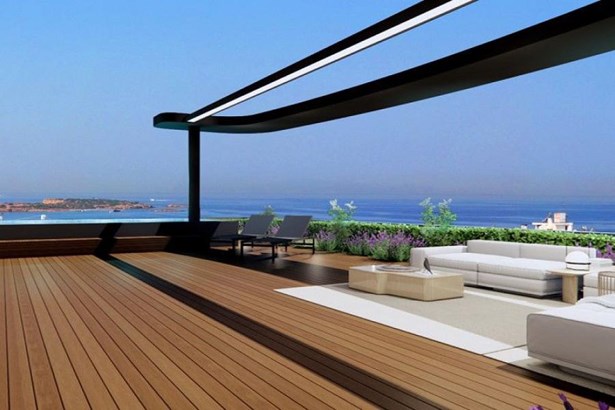 The 5th floor consists of 130m2 and can be accessed by either an interior staircase or the private lift inside the property. There, you will find 2 large bedrooms with en suite bathrooms and a smaller bedroom with an en-suite bathroom. Moreover, you will find a living area, a W.C, a laundry room, the roof garden and the pool. On top of that, the roof garden offers a BBQ place. The perfect place for relaxing and swimming while enjoying the sea view. Additionally, the beautifully planted rooftop has a pergola used to form an outdoor dinning space.