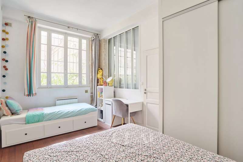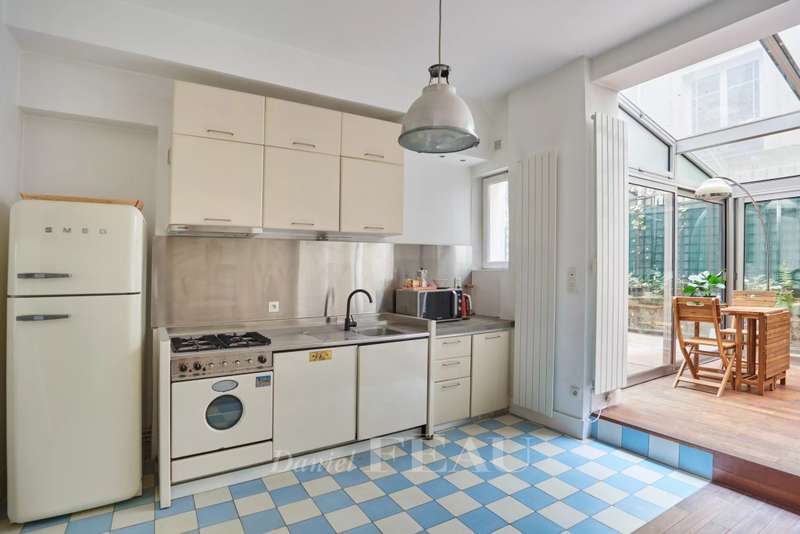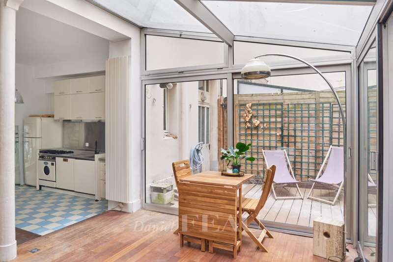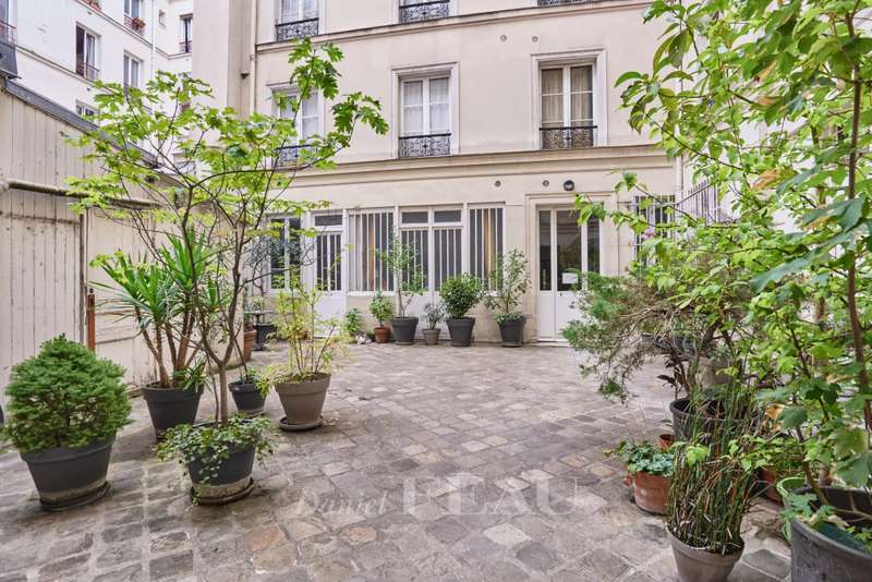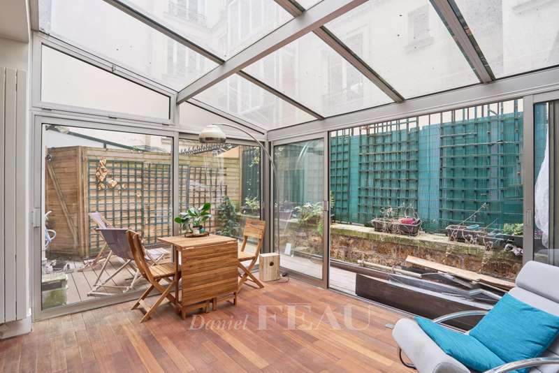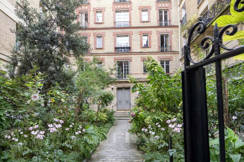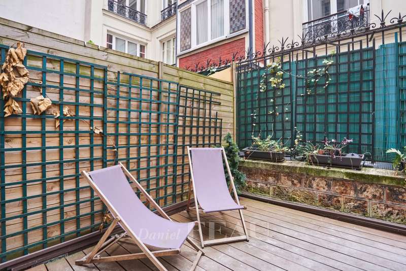 Rue Lepic, in the heart of historic Montmartre. This peaceful and charming apartment offering 77.17 sqm of floor space and 61.71 sqm of living space as defined by the Carrez Law is on the ground floor of a fine 1920s building. Overlooking a courtyard, it includes a living/reception room with an open-plan kitchen, a veranda accessing a pretty terrace, two bedrooms, a walk-in wardrobe, a shower room and a separate wc. An ideal pied a terre in a unique location.