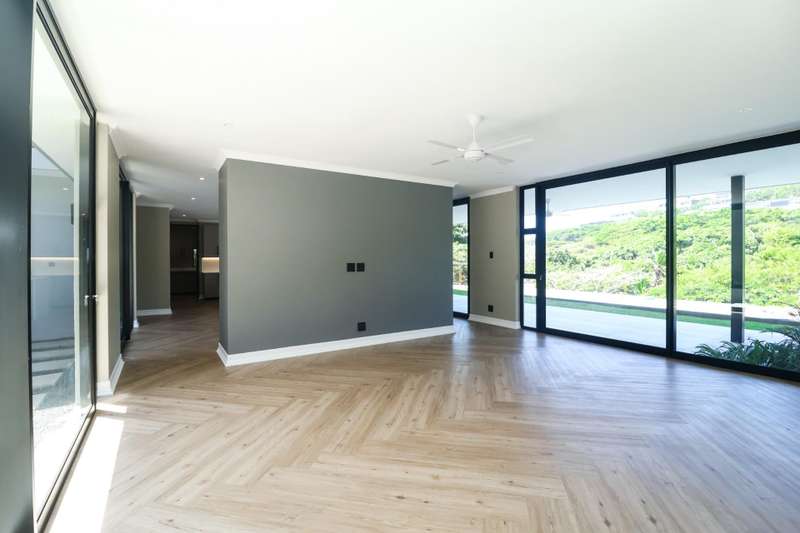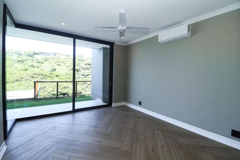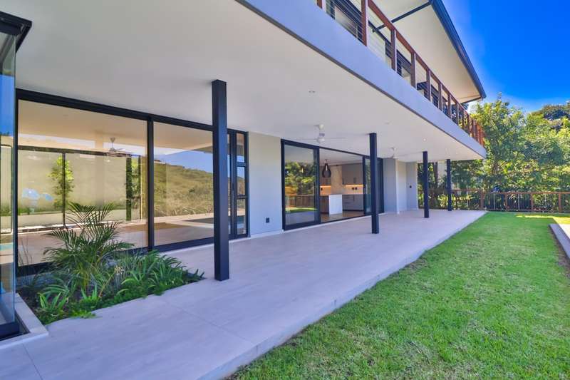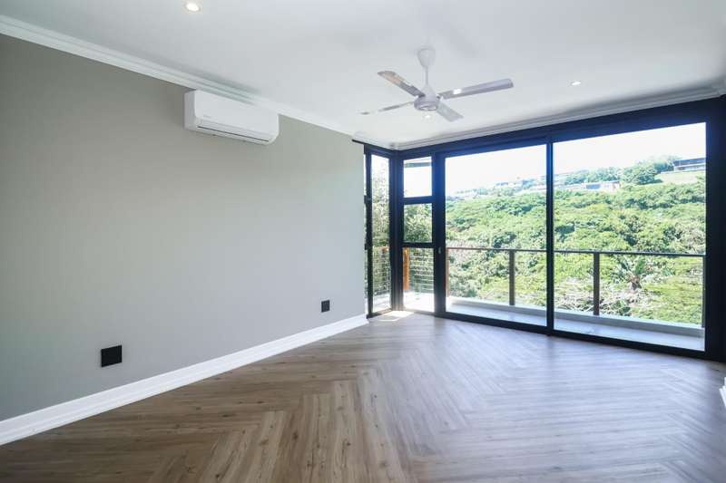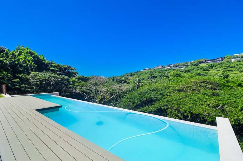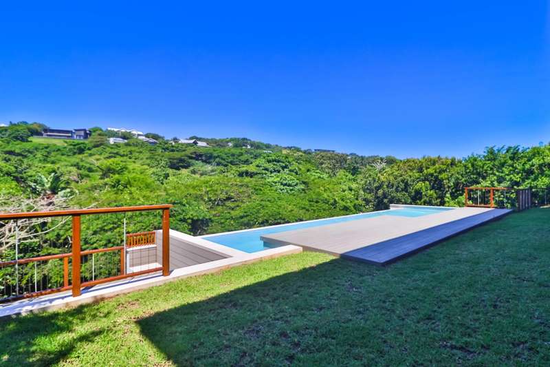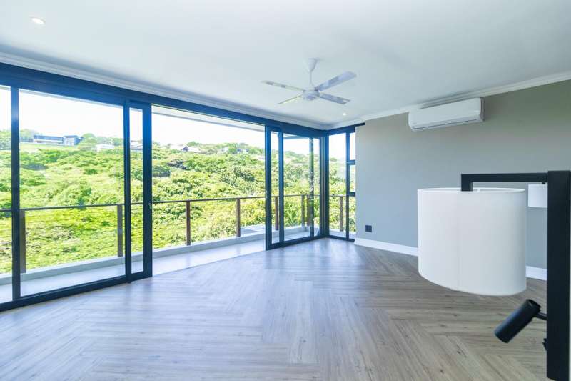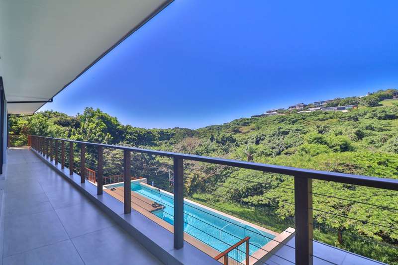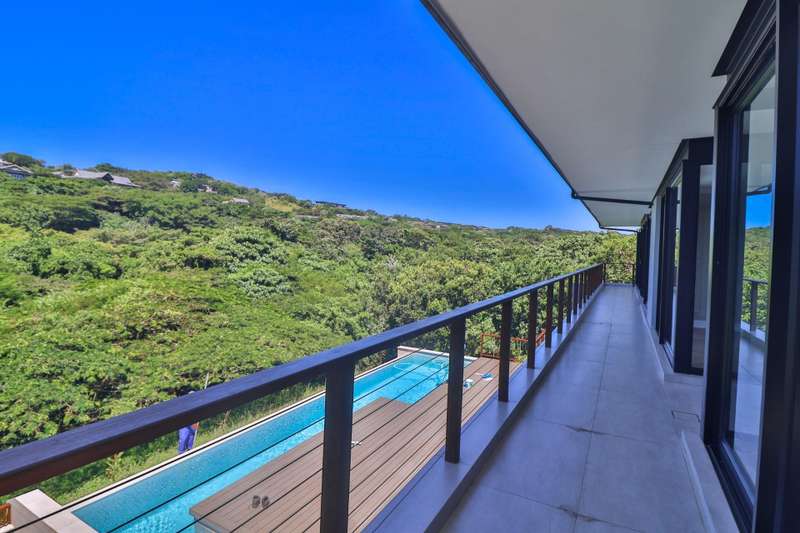 This newly completed five-bedroom masterpiece in Simbithi Golf Estate, offers a seamless blend of modern luxury and natural serenity. Designed with state-of-the-art features, the home has full solar energy and a backup filtered water system. Premium finishes, including exquisite wooden flooring, elegantly appointed bathrooms and a large modern kitchen with marble tops Upon entering, you are welcomed onto the upper level, where a grand staircase leads down to the heart of the home, a breathtaking open-plan kitchen, complete with a large separate scullery. Triple sliding doors connect the kitchen, dining area, and covered patio, offering a seamless indoor-outdoor flow, perfect for entertaining. The entertainment spaces and all five bedrooms are designed to embrace the beauty of the surrounding endless green forest. The expansive private patio sits next to beautiful pool raised above the forest, sunken outdoor seating and a putt putt greet beside the pool. A separate lounge and guest suite downstairs are adjacent to a private courtyard, provides an intimate retreat, Upstairs, four en-suite bedrooms open onto forest facing balconies, with the luxurious main suite featuring a walk-in closet, free-standing bath, and double shower. The home is fully air-conditioned, with ceiling fans throughout. Property is complete with full staff accommodation, and triple garage. Full access to the world class facilities at Simbithi, including golf course, country club with new sports facilities, gym, padel, and community centers