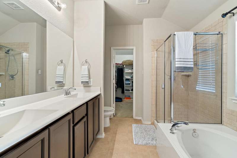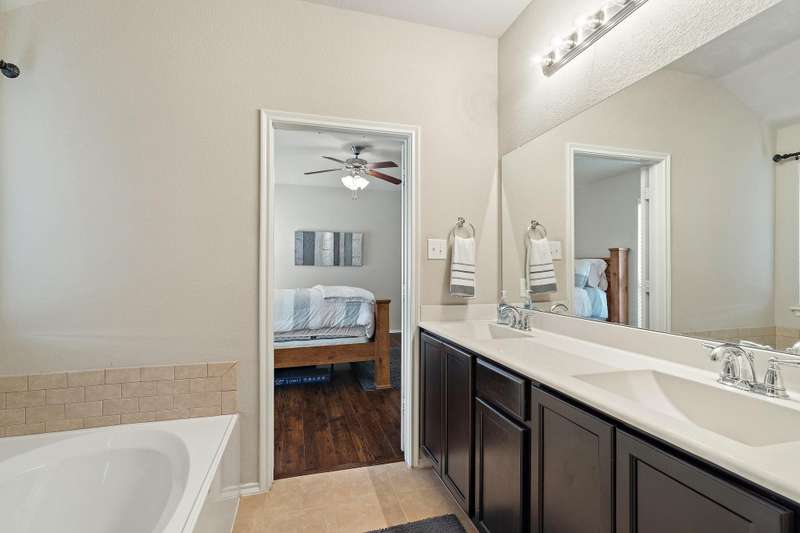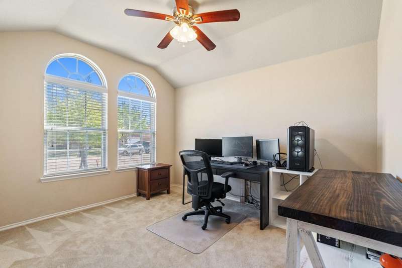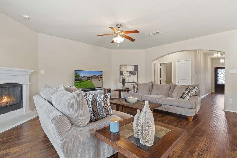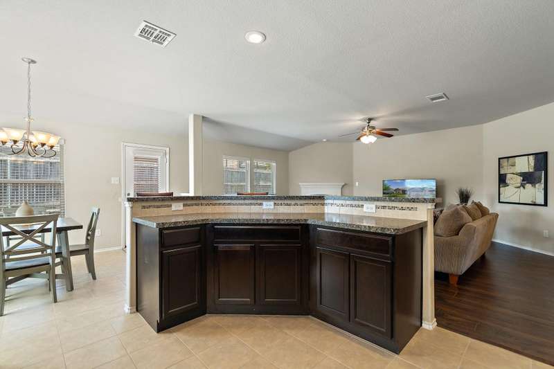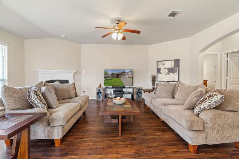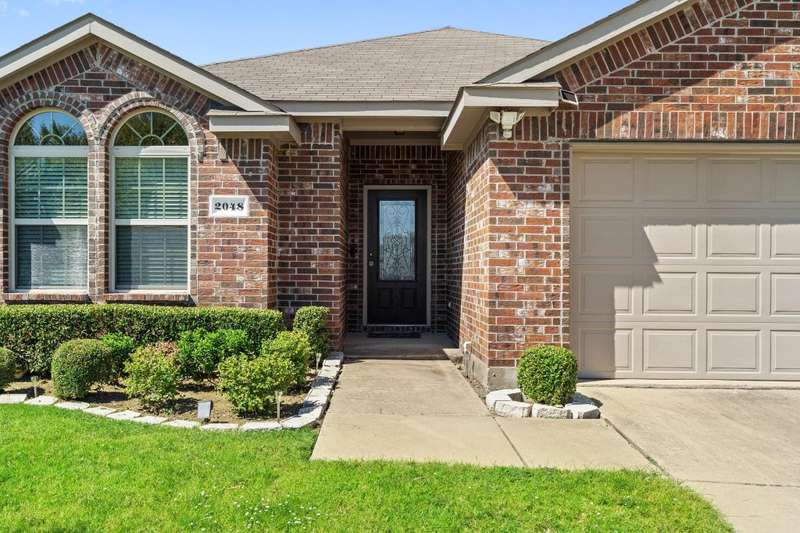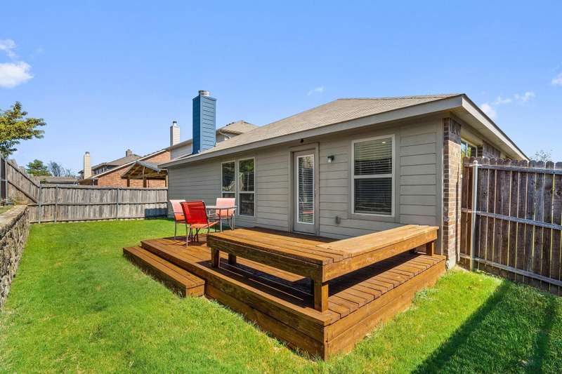 This well-maintained former model home in Princeton offers a single-story open floor plan with neutral colors, a kitchen featuring black appliances, breakfast bar, and dark cabinets, and a primary suite with laminate wood floors, dual sinks, separate tub and shower, and a spacious walk-in closet. A large wooden deck overlooks the fenced backyard, perfect for pets or play, and the home comes complete with a refrigerator, washer, and dryer. New carpet was installed in August 2025. Conveniently located near the community pool, playground, elementary school, shopping, dining, and major highways.