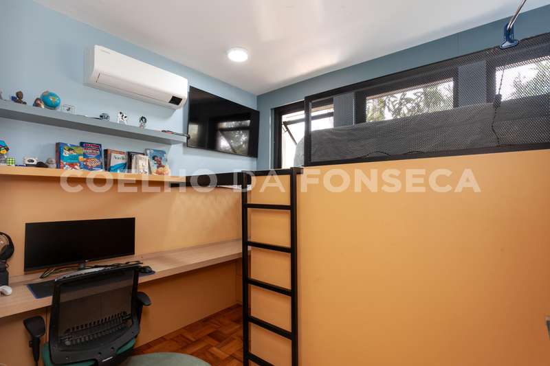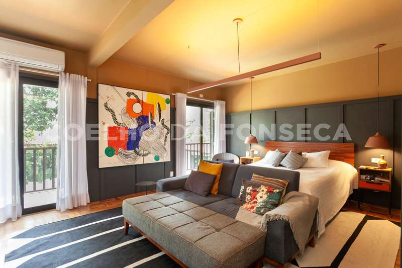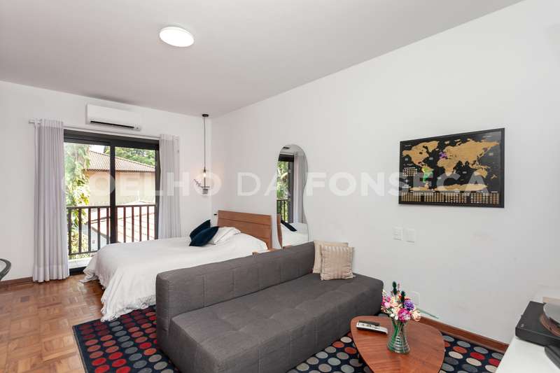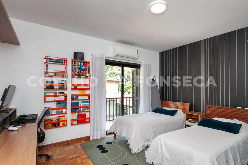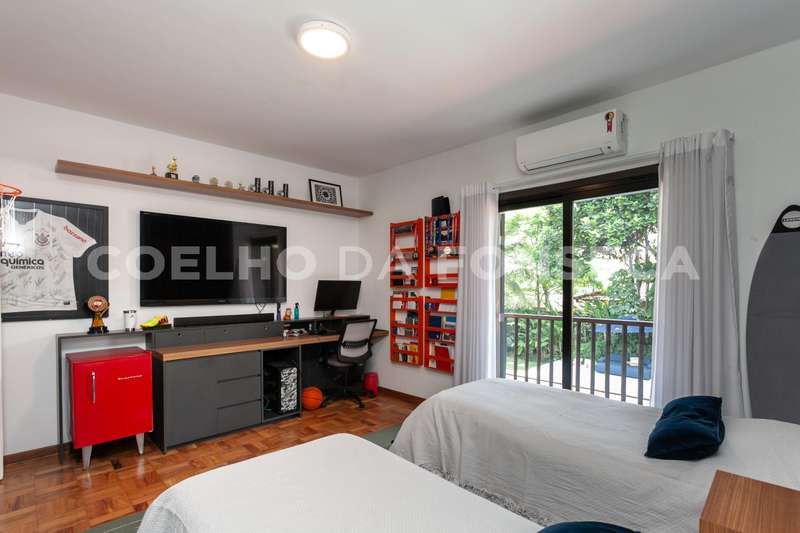 No andar superior, a área íntima é composta por 4 dormitórios, sendo 2 suítes. A suíte master é um destaque à parte: espaçosa, com banheiro senhor e senhora, um extenso closet, e um terraço privativo que oferece uma vista espetacular do jardim e da piscina. A segunda suíte também se destaca pelo tamanho generoso, assim como os outros quartos e banheiros, todos com piso de taco impecavelmente restaurado.\r\r\r