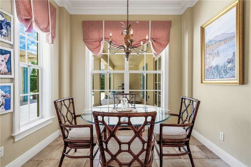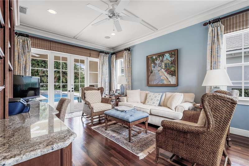 Meticulously maintained Hamilton plan traditional 3 bedroom+study on generous .38 acre super private cul-de-sac lot. Delightful SE exposure outdoor living space. Lush yard, lg heated pool/spa, covered lanais. First floor primary suite. Downstairs study with pool access bath. Updated kitchen opens to family rm. Dining rm overlooks courtyard. Living rm w/ wet bar and fireplace. Upstairs 2 en suite guest rooms open to gracious balcony. Rich detailing. Impact glass + shutters. Big laundry rm, 2 car garage. Fabulous Palm Island amenities- beach club, pier, pools, fitness. Dimensions approximate.