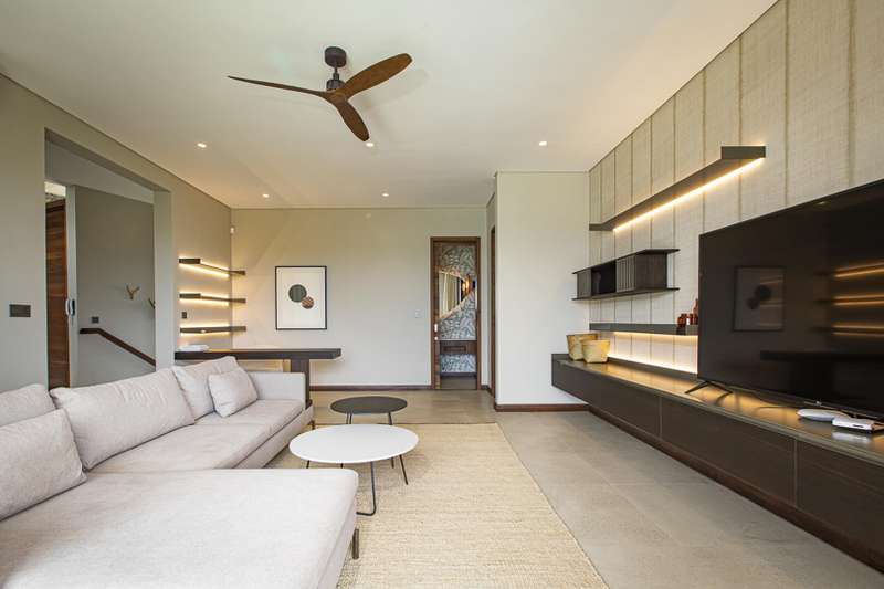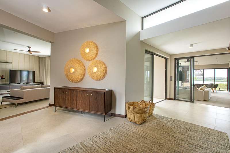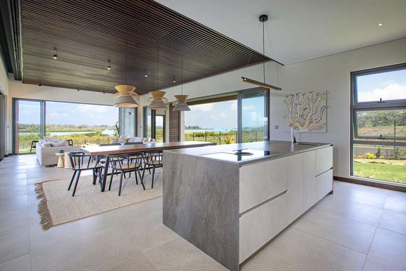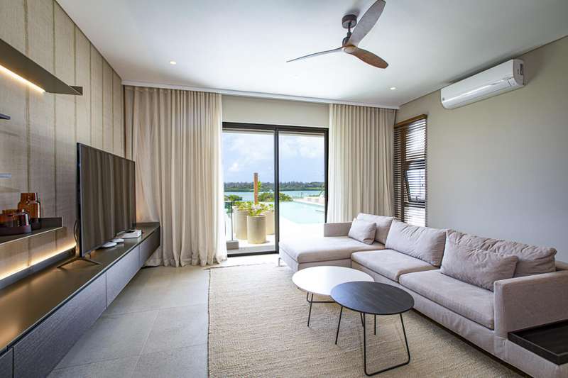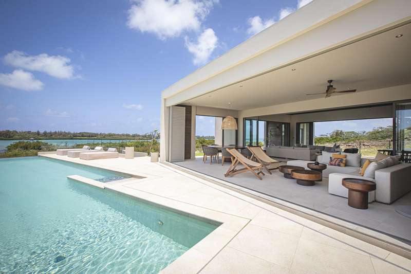 Perched gracefully on a generous 2,079 m² down-slope plot in the coveted Rive Est neighborhood of Anahita, this newly built 445 m² villa is a statement of refined island living. Nestled among the northern parcels and just moments from the lush tropical gardens of Rive Est Park, with its private pontoon offering effortless passage to the turquoise lagoon, the property embodies the very essence of exclusivity and sophistication. Every element of its architecture embraces the land’s natural contours, allowing each space to frame mesmerising vistas of the shimmering lagoon and the legendary Île aux Cerfs. On the upper level, sunlight dances across a bright, open living and dining area, where an elegant kitchen flows onto a wide terrace. Here, an infinity pool appears to melt into the horizon, while a barbecue and bar set the stage for effortless soirées. A stylish TV lounge with integrated office space and a generously proportioned en-suite bedroom complete this refined space. Descending to the garden level, three serene en-suite bedrooms open directly onto manicured tropical grounds, where the scent of frangipani drifts in the air. Discreet storage solutions ensure both practicality and elegance remain in perfect harmony. Infused with the charm of chic tropical décor and finished to the highest standards, this villa is more than a home—it is a gateway to Anahita’s celebrated coastal lifestyle, where each day is bathed in light, framed by sea, and defined by pure tranquility.