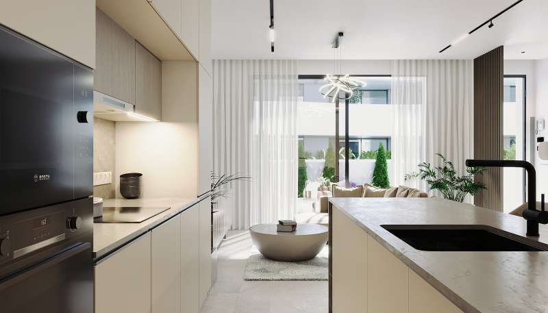 These elegant houses provide 145 m² of refined living space on a single level. The interiors feature a bright open-plan living room and dining area connected to a fully equipped modern kitchen with premium finishes. Large sliding doors open to the private terrace and garden, creating a seamless indoor-outdoor experience. The houses comprise 3 spacious bedrooms with built-in wardrobes and 2 contemporary bathrooms with walk-in showers and high-quality materials. Every house combines comfort, functionality, and a touch of Mediterranean elegance.