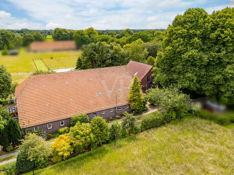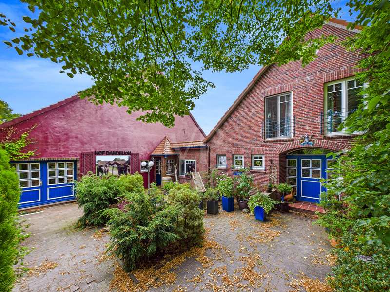Welcome to this unique country house in Wittmund/Ardorf, which is not only a home but also a paradise for horse lovers. Here, modern comfort and rural charm combine to create a harmonious whole. The country house-like property stands on a generous plot of approx. 31,290 m² and offers a living area of approx. 299 m² and a utility area of approx. 229 m². Built in 1965, the house has been extensively renovated over the last 20 years and is in a very well-kept condition. The quality of the fixtures and fittings can be classified as upmarket, with charm, style and attention to detail clearly evident. The entire property has a total of 8 rooms, including 5 bedrooms and 4 bathrooms. A special highlight is the vacation apartment or granny apartment, which can be used flexibly. A stylish fitted kitchen, a lounge, a utility room, a wine storage room, a pantry and a guest WC with shower round off the rooms on offer. The outdoor facilities offer numerous amenities such as a carport, parking spaces for 4-6 vehicles, a tack room, a stable with 9 horse boxes, a hay store, a stable WC and paddocks. The lovingly landscaped garden with fruit trees, several terraces, a summer garden and a veranda invites you to linger outdoors. The house also impresses with its charming character and generous plot of land. Your horses will find plenty of space to run around and graze on the extensive grounds. Loving horse husbandry is guaranteed here. Whether in the pasture, in the stables or in the riding arena - here you can look after your horses with loving care. Imagine walking across the green meadows with your beloved horse in the morning. The smell of fresh hay and the neighing of the horses accompany you on your way. Here you can live out your passion for horses to the full. This property also offers you a wide range of possible uses, as it consists of two residential units. Whether as a spacious family home or as a combination of living and working - here you have space for your individual needs. The spacious rooms are ideal as an office, studio or practice. Work with a view of the green meadows and be inspired by the inspiring surroundings. Overall, the property offers a wide range of possible uses and is ideal for families with horses who are looking for plenty of space and nature. The rural surroundings and extensive green spaces offer an idyllic ambience to relax and enjoy. Please do not hesitate to contact me for further information or a viewing. A further exposé with more pictures and details is also available. Simply contact me - I look forward to hearing from you!