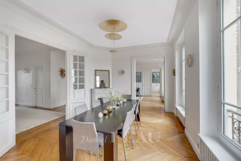 This magnificent east and west facing apartment with a balcony is on the 3rd floor of a recently refaced late 19th century building with a lift. Offering 271 sqm of floor space and 266 sqm of living space as defined by the Carrez Law, it includes a spacious entrance hall with a security door, a living/reception room, dining room and library featuring 3.20 metre high ceilings with mouldings, a fitted kitchen with dining facilities and a pantry (also accessed by means of the service staircase), four spacious bedrooms, two bathrooms and two shower rooms. Superb period features include Herringbone parquet flooring, high ceilings with mouldings, and marble fireplaces. The apartment is particularly bright and benefits from no directly facing neighbours. Individual heating. Residents benefit from access to a shared garden. In a sought-after residential neighbourhood a 10-minute walk from Versailles Rive Droite station, 15 minutes from Place du Marché and rue de la Paroisse and the shops and restaurants, and 4 minutes from St Jean Hulst High School. Easy A13 and A86 motorway access.