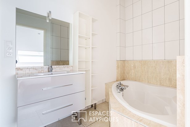 The entrance, located on the second floor, sets the tone. A vast open-plan living space is bathed in light, where the living room and dining room are centered around an elegant staircase, highlighted by a metal railing. The high ceilings are highlighted by exposed IPN beams and a stone wall that provides visual consistency across both levels. The semi-open kitchen, carefully designed and equipped, blends seamlessly into this space, benefiting from numerous roof openings for optimal light. The upper floor is dedicated to privacy and comfort: three bedrooms, each offering a unique, bright and intimate atmosphere, with their own bathroom or shower room, ensuring total independence. The highlight of this airy space is the net suspended above the living room, creating an unusual reading corner. Comfort is ensured by full air conditioning.