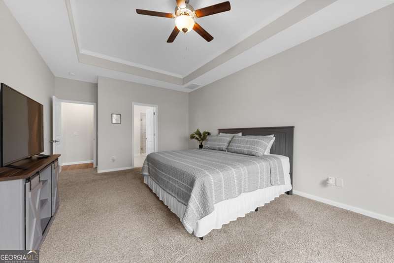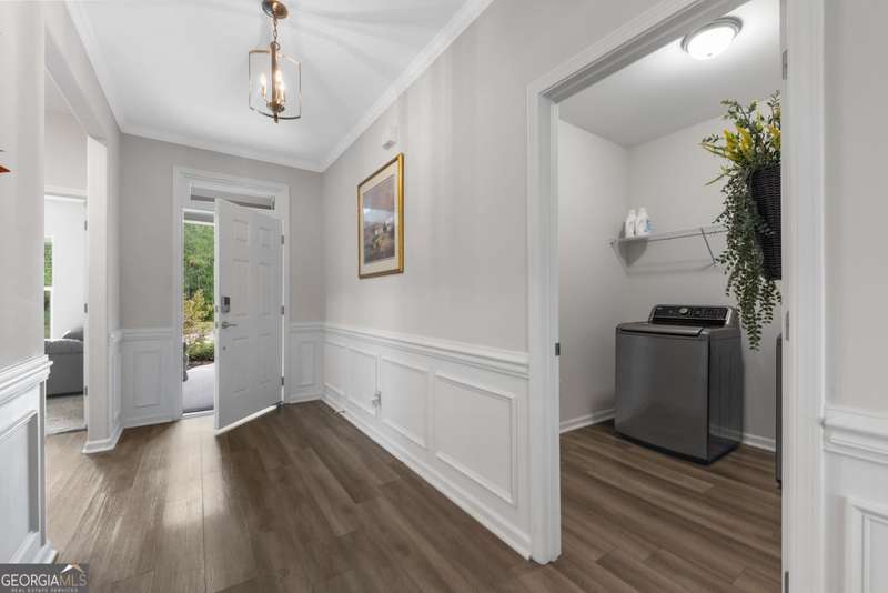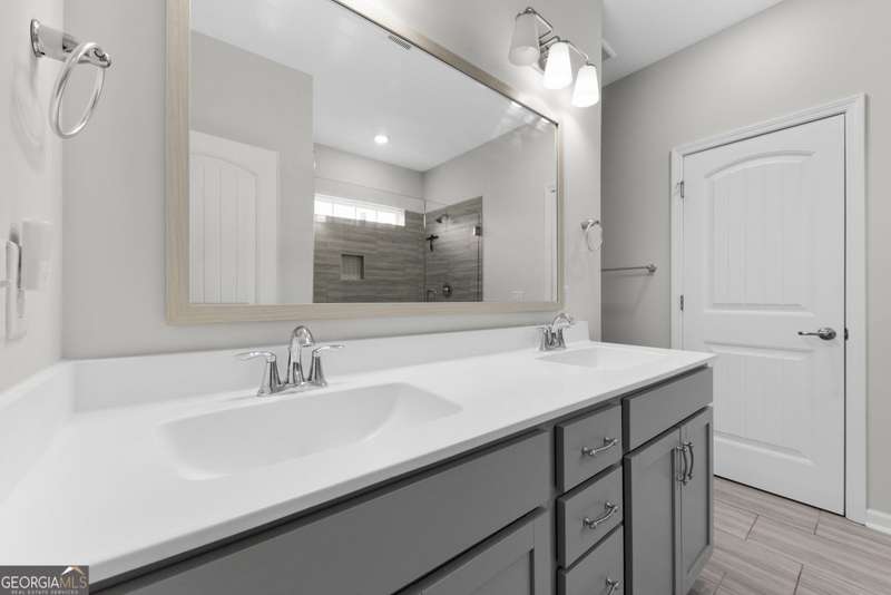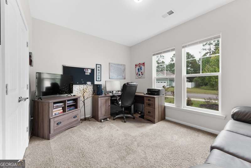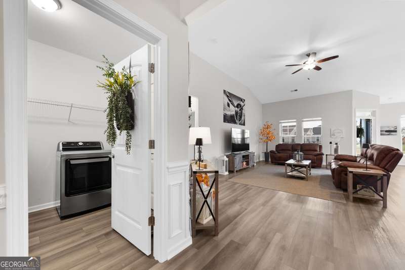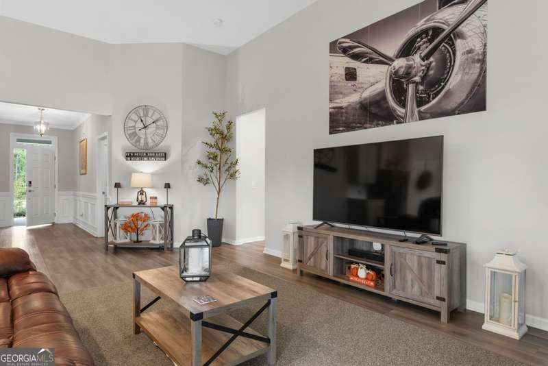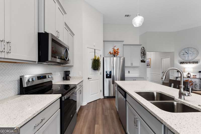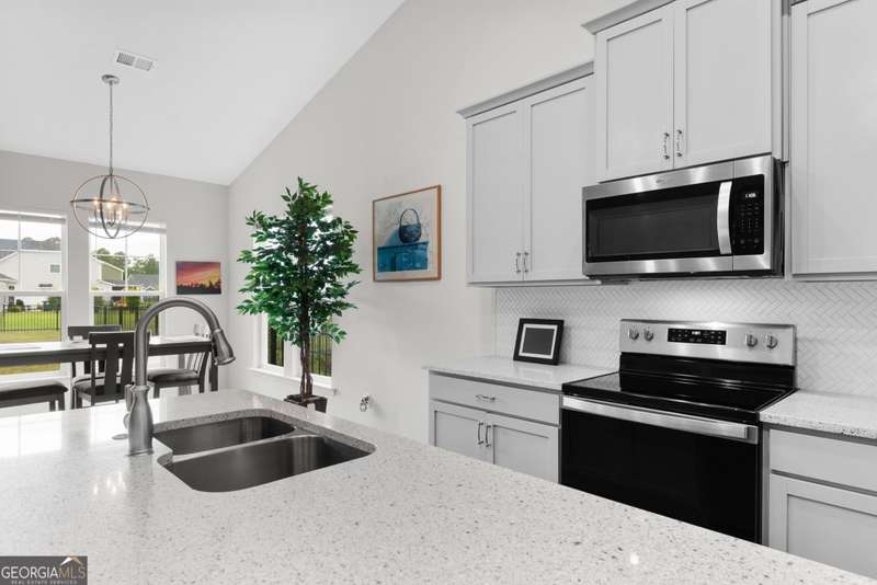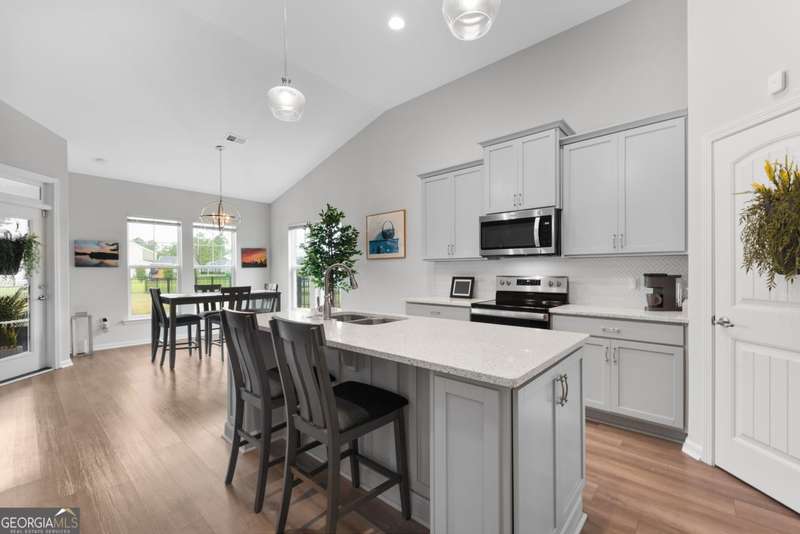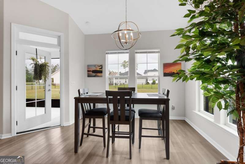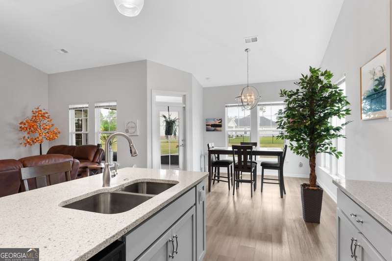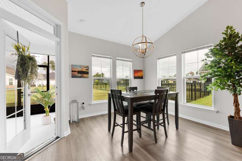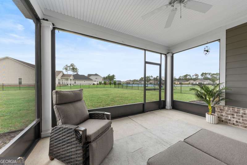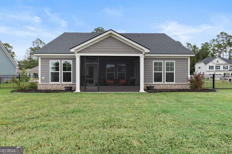 This one is a stunner! Immaculately maintained one-level 3-bedroom, 2-bath home: Beautiful brick facade, hardy wood planking, large level, fenced yard. Step inside and be greeted by a bright, airy great room with cathedral ceilings and an open design that's perfect for entertaining. You will love the easy flow from the living area to the covered patio, creating the ideal indoor-outdoor lifestyle. Upgrades include backyard fencing, a screened lanai, a Ring doorbell, and a camera. Great for pets and parties. The smartly designed kitchen connects to a spacious dining area and also features granite countertops, 42-inch cabinets, stainless steel appliances, and ample prep space. Everything a home chef needs. Enjoy the beauty of modern wood-look vinyl plank flooring in the common areas, with cozy carpet in the bedrooms. This thoughtful split floor plan ensures privacy for the primary suite, which includes a luxurious bath with double vanities. The Master Bedroom also has access to the enclosed patio. Finished 2-car garage. Fully sodded yard with irrigation. This home truly has it all: style, comfort, and convenience. It's a must-see for your dream home shortlist! Low HOA fees include lawn care and lawn treatments.