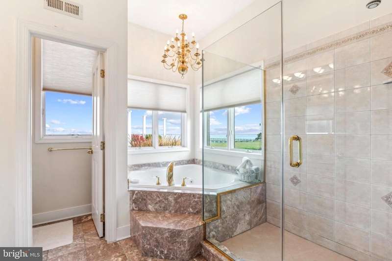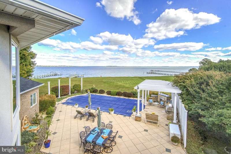 An impressive open two-story foyer welcomes you to this custom 4 BR, 3.5BA waterfront residence on 1.9 acres boasting an enchanting open space floorplan. A first floor Ensuite BR has a walk-in closet plus a separate jacuzzi and shower in the updated full bath. The sumptuous approximately 39'X26' Primary Suite with a large sitting room area offers front and rear balconies specifically designed by the Architect to enjoy the breathtaking sunrises, moonrises & sunsets lighting the Bay with bright pink and orange skies and brilliantly lit sparkling water. This second floor Primary Suite has a Cathedral ceiling, a 3-sided gas fireplace and a fully renovated Coastal style bath which includes a luxurious remote controlled floating Air Spa tub. Also upstairs is a large loft accessed by French doors boasting custom built-ins and extraordinary extensive water views overlooking the Bay and Pool. Walls of windows throughout the residence provide abundant natural light and endless broad views of Crab Alley Bay from almost every room. The Gourmand's Kitchen with its solid custom maple cabinetry is furnished with a Subzero refrigerator, double wall oven with Smart features, auto purified cold water spigot at the sink along with a 5-burner gas cooktop. A Subzero wine fridge is located in the island by the Dining Room for easy entertaining. The hardwood flooring is Canadian White Maple. A freestanding curved White Maple staircase enhances the beauty of the very generously sized 2-story Foyer. A two-story Great Room features a 2-sided gas FP and a custom wet bar that both open to a vast Morning Room area and seating space. Formal separate Dining and Living Rooms are open via knee-walls with columns for romantic dining and entertaining. The level outdoor living space includes a lighted inground 36x18' pool, a Pergola and a stone hardscape with a built-in Grill, outdoor rated refrigerator and a built-in gas fireplace for chilly waterfront evenings outdoors. Plentiful terracing affords a breathtaking, serene setting to relax and entertain friends and family while taking in the extraordinary and expansive water views. There is a private pier, a 3-car garage with built-in overhead storage and a driveway that can accommodate several more cars and there are multiple landscaping berms. The home has a whole house sound system & whole house attic fan. The cooking, 3 fireplaces and 3 zone HVAC are propane. The community of Southwind is a waterfront peninsula surrounding 97 custom homes and offering a waterfront Clubhouse, Tennis Court, walking trails along the Bay, a Boat Launch and a gated boat storage area. Welcome home to your year-round vacation! Furniture negotiable