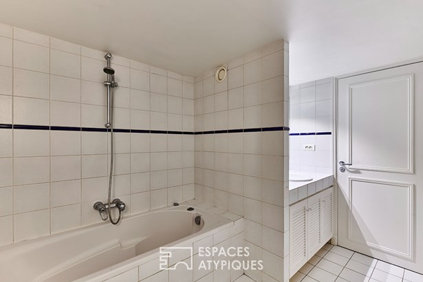 On the second floor, accessible by elevator, the apartment opens onto a vast entrance leading to a living space of nearly 60 sqm, enhanced by three elegant wood-clad columns and a large workshop glass roof, both overhead and on the facade.