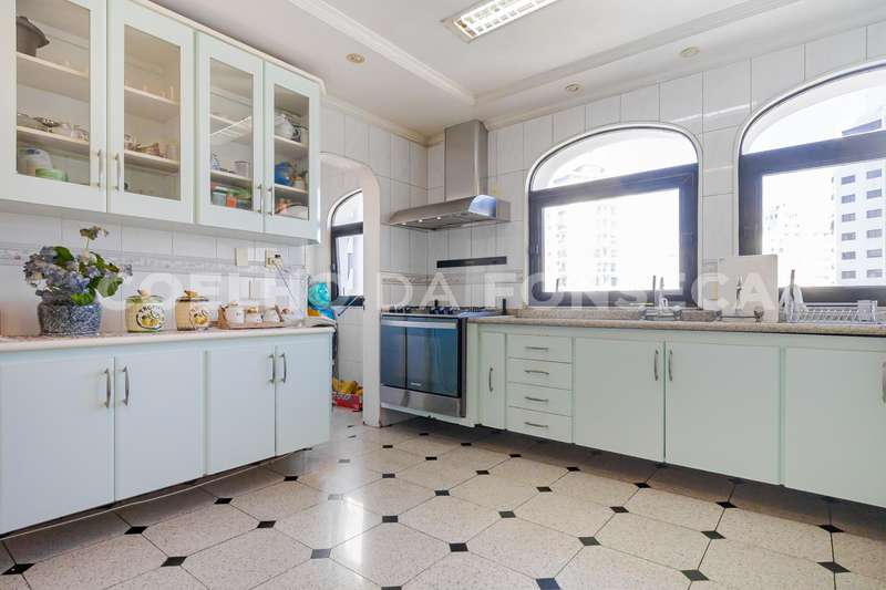 O escritório, com sua charmosa varanda e vista deslumbrante também para o Vale do Pacaembu, é um espaço sereno e bem iluminado, ideal para trabalho remoto ou estudos. Além disso, há um segundo escritório na área de serviço. A cozinha ampla é equipada com armários embutidos e eletrodomésticos de alta qualidade. O imóvel inclui ainda dois dormitórios de empregada, cinco vagas de garagem e um depósito, garantindo conforto e funcionalidade.