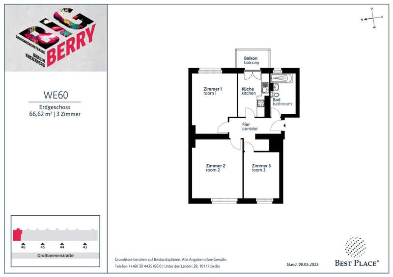 Your investment in the centre of trendy Kreuzberg: with this efficiently designed 3-room flat, you are investing where young people, professionals and families want to live. The flat with approx. 70 m² is located on the ground floor of the six-storey residential building. It has a lovely balcony facing east towards the inner garden courtyard. The bathtub in the bathroom provides a wellness feeling. The practical layout and size of the flat make it ideal for families and couples. Our sought-after investment project Big Berry offers investors solid rented flats in one of Berlin's most sought-after neighbourhoods. The six-storey residential building with four storeys was built in the 1950s and a new top floor was added in 2023. It has 76 flats with one to four rooms and approx. 26 to 108 m². A lift was added as part of the loft extension, which also benefits the existing flats. Big Berry also includes an idyllic garden courtyard and 17 car parking spaces.