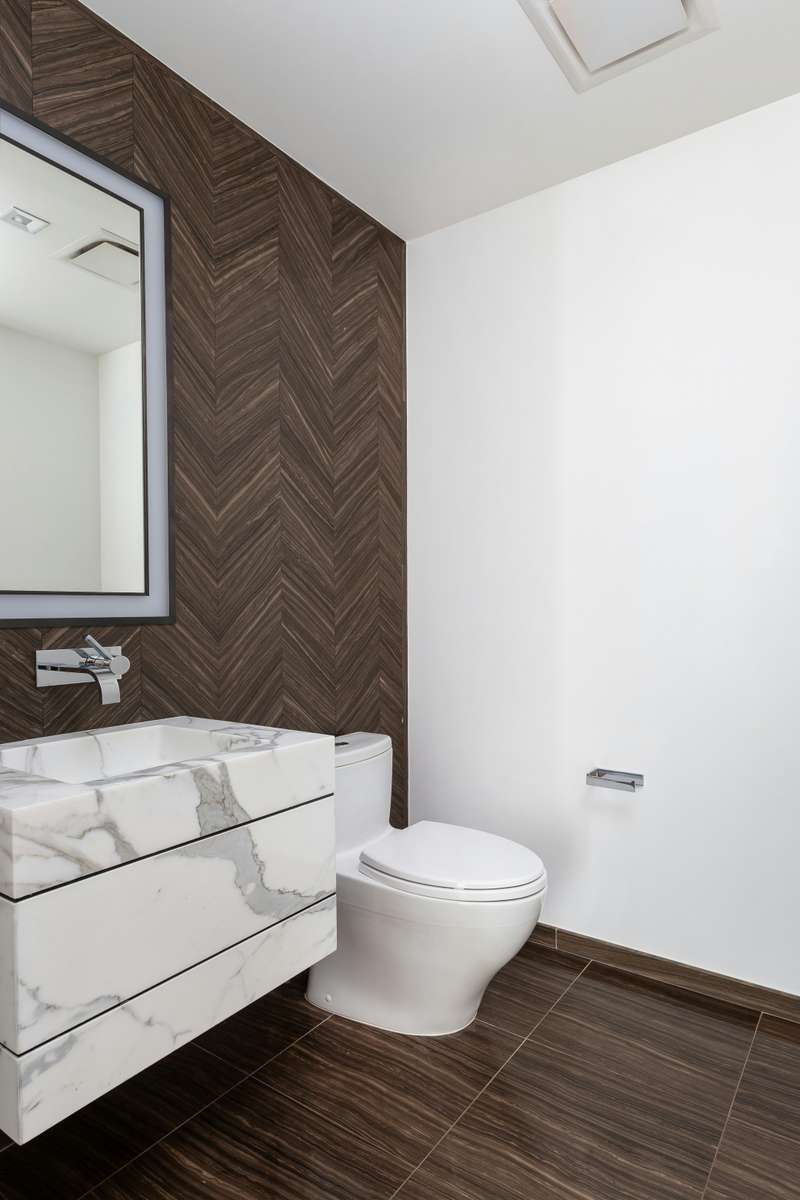The secondary bedroom has an en-suite bathroom with Opal white marble floors and walls, oak vanity Lacava countertop, and Dornbracht fixtures.