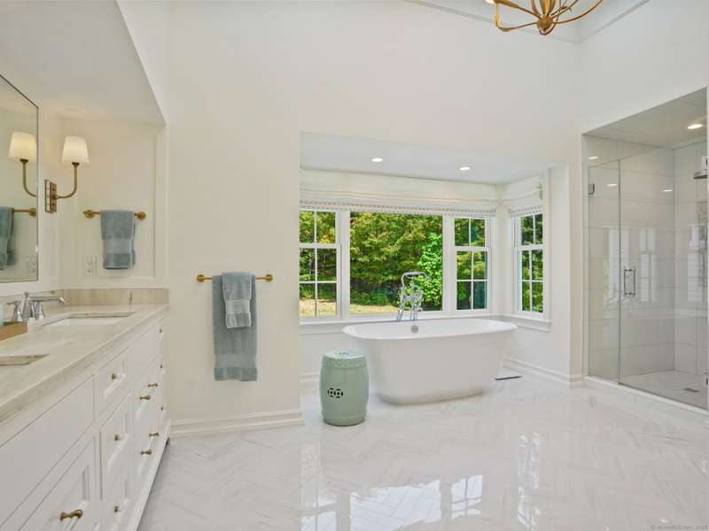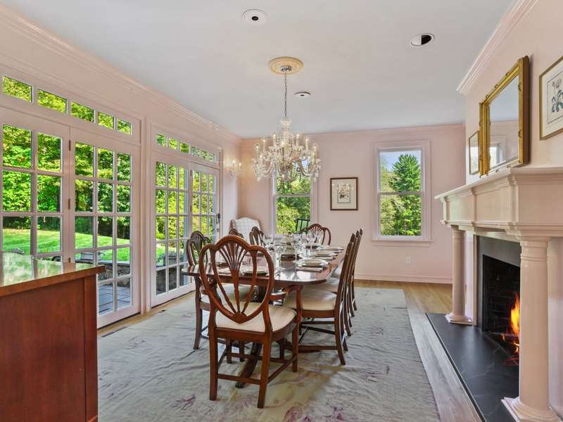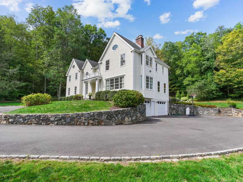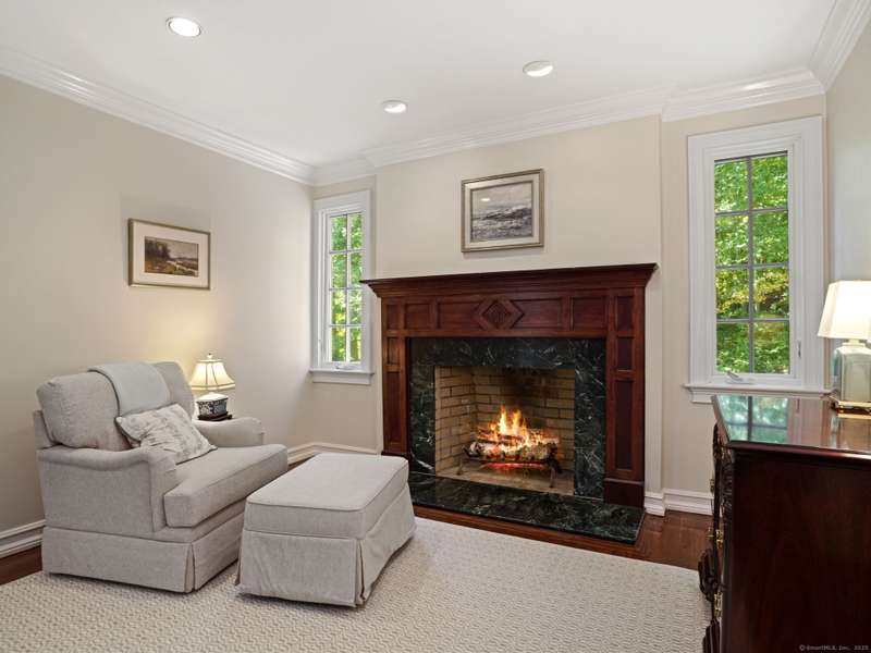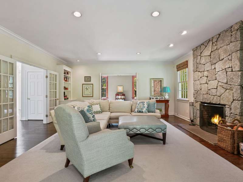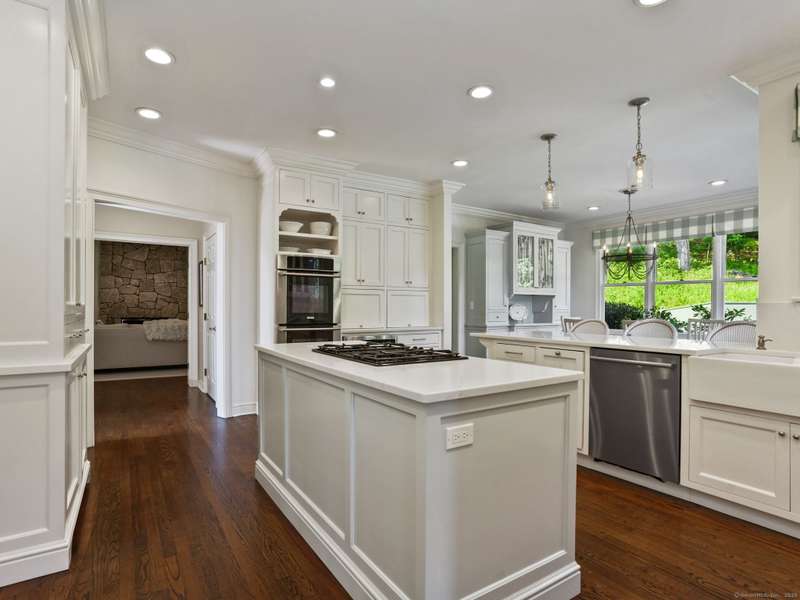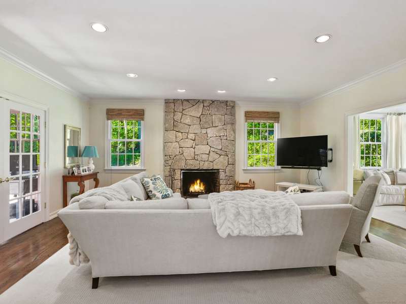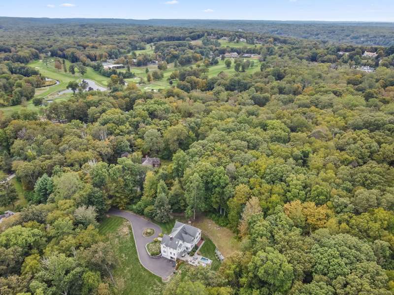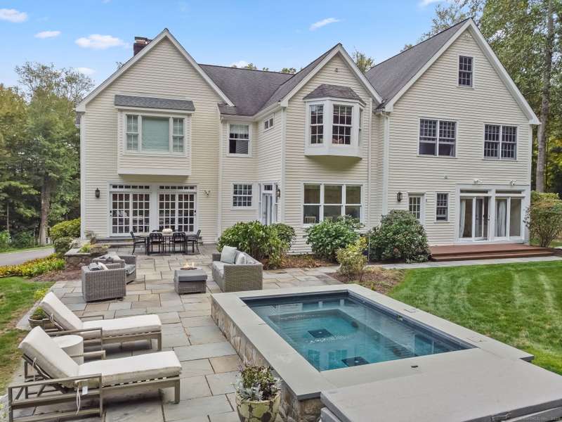 Exceptional 6 bedroom colonial with custom 12-person spa in a private, tranquil setting. Make your way past the 4th hole of Aspetuck Valley CC then turn down the driveway. Pass classic stone pillars as you arrive at this elegant oasis. Be wowed by the timeless curb appeal & extensive masonry. Light streams in through the 2-story window in the welcoming foyer. The formal living & dining rooms share an impressive back-to-back fireplace as well as walls of windows & French doors. The gourmet kitchen is a show-stopper featuring inset custom cabinetry, top-of-the-line appliances, quartz tops, 2 drink drawers, & endless storage. Gather by the stone hearth in the family room or relax in the sunny back den (w/ full bath). Work from home in the handsome front office with its built-in bookshelf wall. Very practical mud/laundry room & charming half bath complete the main level. Head out back through one of the many French doors and spend hours all year round on the elegant bluestone patio sitting