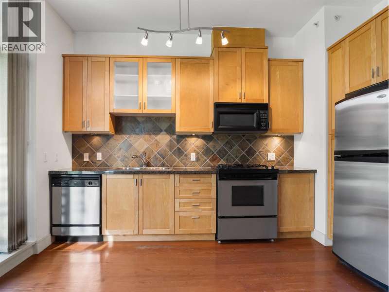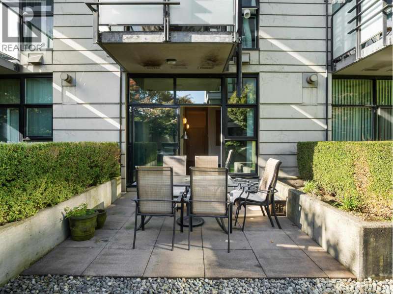 ATTN PET LOVERS! This super pet-friendly building allows up to three small dogs or two large dogs or three cats. The open concept features a half wall between the living area and the bedroom area which, combined with the high ceilings, creates an expansive feel. The living area has a freestanding gas fireplace with sliding doors to a 131 sq. ft. patio situated in the secure inner courtyard of the complex. The kitchen has space for a dining table, lots of cabinet space, stainless steel appliances and gas range. The unit features a walk-in closet, a small den/storage area, plus in-suite laundry. Building also has a large exercise room. Close to great shops in Marpole and Cambie Skytrain. Parking / storage. (id:58403)