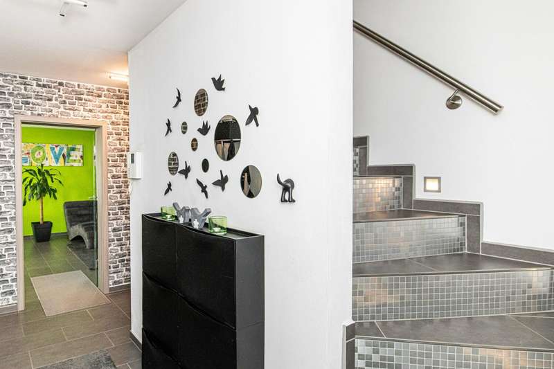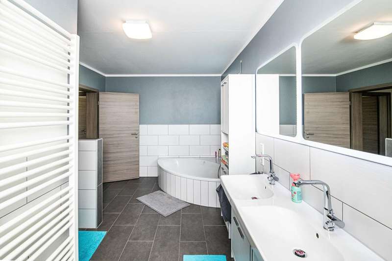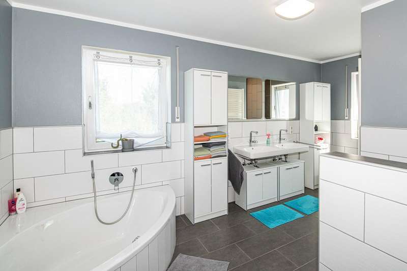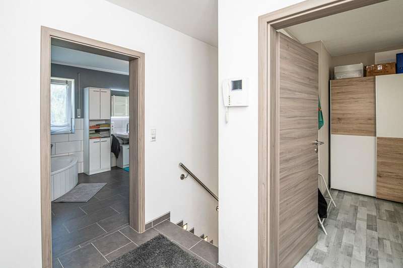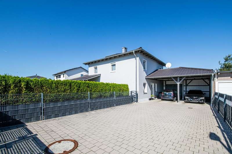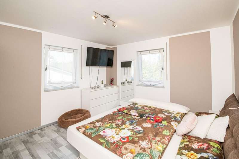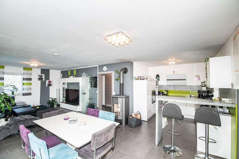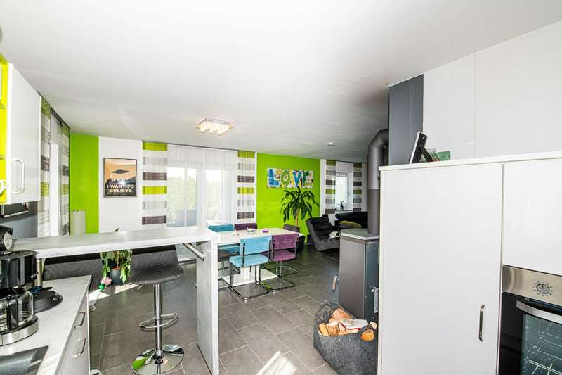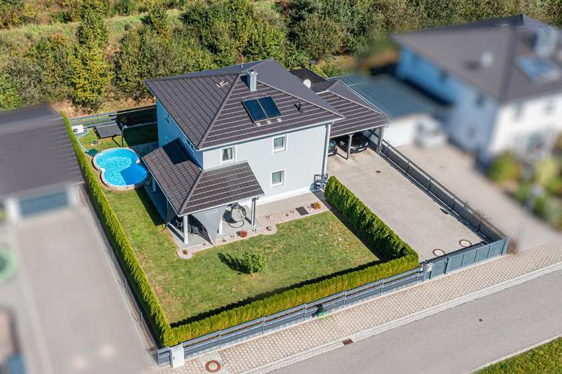 Welcome to this attractive detached house, which was built in 2014 on a plot of approx. 596 m². With a living area of around 134 m², this property offers plenty of space for families or couples who value space and a well-thought-out layout. There are four rooms in total, including three bedrooms and a large dining/living and cooking area of around 42 m². Upon entering the house, you are greeted by a spacious entrance and hallway area, from which you can access the open-plan living and dining area with kitchen through a glass door. This area is complemented by a Swedish stove, which promises a cozy warmth, especially on cooler days. The sophisticated fitted kitchen is open to the dining and living area. It has high-quality electrical appliances as well as plenty of work surfaces, storage space and a small counter with 2 bar stools for a quick breakfast - a real centerpiece for cooking together and sociable evenings. A utility room and separate technical room are located on this floor, along with a guest WC. Upstairs, three well-designed bedrooms offer a variety of uses - whether as a retreat, children's room or home office. The bathroom is generously proportioned and equipped with a double washbasin, a corner bath, a shower and a WC. The outdoor area is a particular highlight: the low-maintenance garden invites you to recharge your batteries in the greenery, spend convivial barbecue evenings or take a refreshing dip in the heated pool on hot summer days. A balcony power station enables environmentally friendly energy generation and reduces operating costs. Hobby gardeners and DIY enthusiasts have also been catered for: a tool shed behind the carport creates additional storage space for garden tools and bicycles. The building technology is impressive with an advanced combination of gas central heating with underfloor heating and a solar thermal system on the roof. This ensures a sustainable supply of heat and hot water, supported by the Swedish stove in the living area. The fixtures and fittings meet a contemporary standard that promises a pleasant quality of living. In summary, this house offers a successful combination of living comfort, a functional floor plan and modern technology. With a heated outdoor pool, a high-quality fitted kitchen and energy-efficient systems, it is ideally equipped for a contemporary living experience. You are welcome to take a virtual tour to get an impression in advance. Contact us - we are available for further information or a personal viewing appointment. On request, you can view this property in advance in a 360-degree panoramic tour - from the comfort of your own home!