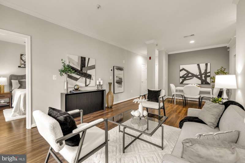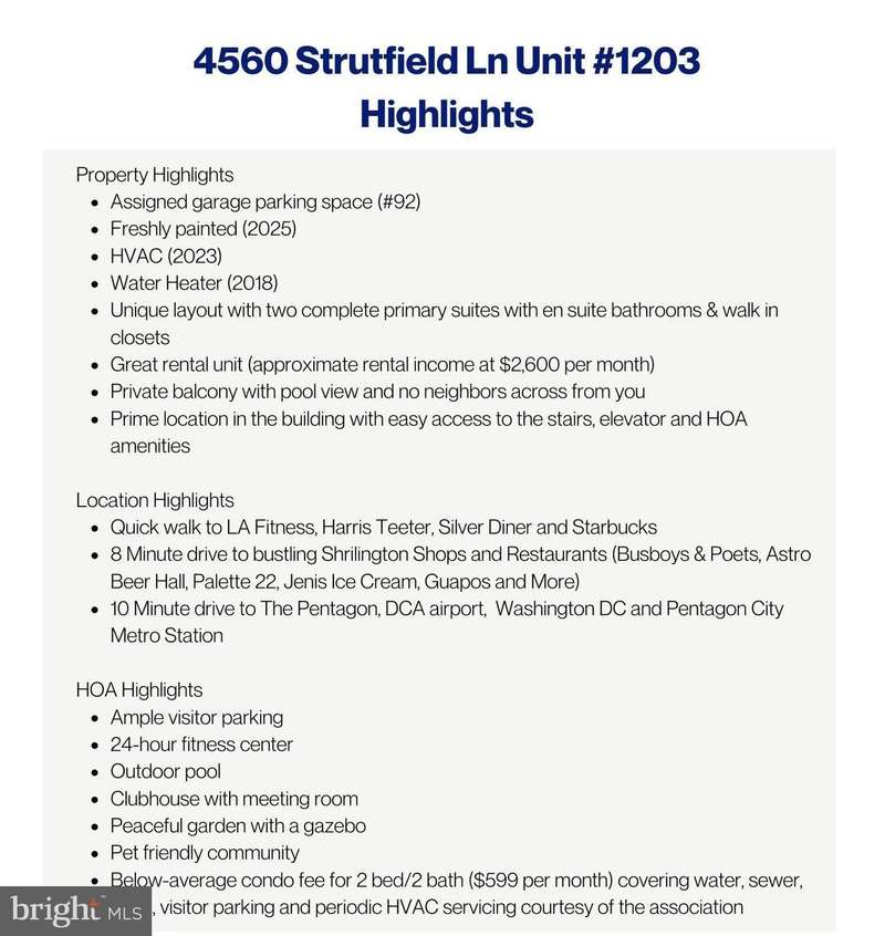 Welcome Home! This 2 bedroom residence is truly everything you are searching for featuring 2 full bathrooms, garage parking, washer dryer in-unit, spacious outdoor space, and well-appointed amenities, all within 10 minutes of Shirlington shops and restaurants. What makes this unit stand out? This meticulously maintained condo features fresh neutral paint, private oversized covered balcony, crown molding, upgraded kitchen backsplash, new thermostat and a highly functional layout. The floor plan was thoughtfully designed with an expansive kitchen with breakfast bar, designated dining area, large bright living room that flows out to the balcony and 2 complete primary suites. The gourmet kitchen boasts granite countertops, ample cabinet space, stainless-steel appliances, designer backsplash and open-layout to the dining area. Both bedrooms feature floor to ceiling windows, walk-in closets and full en-suite bathrooms. High value improvements in the last few years include fresh paint, new HVAC (2023) and new Water Heater (2018). What makes this community stand out? Enjoy the convenience of fantastic amenities including visitor parking, a 24-hour fitness center, outdoor pool, clubhouse, meeting room, and a peaceful garden with a gazebo. This is a pet-friendly and warm welcoming community with a condo fee ($599 /month) covering water, sewer, trash, garage parking spot #92 and visitor parking pass. What makes this location stand out? Ideally situated on the Arlington/Alexandria line, just off I-395 at King Street, The Palazzo offers unbeatable access to DC, the Pentagon, Amazon HQ2, Old Town, Shirlington, Reagan National Airport, shopping, dining, parks, trails, and more. *Rare opportunity to purchase a property below the tax assessed value!* Open House this weekend Saturday Oct 11th, 12pm-2pm