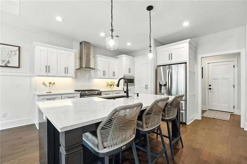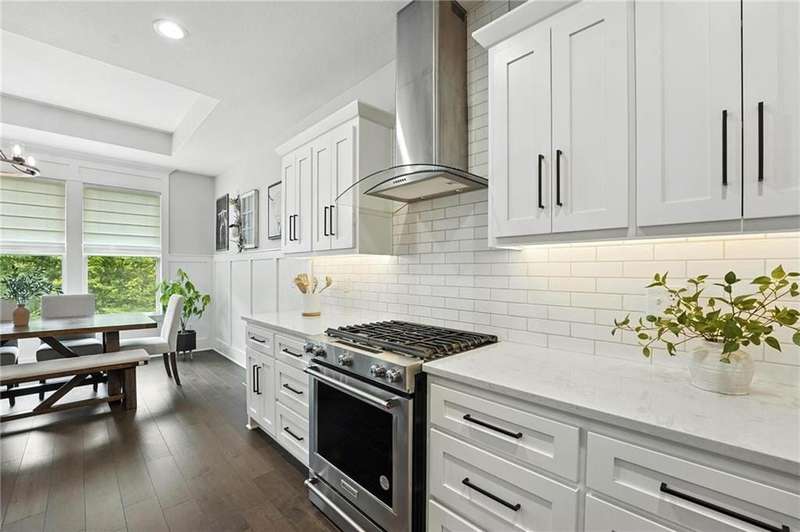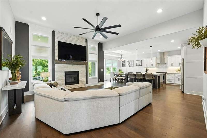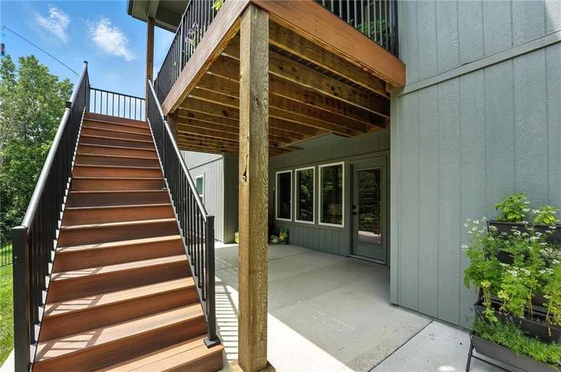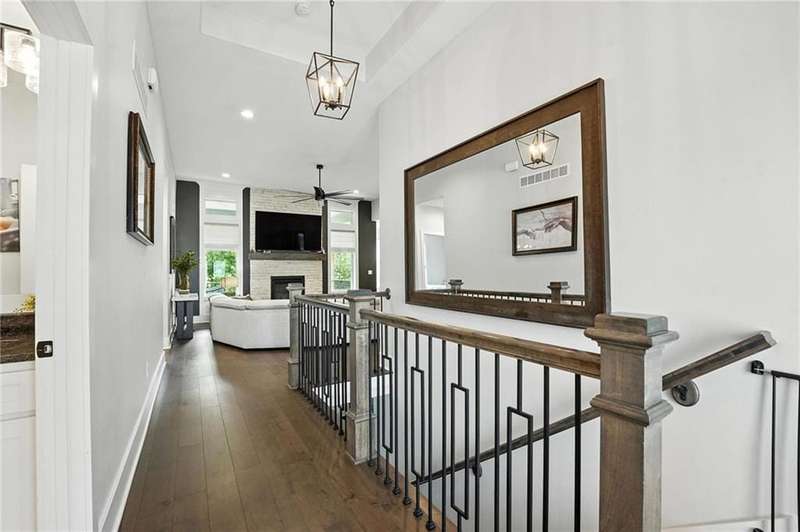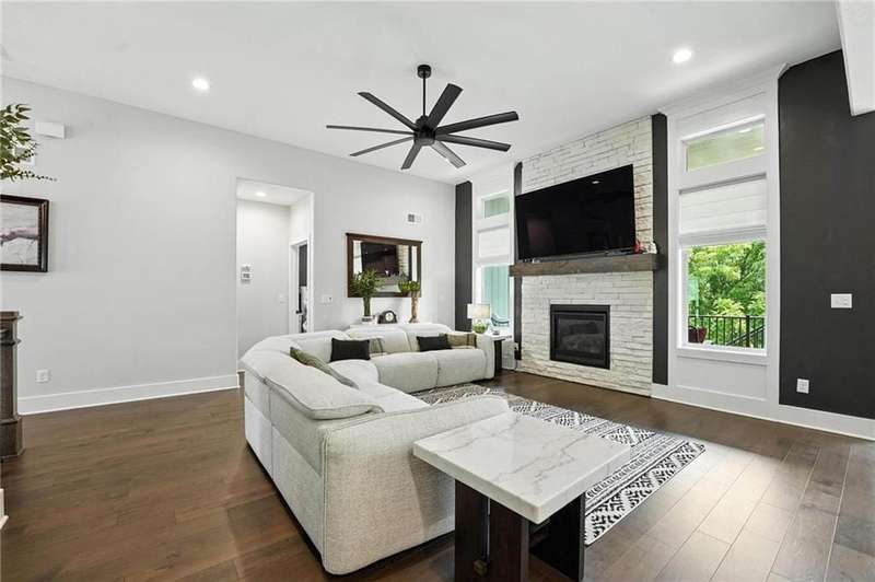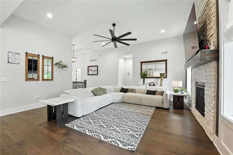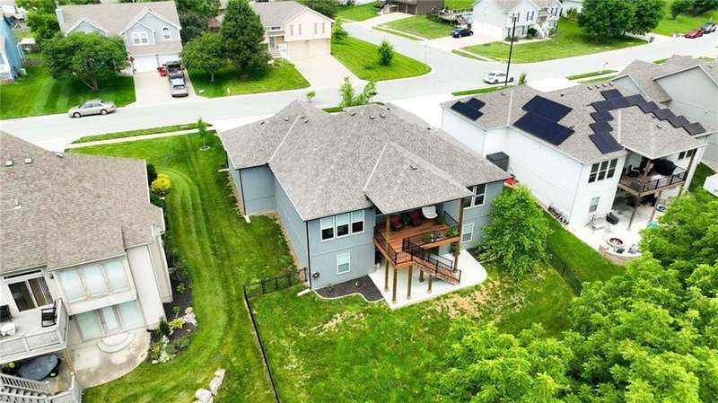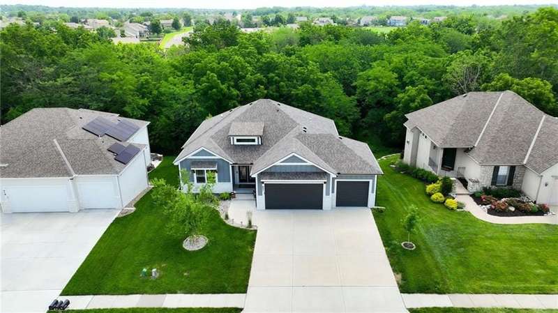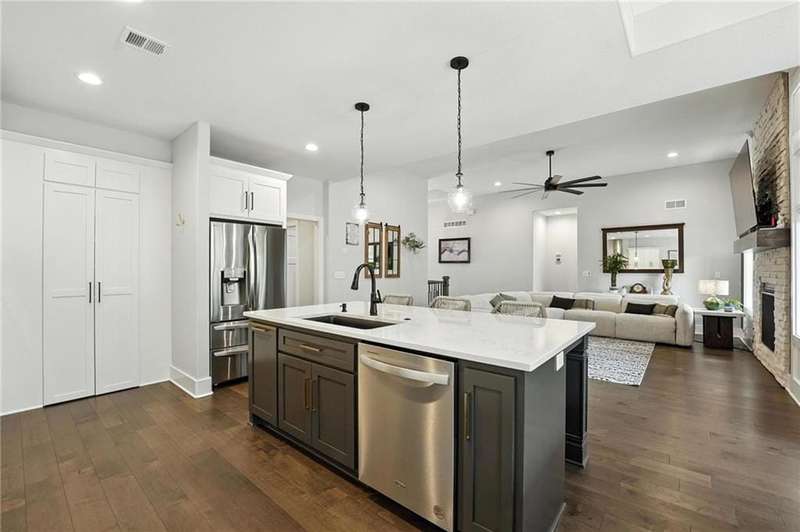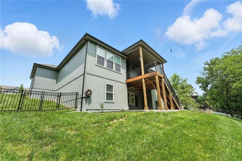 Welcome to this beautifully designed Reverse 1.5 Story home offering 4 bedrooms, 3 full bathrooms, and over 3,150 square feet of living space. Thoughtfully built for comfort and entertainment. Step inside to find a stunning kitchen with hardwood floors, a gas range, quartz countertops, soft close cabinets, and a walk-in pantry with built in appliance station. The main living area impresses with 9ft ceilings and a stunning stone fireplace, creating a warm and inviting centerpiece. Large laundry room on the main level with additional cabinet storage. All bathrooms are upgraded with sleek granite countertops and tile flooring, adding a touch of luxury throughout the home. Downstairs, enjoy a massive living area perfect for movie nights or hosting friends, complete with a granite-topped wet bar and a built-in mini fridge. This property backs up to green space offering plenty of privacy. View the backyard from the covered deck overlooking a fully fenced yard or enter out the walk-out basement that opens to a private patio retreat. The deep 3 car garage offers ample space for storage or large vehicles. Beautiful landscaping with gorgeous river rock for low maintenance flower beds. Dont miss your chance to own this versatile and elegant homeperfectly blending everyday functionality with standout features for entertaining.