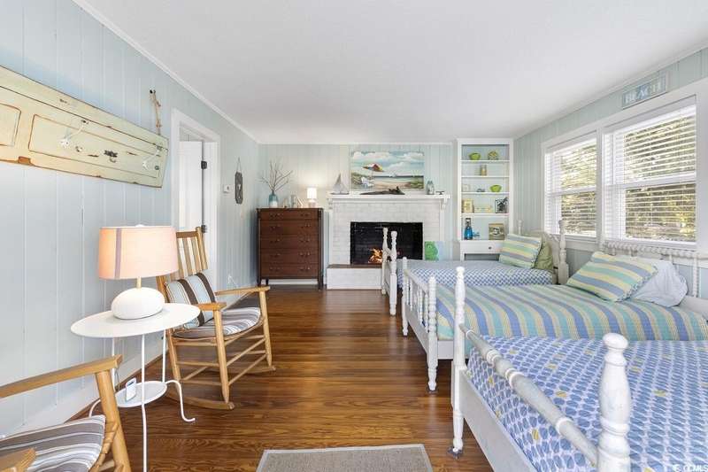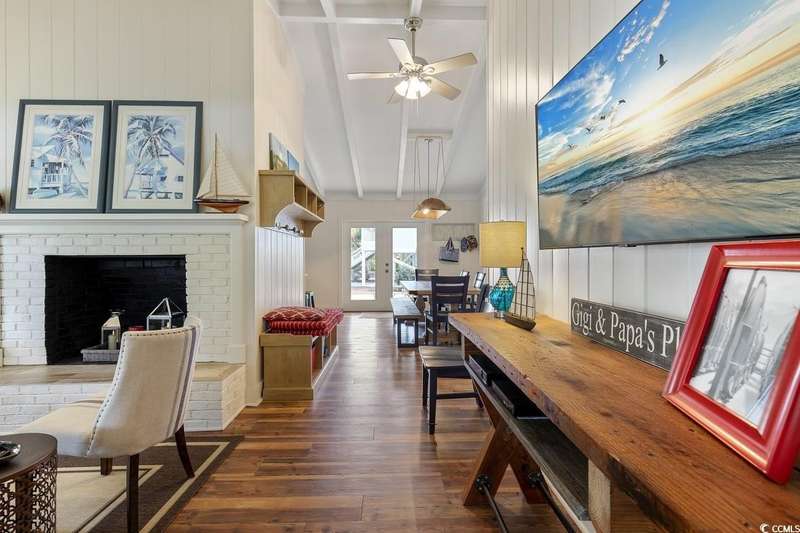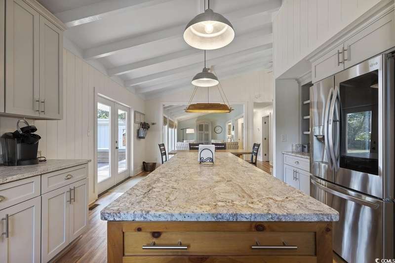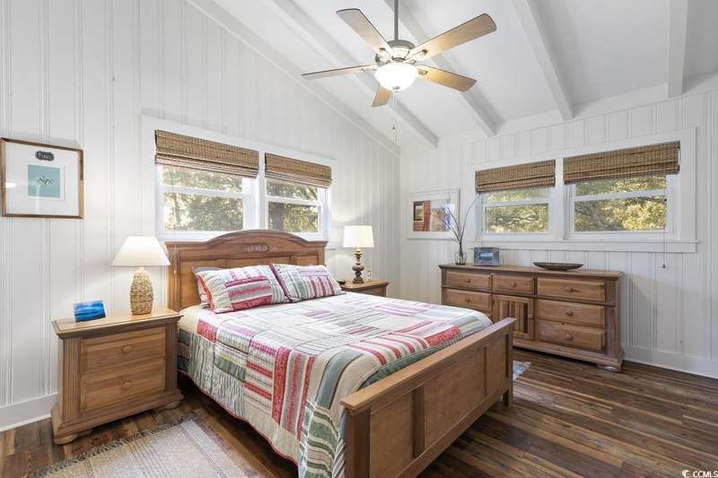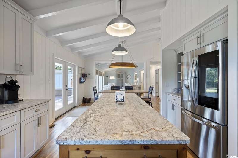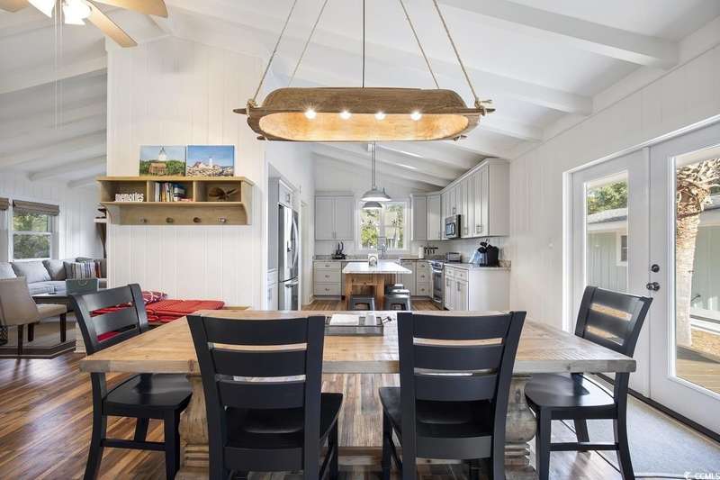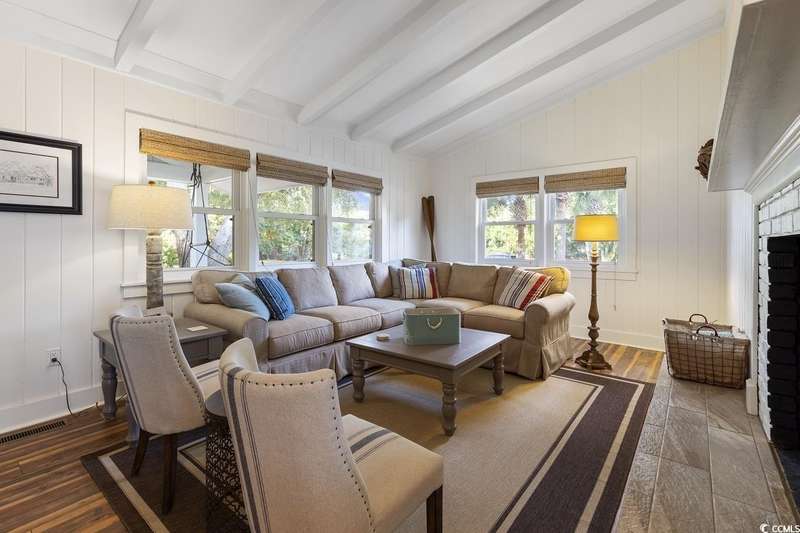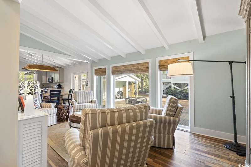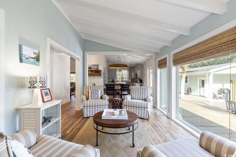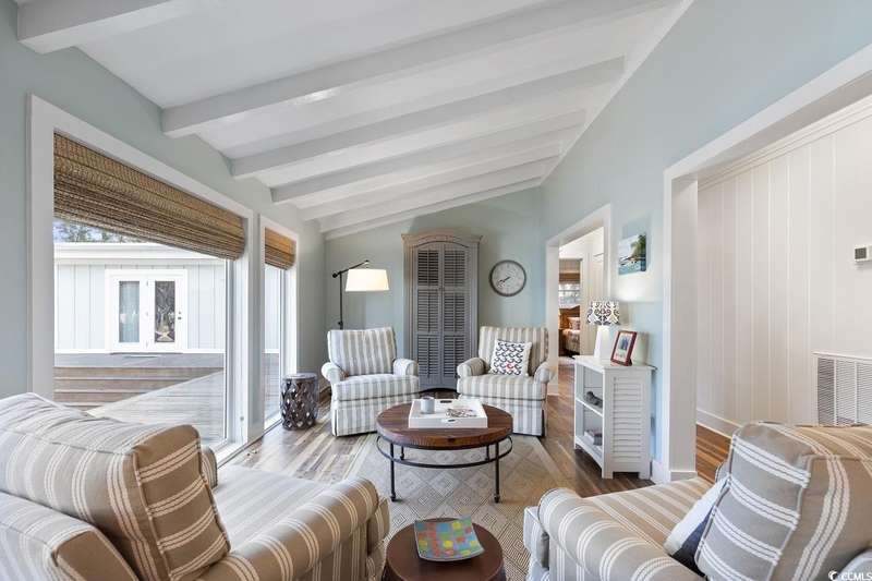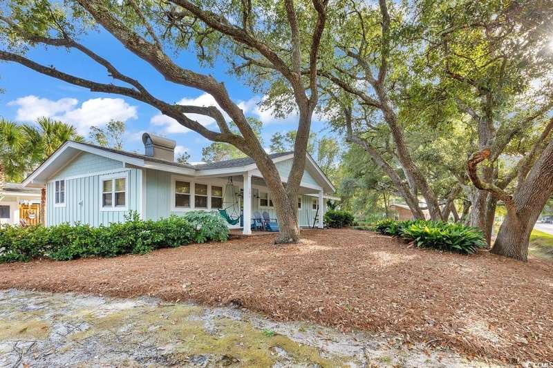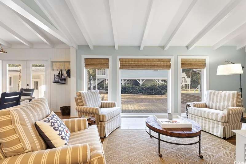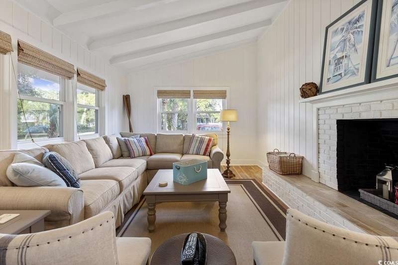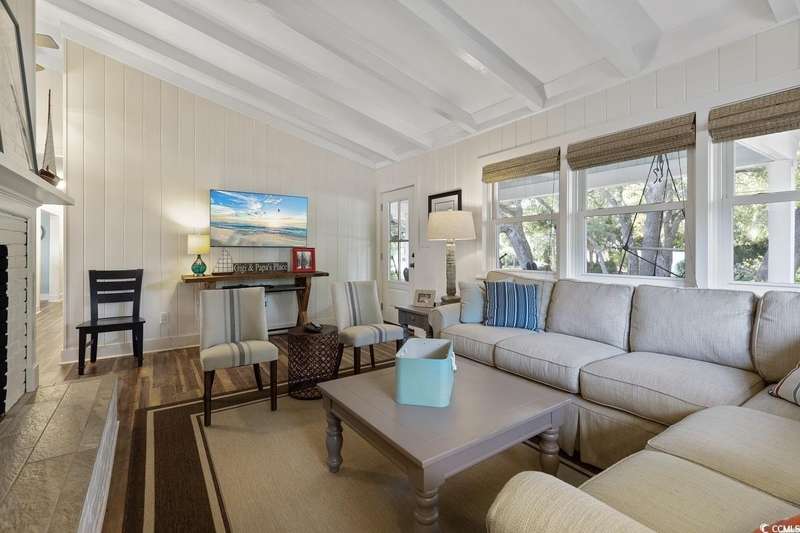 This one-of-a-kind ranch home on a corner lot truly stands out in the neighborhood offering the ease of single-story living with a stylish open floor plan and vaulted ceilings. Renovated and being sold furnished (with just a few exceptions), it’s move-in ready and as welcoming as they come. The beautifully landscaped front yard creates a wonderful first impression with live oaks providing welcome shade, while the spacious back deck and patio make the perfect setting for relaxing or entertaining. A detached garage provides plenty of extra storage and includes room for your golf cart—already included with the home! Adding to its appeal, a separate guest house offers the perfect spot for visiting friends and family or an excellent rental opportunity. Best of all, this unique property is just a short walk to the beach, making it an ideal coastal retreat.