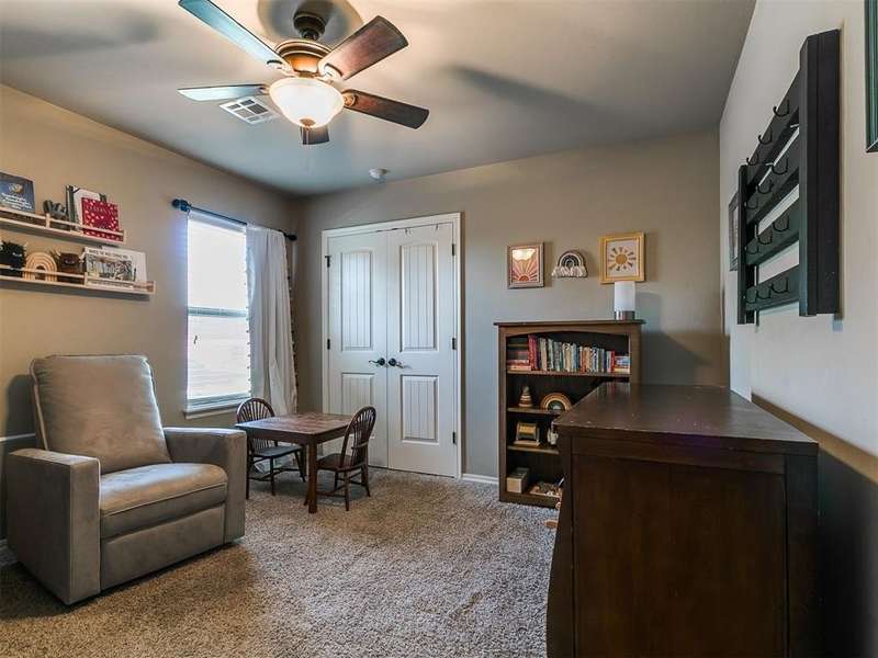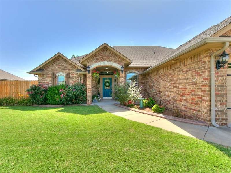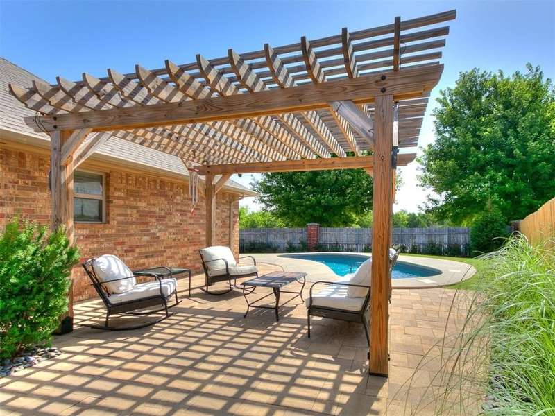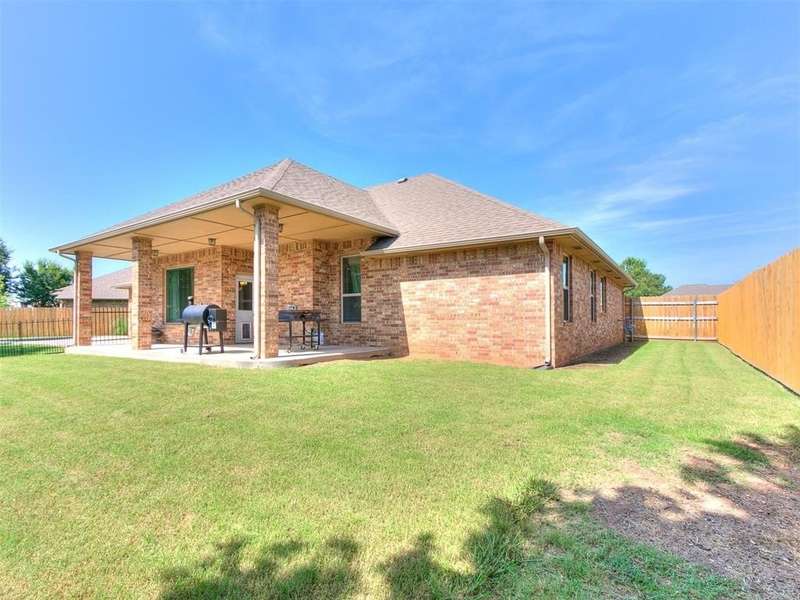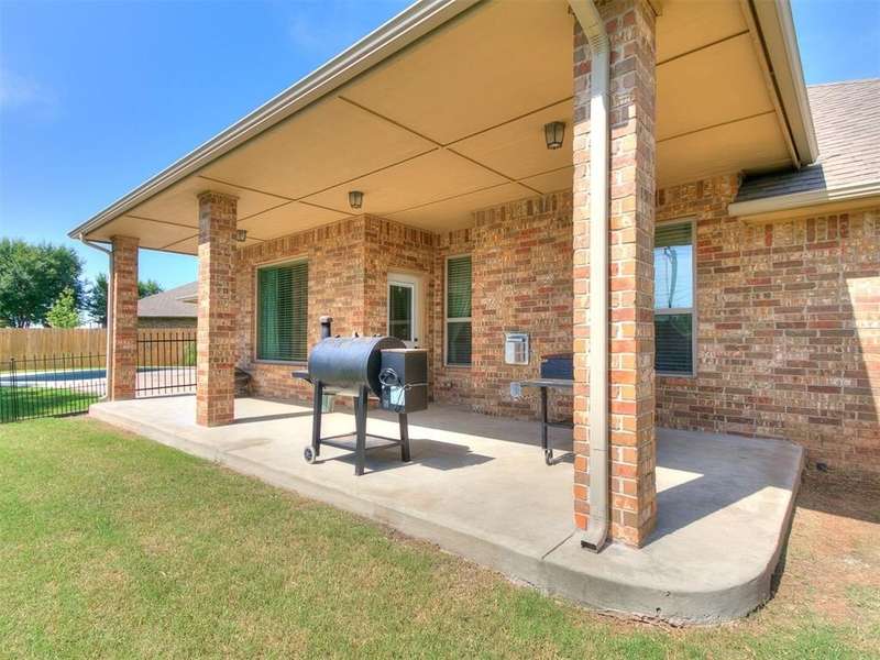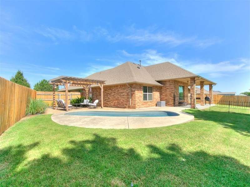 Cool In-ground Pool and Awesome Pergola with smooth paver stone patio plus LED Lighting!! This beautiful home faces West and enjoys shaded back patio in afternoon! Step inside on the tile entry and you will see an Open Living Room and Kitchen! Beautiful Granite countertops, a Pantry, and an abundance of cabinet and counter top space, plus the Large island with eating space! Big Living Room has gorgeous Wood-look Tile floors and a Gas Fireplace! 4th Bedroom is an optional study; Split bedroom floor plan with Spacious Primary Bedroom and Bathroom with Jetted Tub, Walk-in Shower, Double Sinks, Granite, and Walk-in Closet! Secondary Bedrooms with Ceiling Fans, and Walk-in Closets! Hall Bath Has Gorgeous Tiled Shower! Sprinkler System controls and Storm Shelter in Garage! Backyard play or garden space in addition to the separately safety fenced pool! Enjoy Summer with an In-Ground Pool 5ft deep! Covered Patio and A professionally built pergola with lighting.