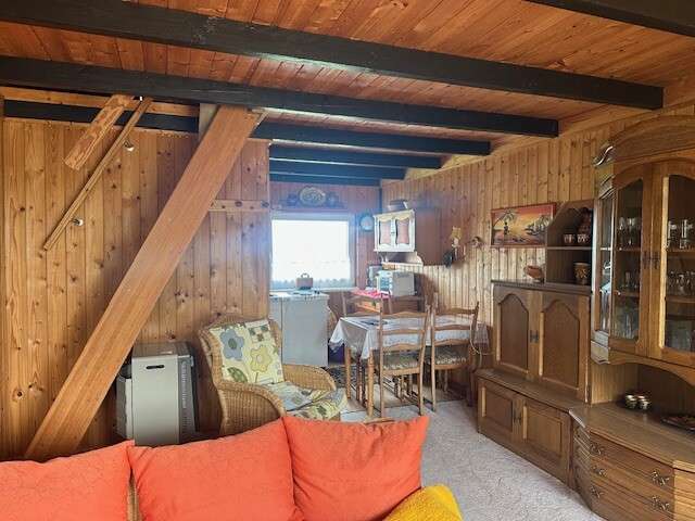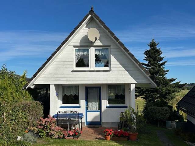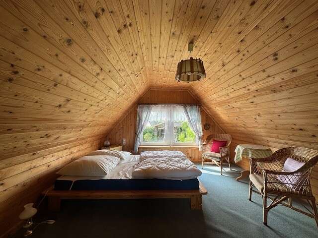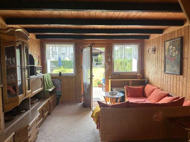 Built in 1982, this detached house in the style of a Finnish hut is located in a sought-after residential area directly on the golf course, not far from the Baltic Sea in an idyllic, natural setting. Nestled on a beautiful green plot with a wonderful, unobstructed view of the gently rolling landscape, the property offers individual rooms, comfort, valuable privacy and plenty of peace and quiet. It impresses with its very special charm and functional furnishings and was built by hand with great attention to detail, modernized in the 1990s and continuously maintained. You enter the first floor via the small terrace or the narrow entrance area, which leads into the living room with open kitchen and cozy fireplace. Here you have a wonderful view of the lovingly landscaped garden and the countryside, with its gently rolling meadows and fields all the way to the Baltic Sea. The shower room, sauna and storage area are also located on this level. The upper floor is reached via a room-saving staircase, which has 1 bedroom with veranda, a WC and a cupboard area. The floors here are carpeted. The house is practically completed by a small cellar area and an adjoining storage room. The charming guest house is a great added value. It welcomes friends and guests. The small domicile (unheated) has an open-plan living/dining area, a shower room and a bedroom on the upper floor and is approx. 40 m² in size. This little paradise is located on a green plot of approx. 500 m² with fruit trees and a variety of green and flowering plants. The terrace with sheltered seating area offers an absolutely peaceful and natural atmosphere. It is a wonderful place to relax. The lovingly landscaped plot is bordered by large green areas and only 2 neighbors due to its peripheral location. The front area of the property has a parking space. Access is via this. Golf enthusiasts and nature lovers will get their money's worth here thanks to the immediate proximity to the golf course with views of the Baltic Sea. The beautiful white Baltic Sea beach is just a few minutes away.
