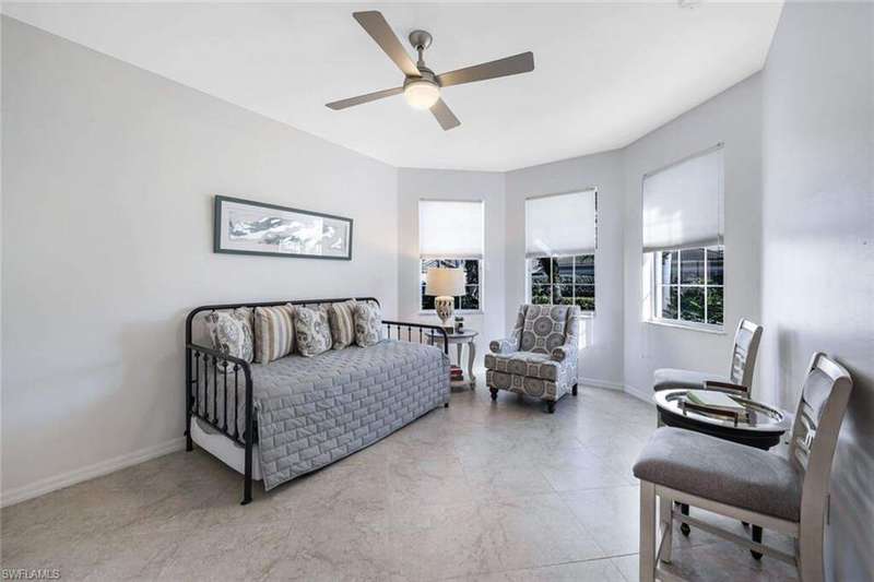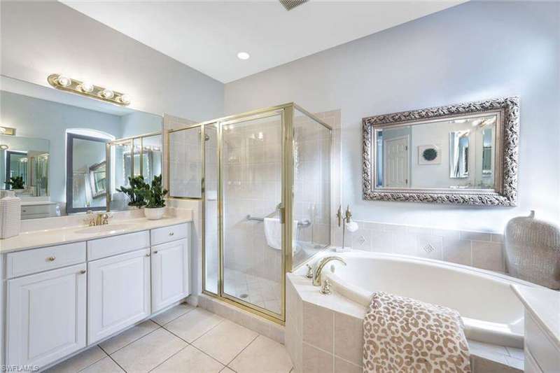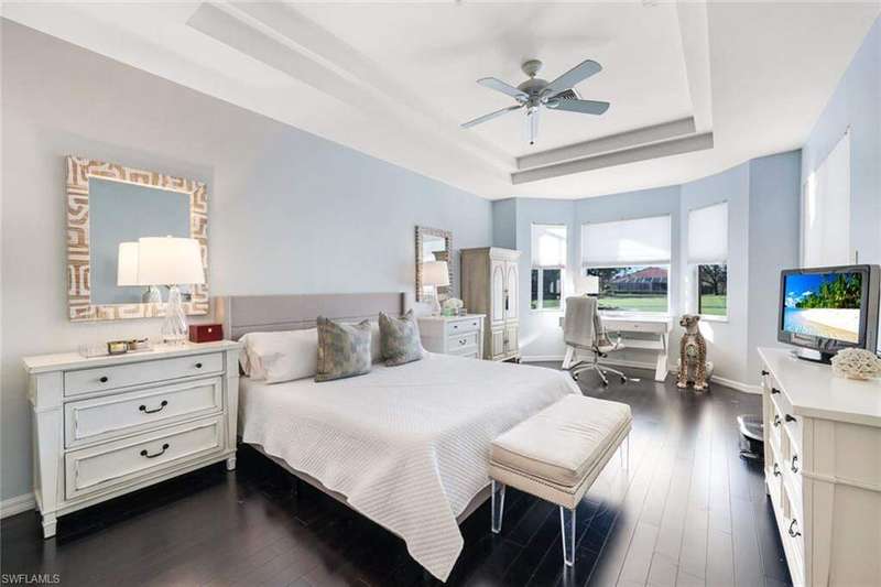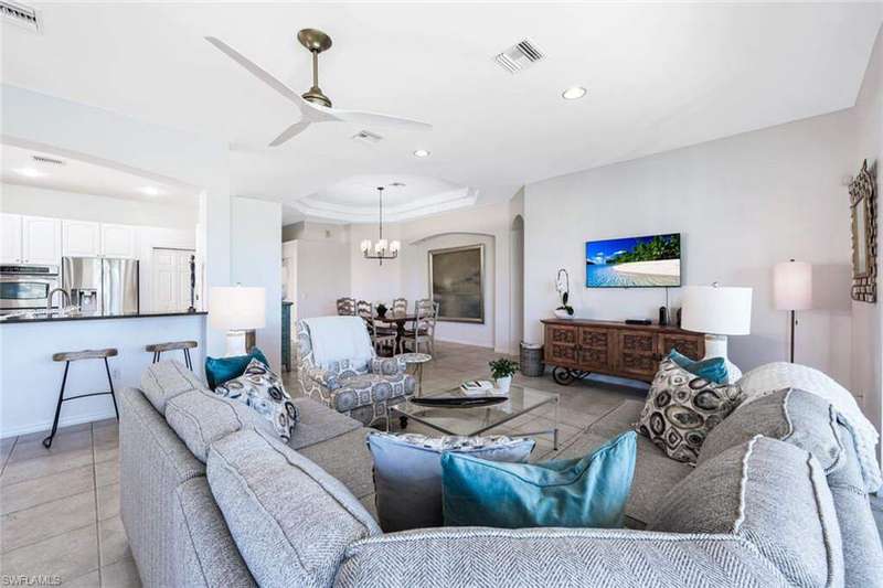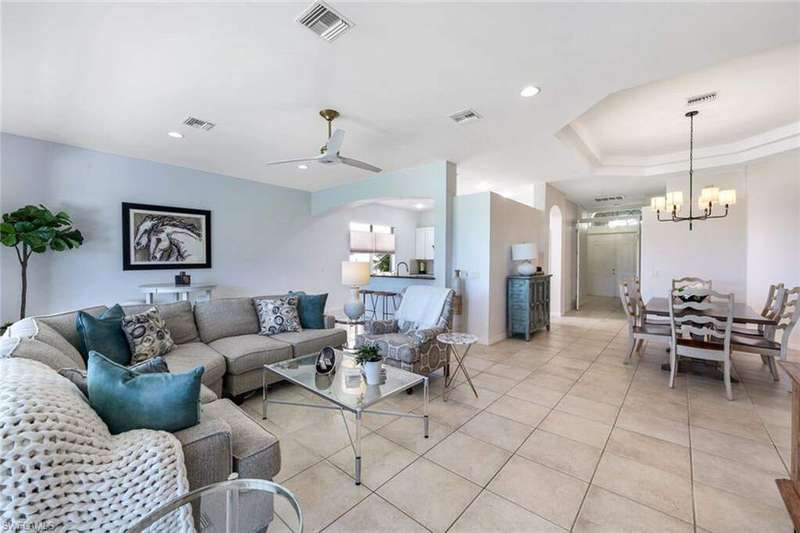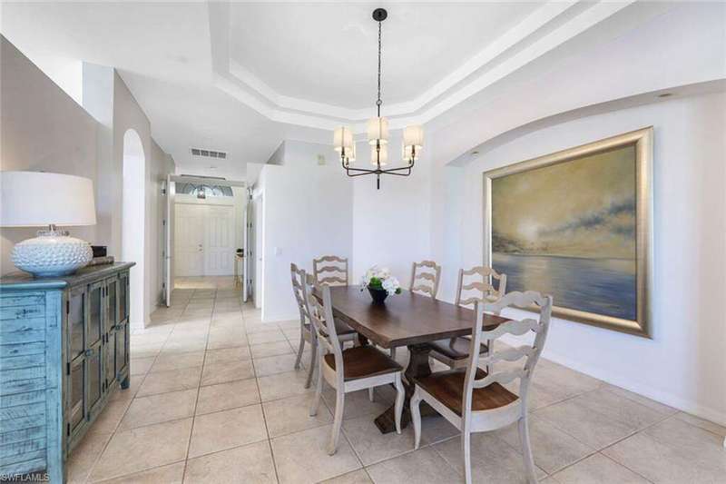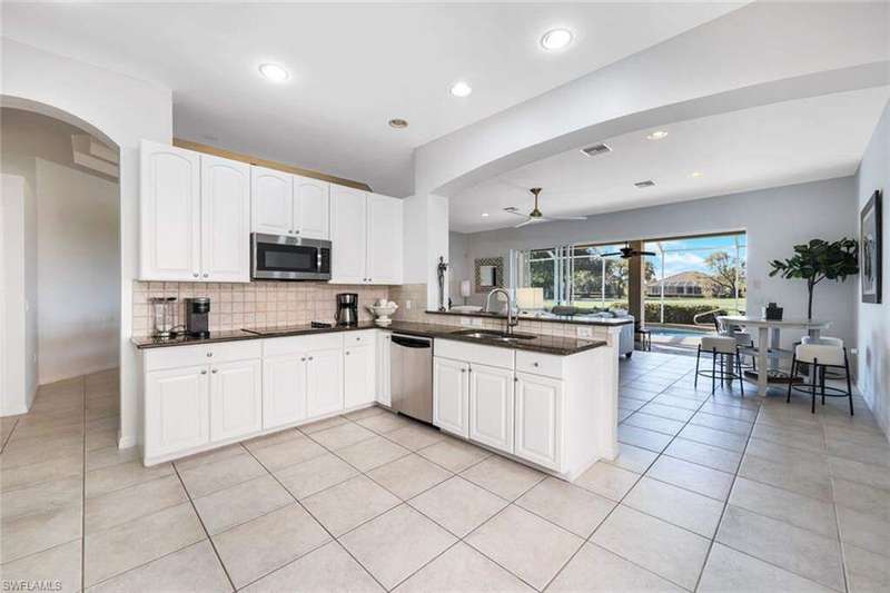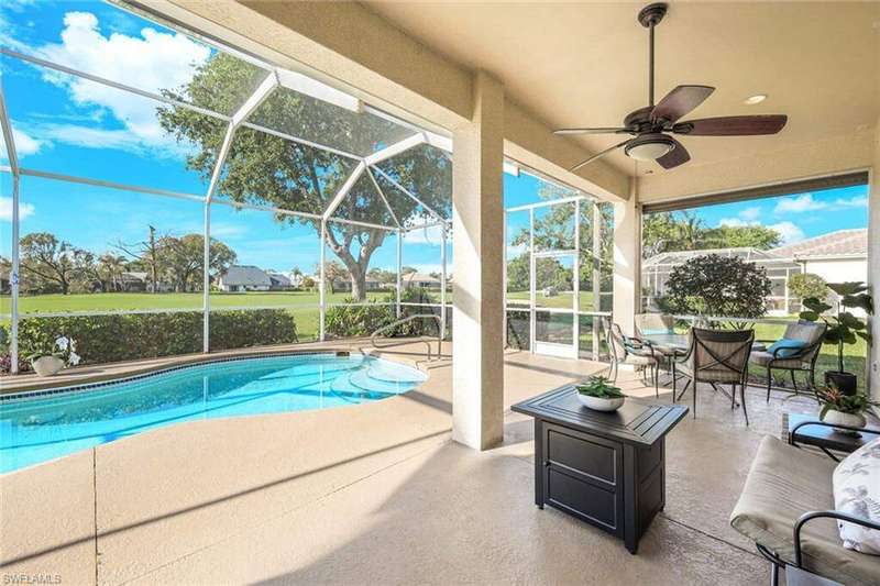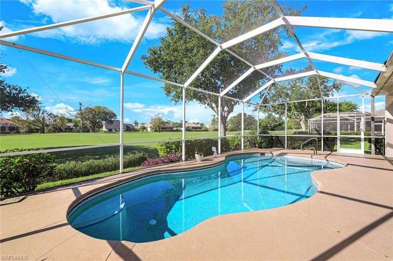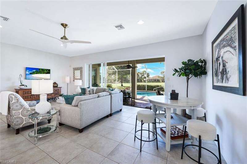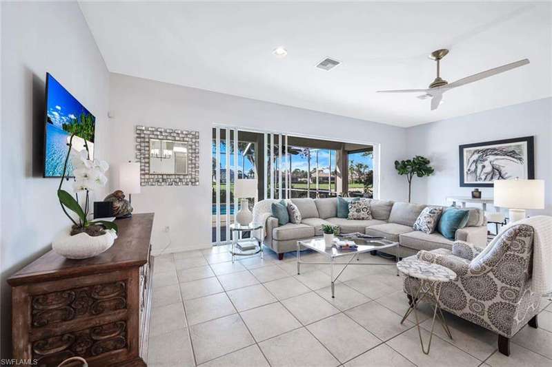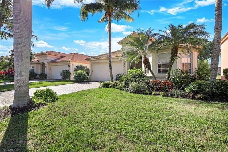 Welcome to beautiful Marbella of Spanish Wells, where majestic royal palms greet you at the entrance and set the stage for the Florida lifestyle that awaits. As you enter your private residence, you'll be captivated by panoramic views of the pristine golf course and tranquil lake, creating a serene backdrop for your everyday living. With southern exposure, your sunny pool area invites endless moments of relaxation and enjoyment under the Florida sun! This exquisite home features 3 spacious bedrooms, all adorned with voluminous ceilings that enhance the sense of openness and light. ROOF 2019! The double car garage provides convenience and ample storage for your lifestyle needs. As you pass through the double glass French doors of the foyer, you'll be welcomed into the expansive dining and living area-perfect for entertaining friends or enjoying quality family time. Don't miss this incredible opportunity to own a slice of paradise. Learn more about this enticing offer and schedule your private showings, Your dream home is just a doorstep away! (Flood Zone X - no flood insurance needed)