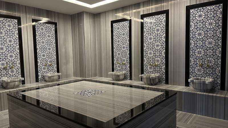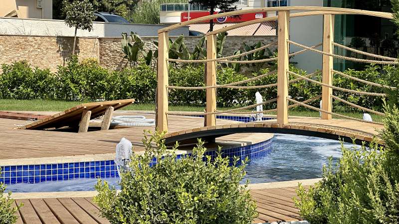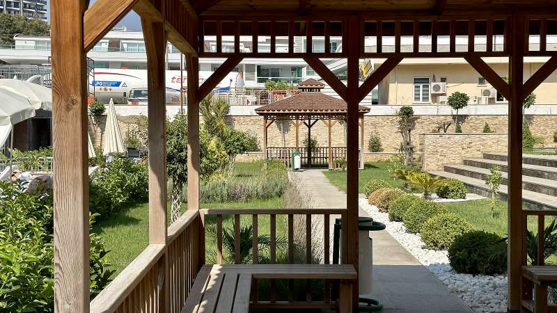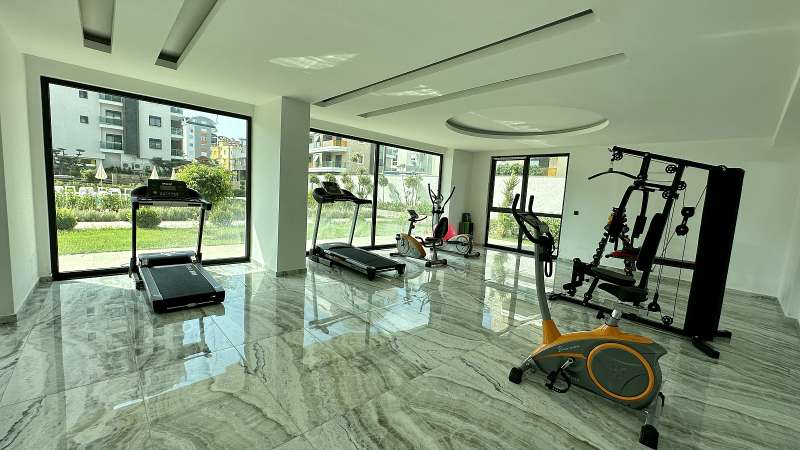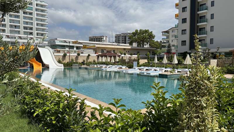 The complex consists of 2 blocks with 9 floors and attracts attention with its modern design and spacious garden. It is equipped with a well-designed garden, outdoor swimming pool, indoor pool, jacuzzi, children's pool, children's playground, sauna, water slides, Turkish bath, massage rooms, fitness center, billiards, table tennis, parking, barbecue area, generator, gazebo, gardener, wireless internet, elevator, decorative waterfall in the garden and 24/7 security system.