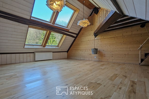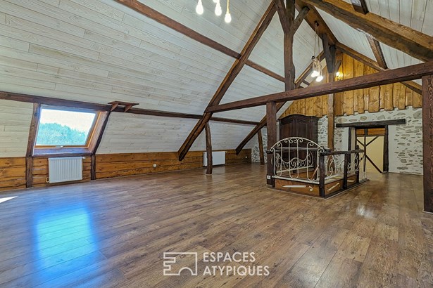 Upstairs, a huge attic room reveals magnificent volumes under the period wooden framework. In an exposed stone wall, a door opens onto a large bedroom with walls decorated with half-timbering and a precious wood floor. Opposite, behind a hidden door, hides a majestic and luminous attic room, whose roof openings provide a magnificent view of nature. This space encourages zenitude and its generous surface area could easily accommodate relaxing activities. A surprise awaits the children!