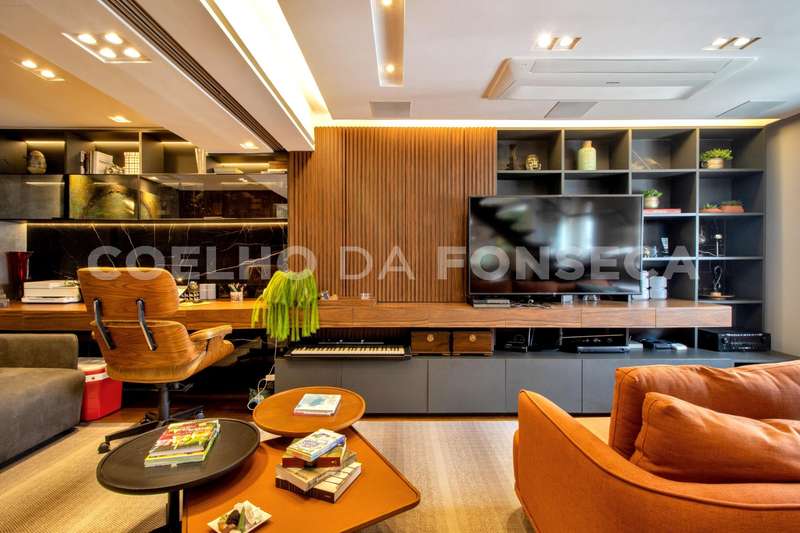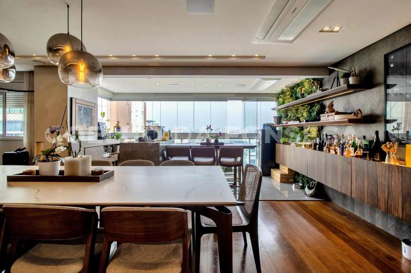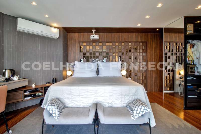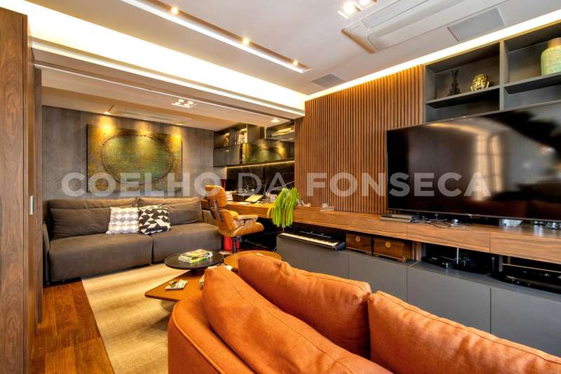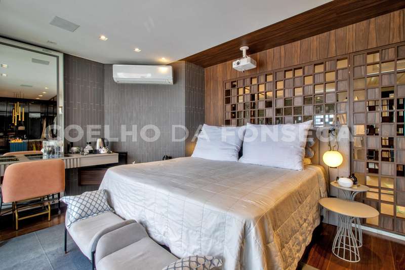 O apto conta ainda com um sistema de som moderno integrado em vários ambientes, incluindo a sala de jantar, o bar, a sala de TV e a suíte master, com extensão para a varanda da suíte, proporcionando uma experiência imersiva e sofisticada em todos os momentos.