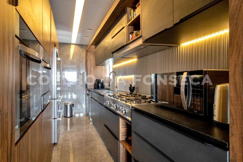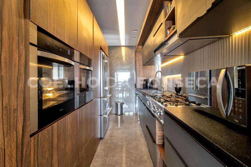 No piso inferior, a área social foi cuidadosamente planejada para proporcionar ambientes elegantes e acolhedores. A sala de jantar espaçosa, a sala de TV e o bar são perfeitos para receber amigos e familiares. O escritório é ideal para quem precisa de um espaço de trabalho tranquilo e funcional. O lavabo, a cozinha com eletrodomésticos italianos e as dependências de empregada completam o andar inferior, com uma distribuição que privilegia o conforto e a praticidade.