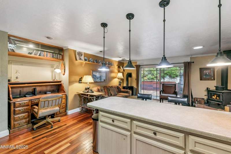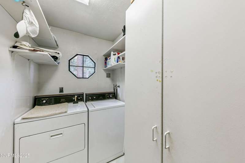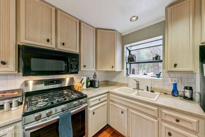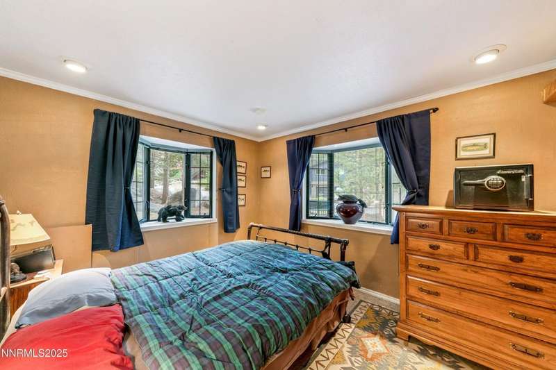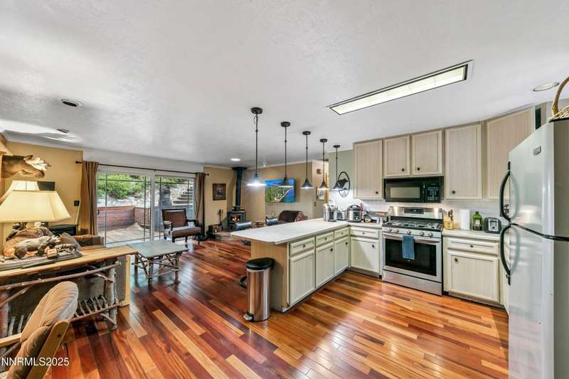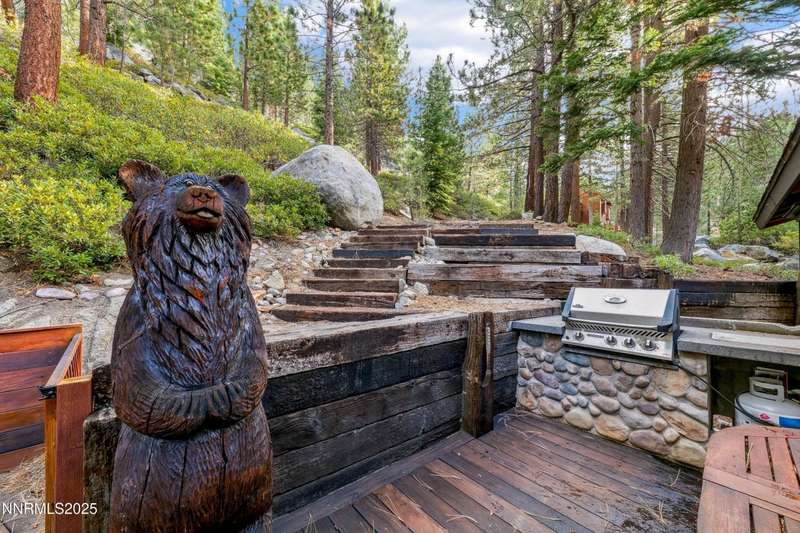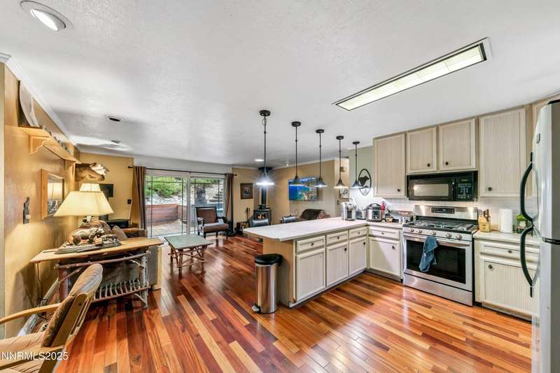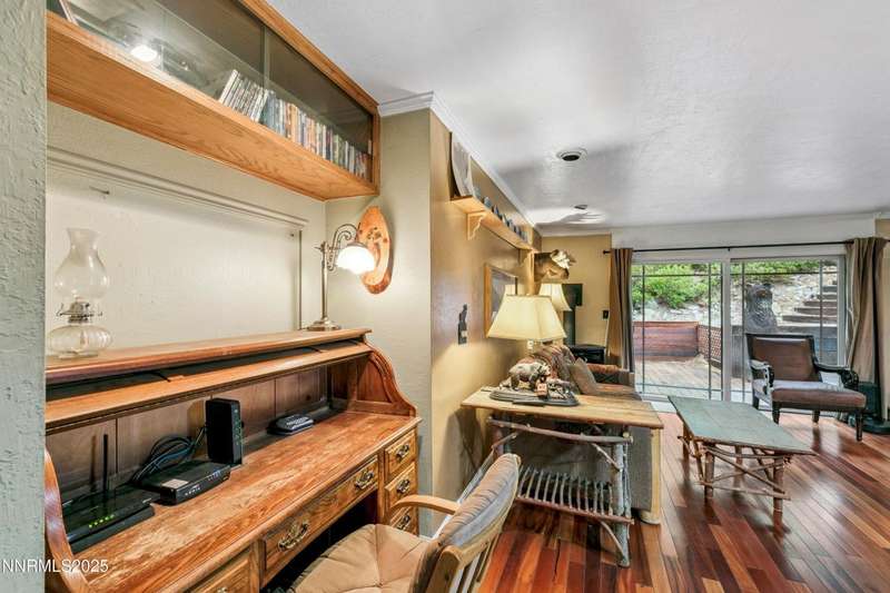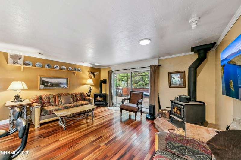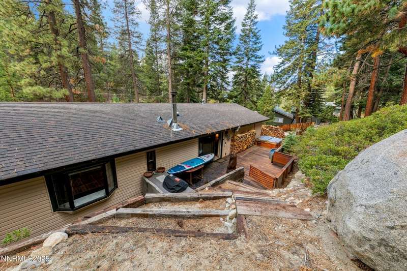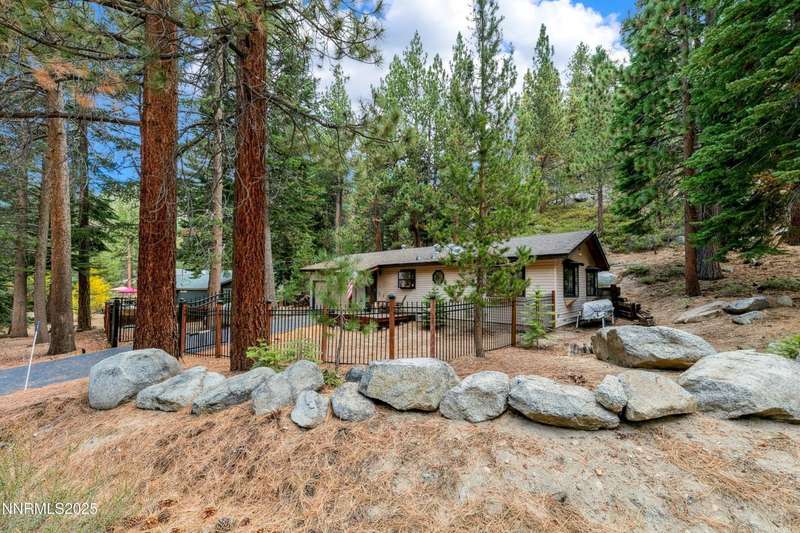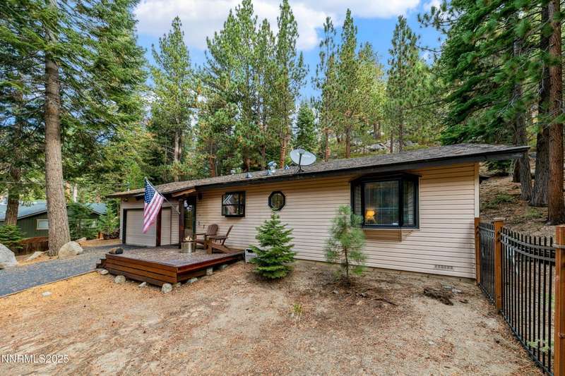 The perfect starter home or Nevada address! This perfectly maintained, turn-key home features beautiful, Brazilian redwood flooring throughout, gas stove, pantry & garden window in kitchen, newer wood burning stove and a gas-log stove in living room, newly remodeled bath with granite counter, custom tile shower with window. Both bedrooms have two bay windows each, to bring all the wooded views & sunshine in, along with built-in shelves and closet. The living room opens to a totally private, back yard deck with built-in Bar-B-Que, and hot tub, while overlooking nothing but a serene forest setting. Other features include a spacious laundry room, Toto toilet, new solid wood pine doors throughout, a new Generac generator, & a workshop in the spacious two car garage, with lots of extra storage space. The exterior is all maintenance free vinyl siding, along with a new front porch, newly sealed level driveway, and an iron fenced front and back yard with a remote gated entrance for added privacy. Most all furnishings are included, along with plenty of firewood (water tun not included). Located near the end of a quiet cul-de-sac, on a spacious .61-acre lot with room for boat or RV parking, and a forest service lot to the right gives one the sense of total serenity and privacy. Only steps to miles of hiking and biking trails, and only five minutes to world class skiing at Heavenly Valley and the casino corridor. This one will not last long!