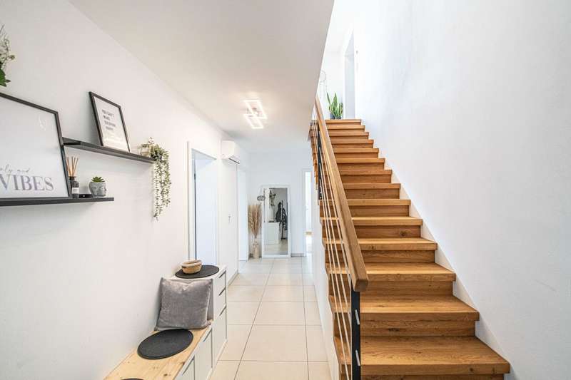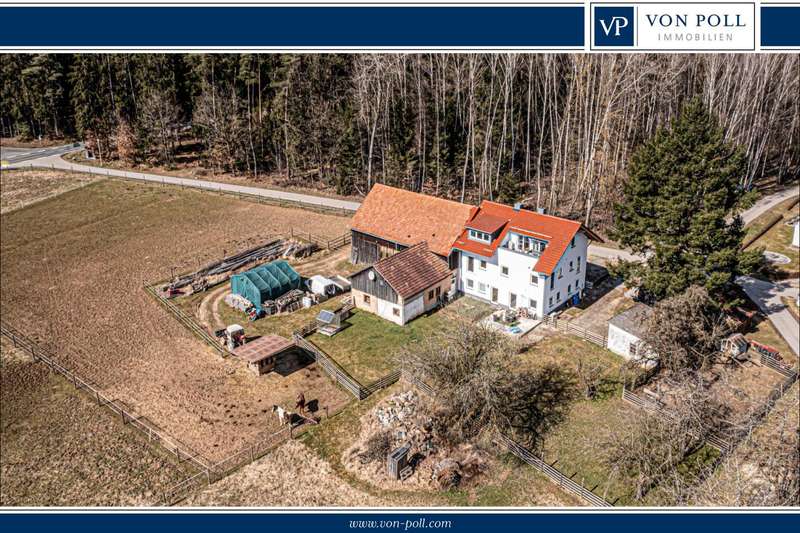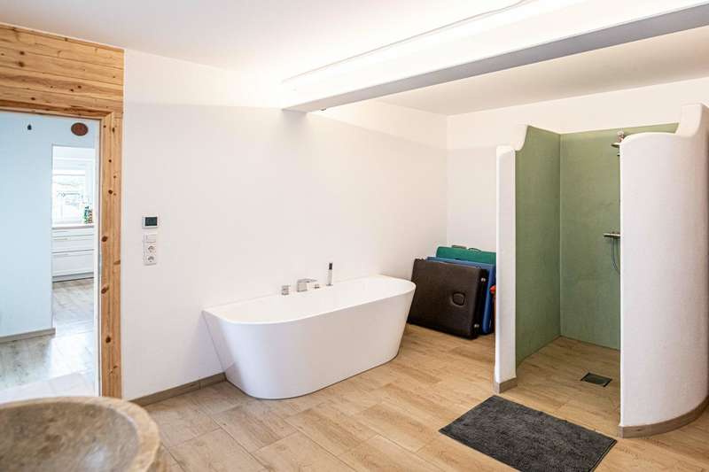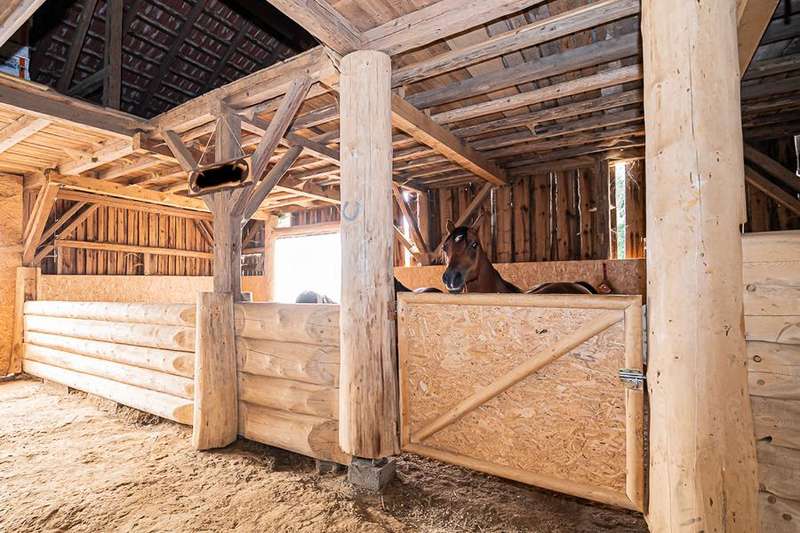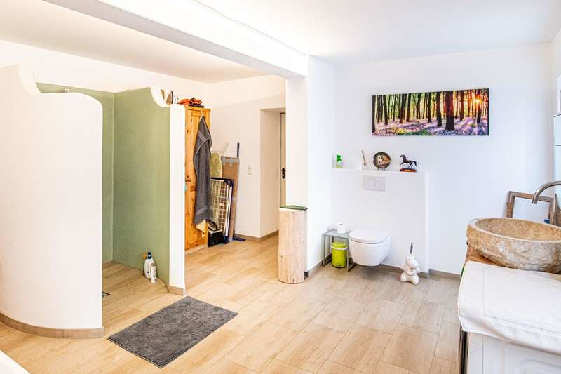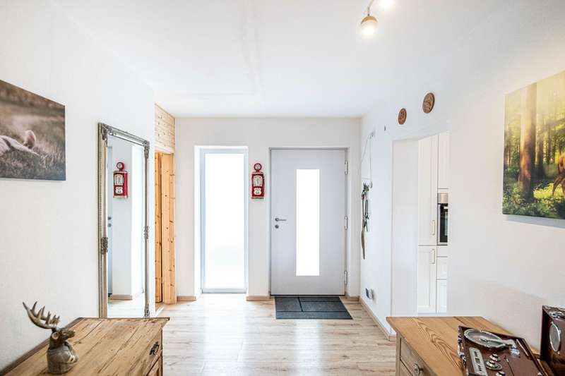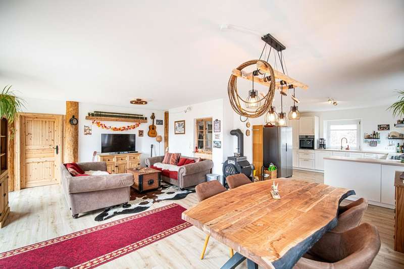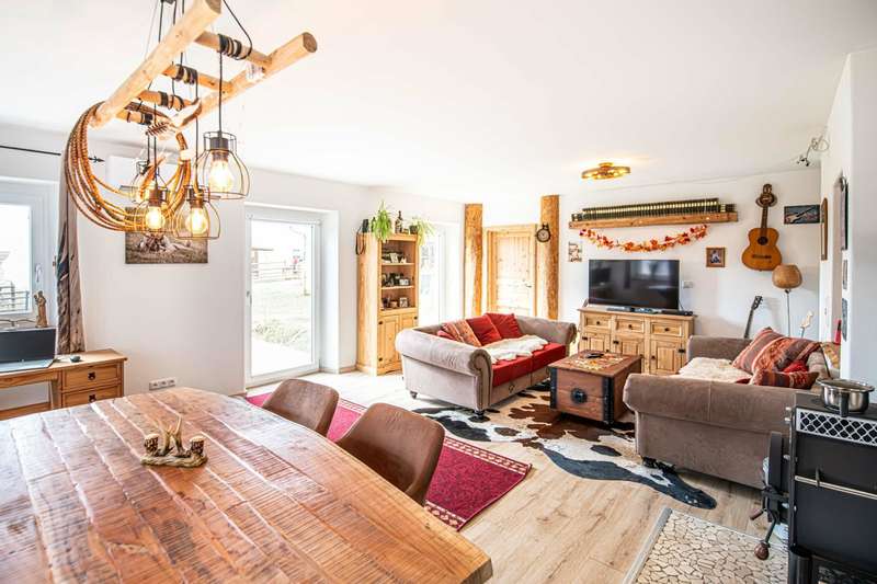 Your dreams will come true here! On an area of around 17,000 square meters, you can live in a modern and spacious home, practice species-appropriate animal and horse husbandry, build up self-sufficiency and pursue your hobbies - such as handicrafts. The house, which was first occupied in 2020 or 2022, offers space for a large family: On the first floor of around 108 m², you can live comfortably at ground level in an open-plan cooking/living and dining area with a modern kitchen and wood-burning stove, a bedroom and a spacious bathroom with a walk-in "snail shower". The floor slab for a structurally approved conservatory adjoining the living area with an area of around 25 m² has already been constructed and is currently used as a terrace via the access from the living area. Via the bathroom, you can reach the stables directly and dry-footed, passing a storage room and the technical room. The maisonette apartment on the upper floor, which offers plenty of space for a large family, can be reached separately from the outside via a staircase. There are a total of 4 bedrooms on this floor and a comfortable "wellness oasis" with bathtub and walk-in shower. A modern oak staircase takes you up one floor directly to the light-flooded living room with a 3-sided glazed fireplace for cozy winter evenings and a sun roof terrace for spending time outdoors, as well as a modern kitchen that leaves nothing to be desired, with an adjoining dining area. A guest toilet with shower room and a storage room round off the space available on this floor. The rooms on the ground floor are heated by a wood-burning stove (Bruno Romantik mini wood-burning stove with 9 kW heating capacity), air conditioning with heating function and electric underfloor heating in the bathroom. A separate hot water heat pump provides hot water on the ground floor. On the upper floor and attic, the heat - both for the rooms and for the domestic hot water - is generated with the help of an air/heat pump (underfloor heating). There is also an air conditioning unit on each floor. The outbuildings with a gross floor area of approx. 250 sqm are made up as follows: Stables: - Horse stable in natural trunk construction for 4 large horses and feed store (feed supplier can be taken over) - Heated drinking basin - Hot and cold water pipes for horse shower or similar already installed - Preparation for WC on the upper floor of the barn (sewer, hot and cold water pipes and empty conduits for electricity) Workshop: 2 storage rooms Miscellaneous: - Double garage (new roof panels already in place - still to be installed) - large pasture area with approx. 14,000 m² - the entire property is fenced (game fence for sheep and 3 power lines for horses) - Hay rack generously covered on the pasture (holds a round bale of hay for 24/7 feed supply) - Enclosure for poultry completely fenced with double wire mesh - 2 poultry houses - Old fruit tree population and fruit trees (crab apple, sweet cherry, damson plum) and chestnut newly planted - Drinking water via public water supply - Own well on the property - Connection to the public sewer Some remaining work is still required in the house; most of the materials for this are already available.