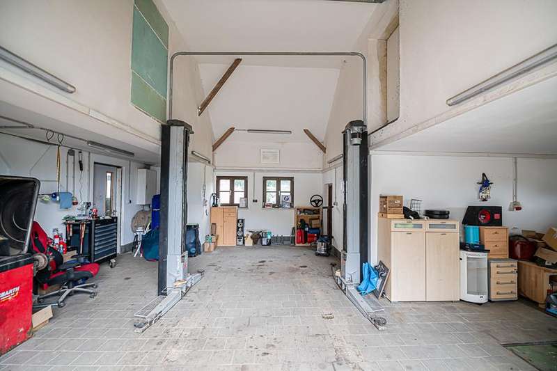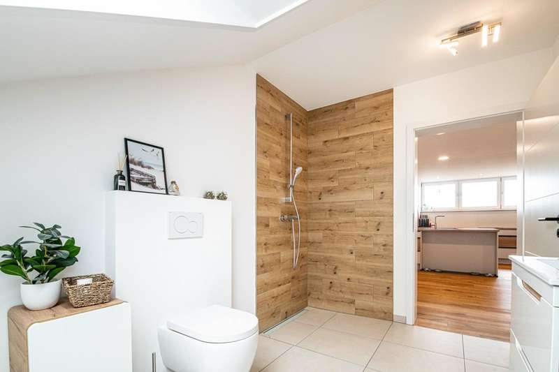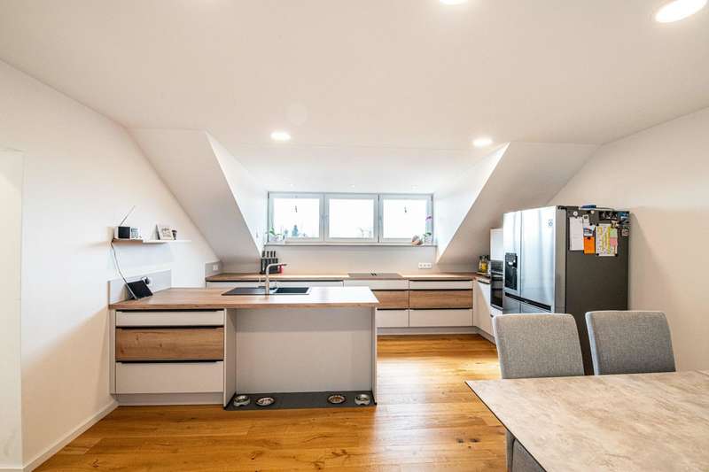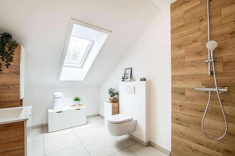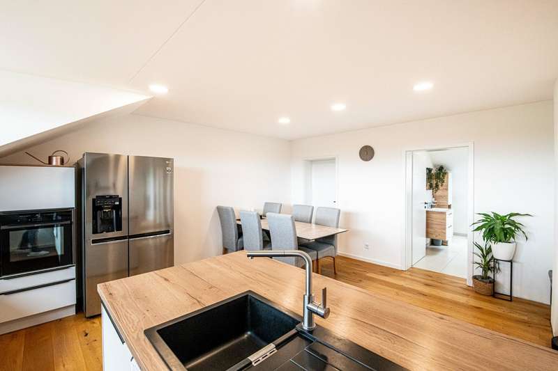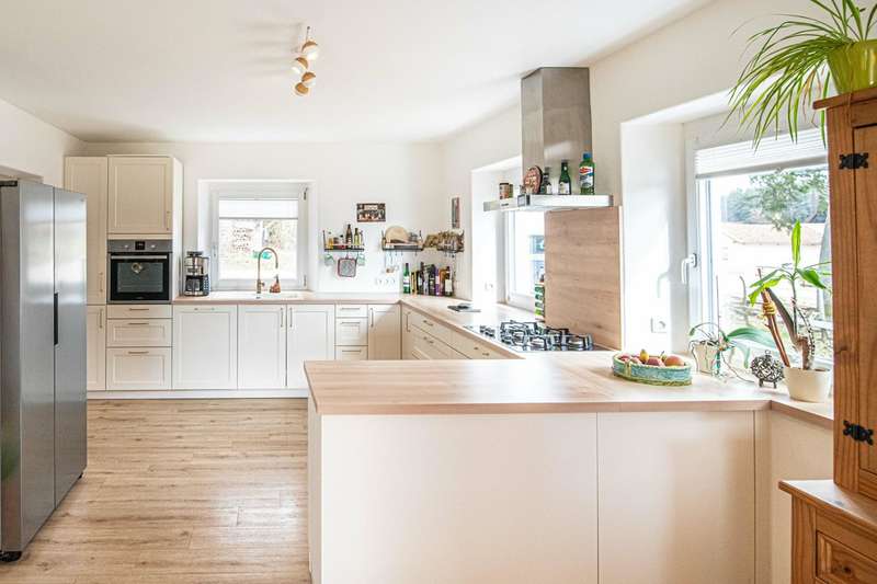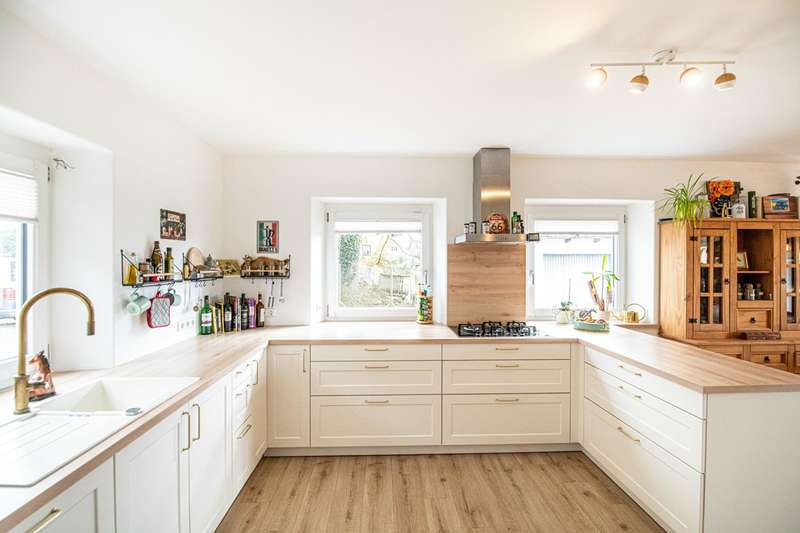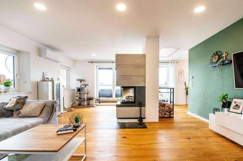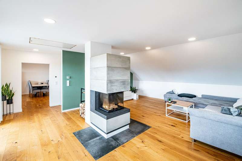 Your dreams will come true here! On an area of around 17,000 square meters, you can live in a modern and spacious home, practice species-appropriate animal and horse husbandry, build up self-sufficiency and pursue your hobbies - such as handicrafts. The house, which was first occupied in 2020 or 2022, offers space for a large family: On the first floor of around 108 m², you can live comfortably at ground level in an open-plan cooking/living and dining area with a modern kitchen and wood-burning stove, a bedroom and a spacious bathroom with a walk-in "snail shower". The floor slab for a structurally approved conservatory adjoining the living area with an area of around 25 m² has already been constructed and is currently used as a terrace via the access from the living area. Via the bathroom, you can reach the stables directly and dry-footed, passing a storage room and the technical room. The maisonette apartment on the upper floor, which offers plenty of space for a large family, can be reached separately from the outside via a staircase. There are a total of 4 bedrooms on this floor and a comfortable "wellness oasis" with bathtub and walk-in shower. A modern oak staircase takes you up one floor directly to the light-flooded living room with a 3-sided glazed fireplace for cozy winter evenings and a sun roof terrace for spending time outdoors, as well as a modern kitchen that leaves nothing to be desired, with an adjoining dining area. A guest toilet with shower room and a storage room round off the space available on this floor. The rooms on the ground floor are heated by a wood-burning stove (Bruno Romantik mini wood-burning stove with 9 kW heating capacity), air conditioning with heating function and electric underfloor heating in the bathroom. A separate hot water heat pump provides hot water on the ground floor. On the upper floor and attic, the heat - both for the rooms and for the domestic hot water - is generated with the help of an air/heat pump (underfloor heating). There is also an air conditioning unit on each floor. The outbuildings with a gross floor area of approx. 250 sqm are made up as follows: Stables: - Horse stable in natural trunk construction for 4 large horses and feed store (feed supplier can be taken over) - Heated drinking basin - Hot and cold water pipes for horse shower or similar already installed - Preparation for WC on the upper floor of the barn (sewer, hot and cold water pipes and empty conduits for electricity) Workshop: 2 storage rooms Miscellaneous: - Double garage (new roof panels already in place - still to be installed) - large pasture area with approx. 14,000 m² - the entire property is fenced (game fence for sheep and 3 power lines for horses) - Hay rack generously covered on the pasture (holds a round bale of hay for 24/7 feed supply) - Enclosure for poultry completely fenced with double wire mesh - 2 poultry houses - Old fruit tree population and fruit trees (crab apple, sweet cherry, damson plum) and chestnut newly planted - Drinking water via public water supply - Own well on the property - Connection to the public sewer Some remaining work is still required in the house; most of the materials for this are already available.