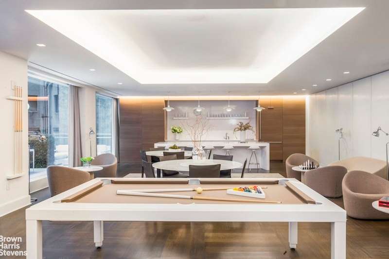Amenities include a large and elegant lounge with a Billard table and outdoor space; a rooftop terrace with fireside seating and grill; a windowed fitness center designed by The Wright Fit; a fun-filled playroom created by Silver Hill Atelier; a multimedia music room; a conference room with remote meeting capabilities; and private tutoring/study pods.