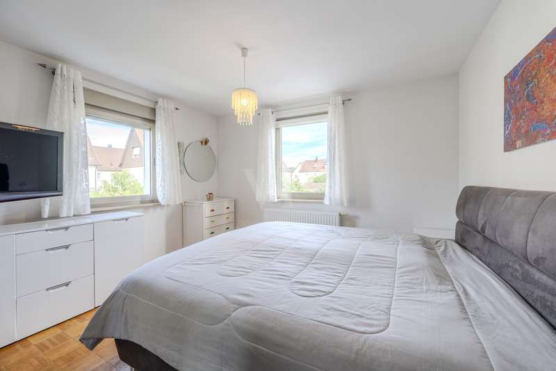This generously proportioned terraced end-terrace house built in 1935 impresses with its well thought-out room concept, ongoing modernization and numerous features that ensure modern living comfort. With a living space of approx. 121 m², spread over five rooms including the converted attic, this property is particularly appealing to families or couples who need space. The plot covers approx. 317 m² and offers a wide range of possible uses. The entrance area leads into a central hallway from which all areas of the floor are accessible. Here there is an open-plan living and dining area, which creates a cozy atmosphere thanks to a wood-burning stove. The kitchen, which was renovated in 2012, is functionally equipped and offers plenty of space. A guest WC, also modernized in 2012, completes the space on this level. Three bedrooms await you on the upper floor, which can be used flexibly as children's rooms, study rooms or guest rooms, depending on your living situation. The daylight bathroom with modern fittings (2012) impresses with its appealing design and functional elements. The converted attic extends the living options: Here, a further room can be used as a hobby room, office or additional bedroom. The property has been extensively maintained and modernized in key areas over the years. Among other things, the roof and insulation (2002 and 2012), façade were replastered (2010), gas central heating (2012), water and sewage pipes (2012), front door (2013) and floor coverings were regularly renewed. The garage door was renewed in 2018, the garage roof in 2024; ceilings and walls were also renovated in 2024. The existing photovoltaic system in the garden with battery storage was installed in 2022 and ensures a sustainable energy supply. The roof is also prepared for the installation of solar or PV systems at a later date in order to make the most of future opportunities. The low-maintenance garden offers plenty of space for outdoor recreation. The property comes with a garage and additional parking spaces, so there is also parking space for several vehicles. This end terraced house combines contemporary comfort with a solid building structure and offers plenty of space for individual living concepts. Interested? Arrange a viewing appointment to see the benefits of this property for yourself.