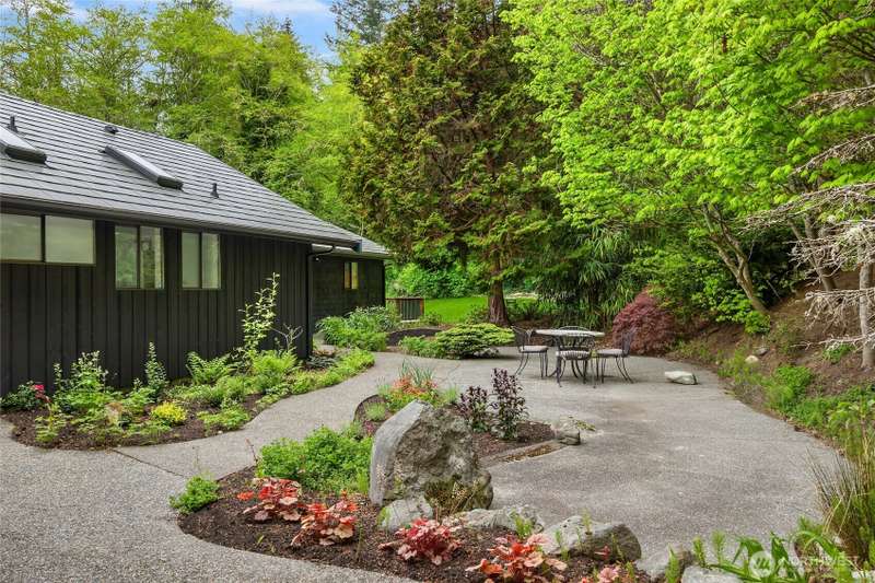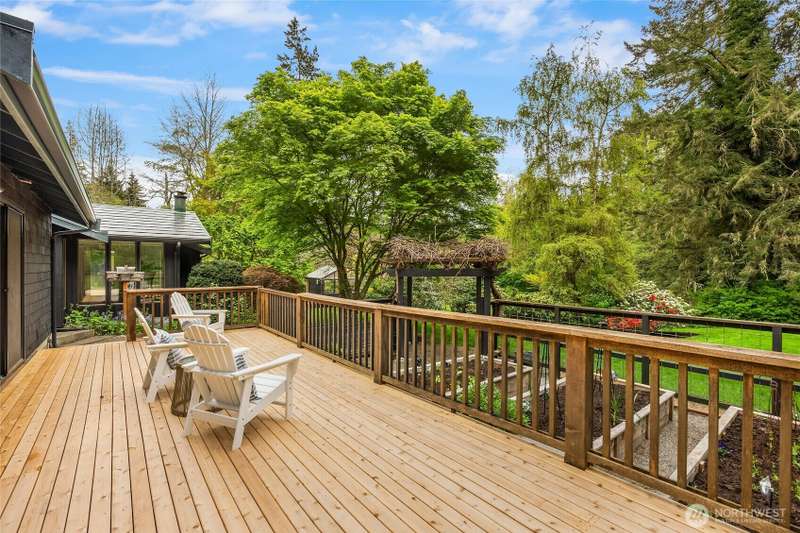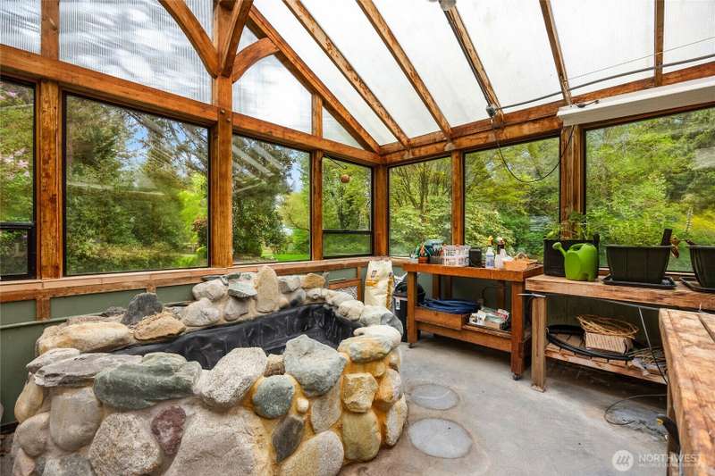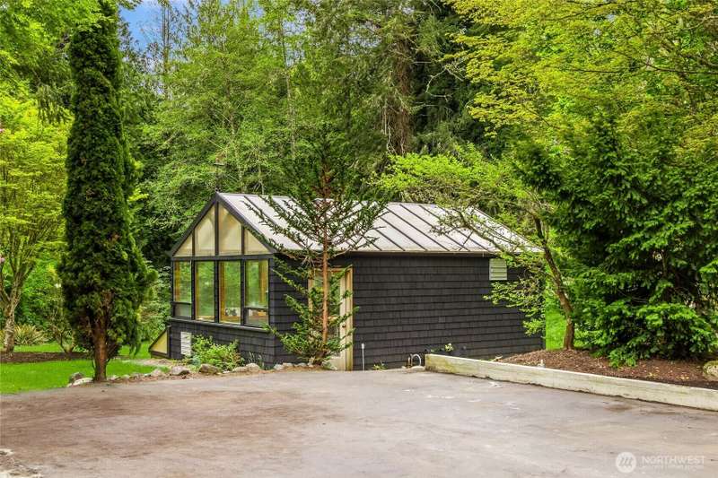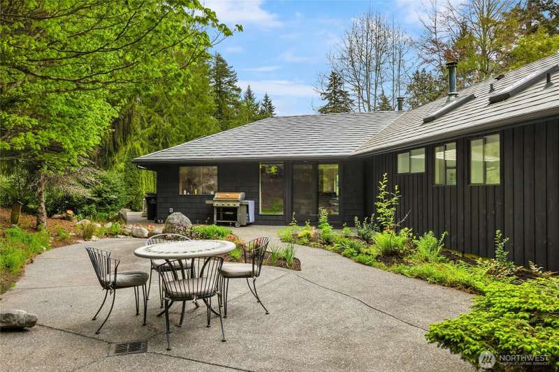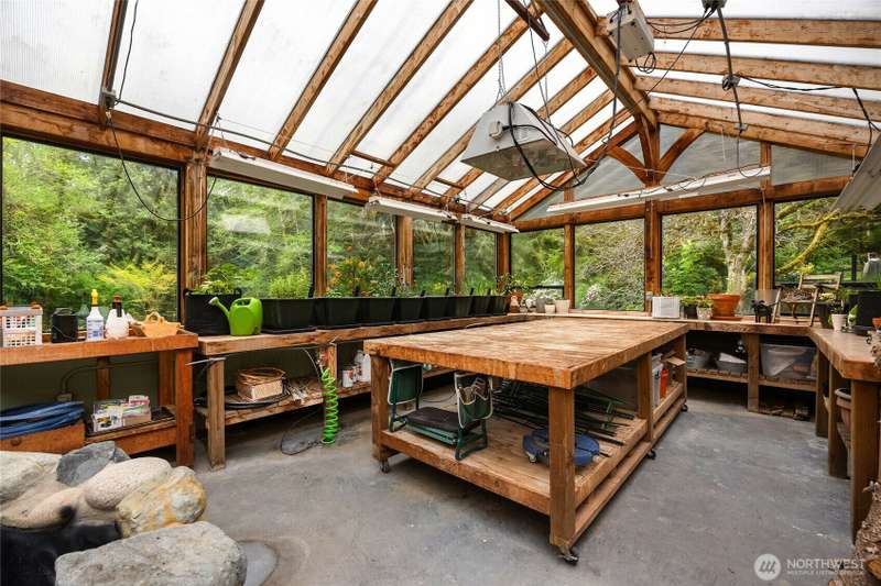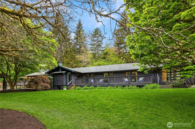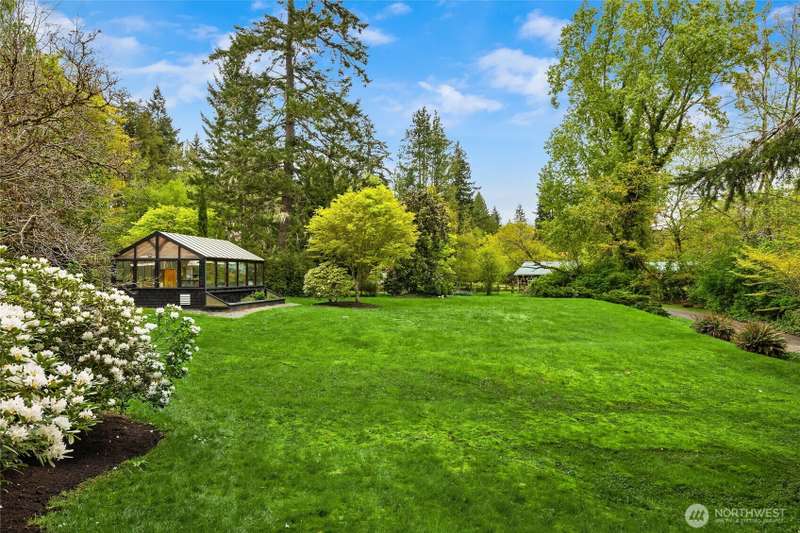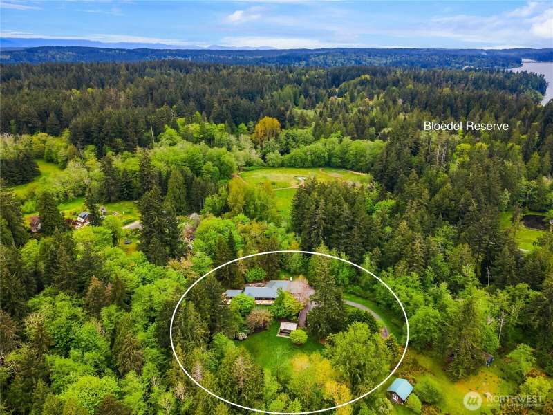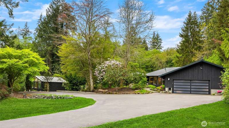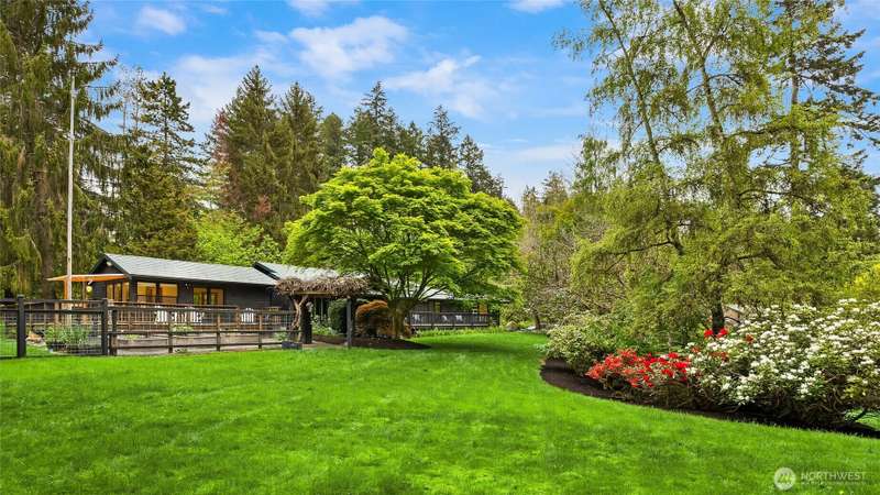 Stunning one-level home with a detached studio on lovely acreage abutting the Bloedel Reserve. The approach is along a peaceful driveway past your own pond & gorgeous gardens with a huge English walnut tree. The lot is private & sunny. Inside this home is open & airy with large windows to bring the outside in...a perfect home to entertain in with a great room that spills out onto expansive decks as well as separate spaces to work or play in. Beautiful, beveled glass French doors lead to a wonderful office. Main house has 2304 sq ft & detached studio with a full bath & large private deck has an additional 432 sq ft. Don't miss the fabulous greenhouse with radiant heated tables tucked in the garden, & workshop off the garage.