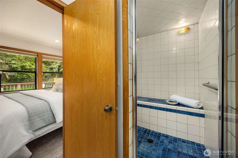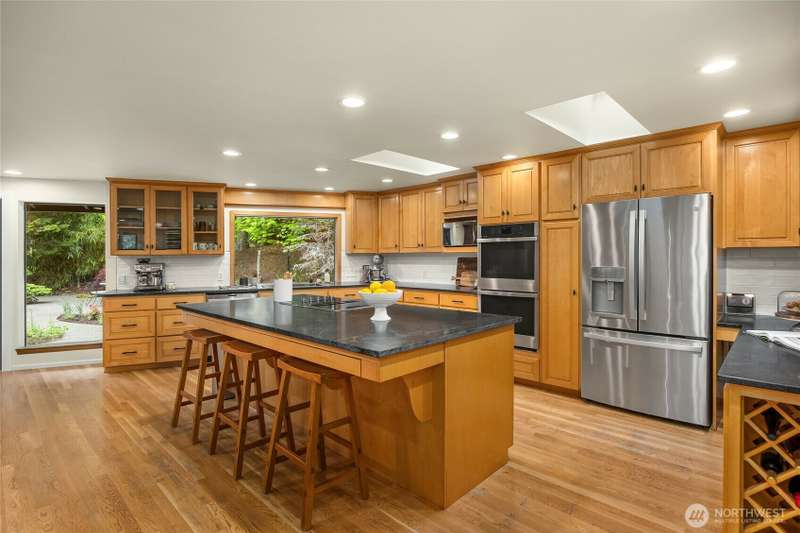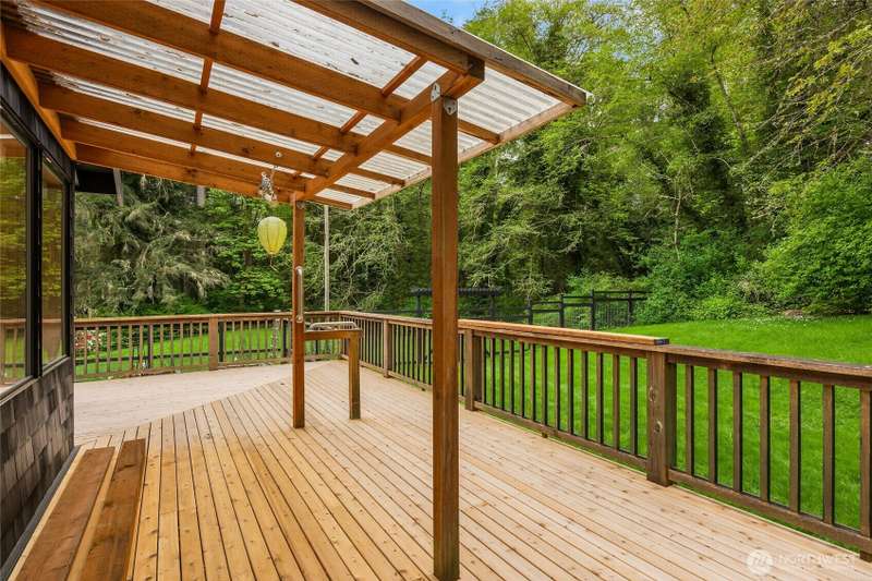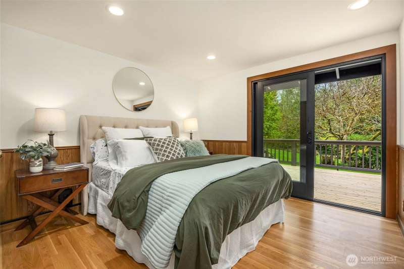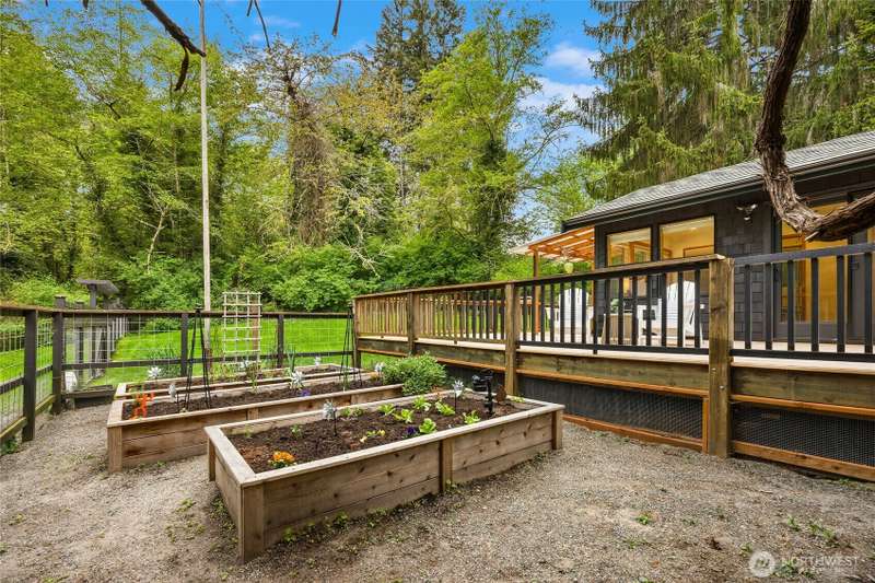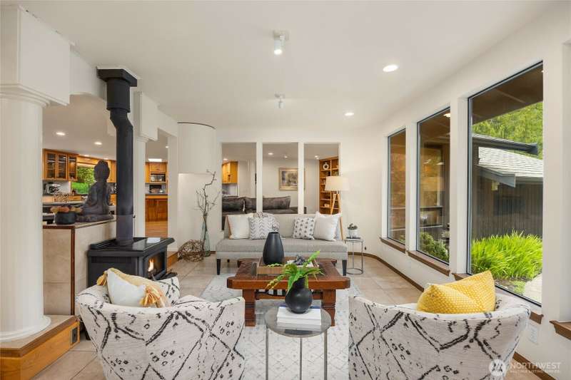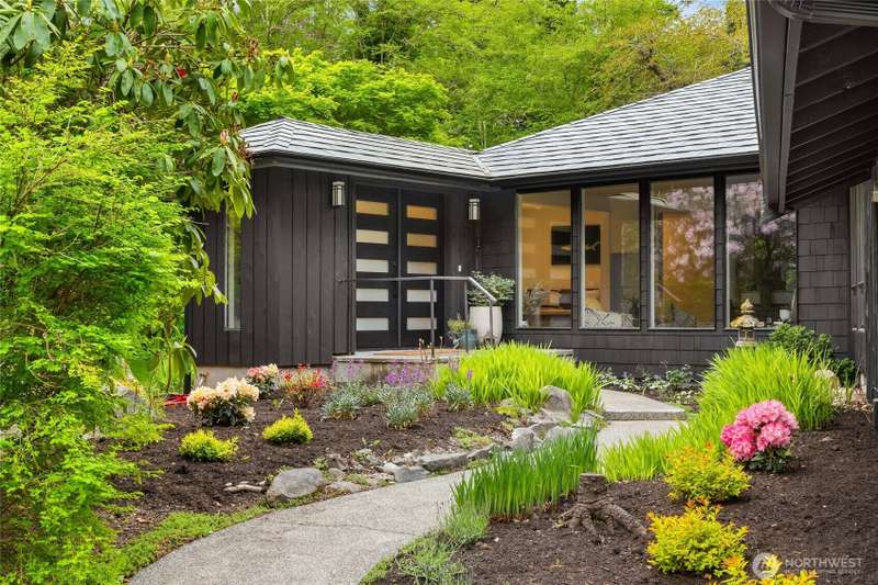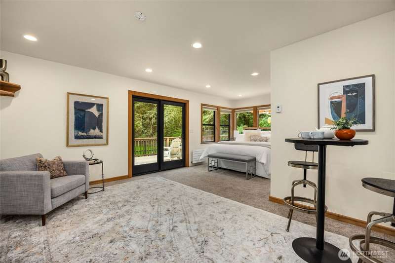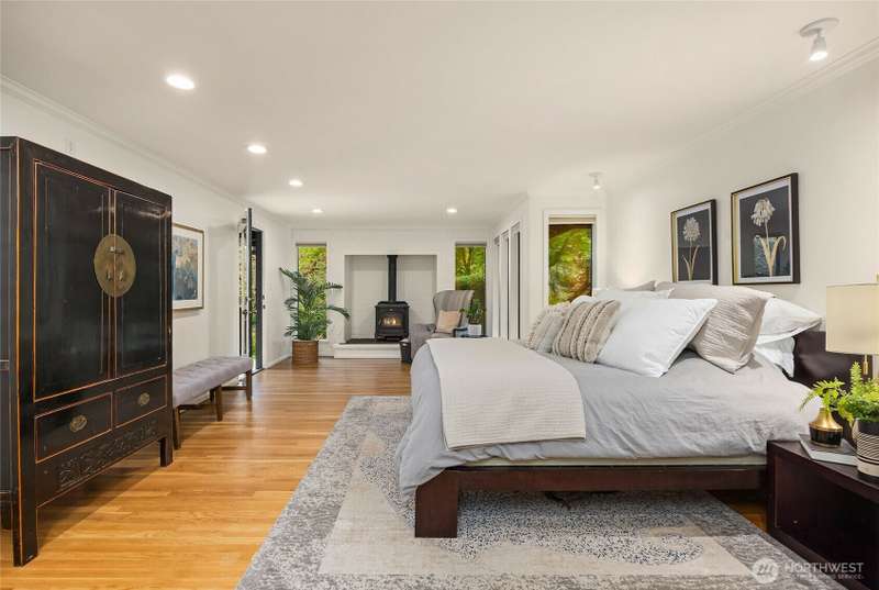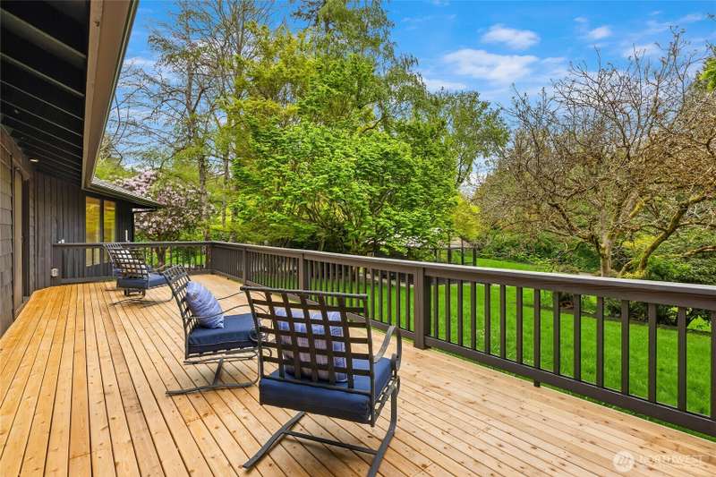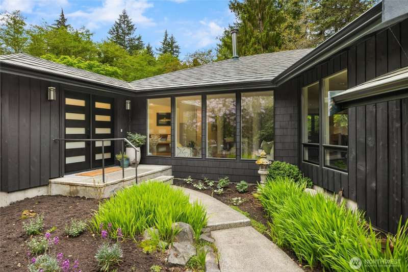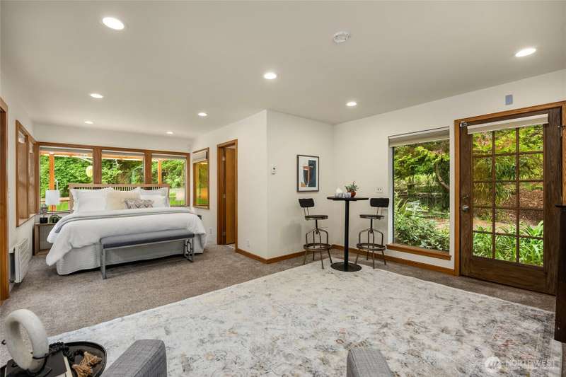 Stunning one-level home with a detached studio on lovely acreage abutting the Bloedel Reserve. The approach is along a peaceful driveway past your own pond & gorgeous gardens with a huge English walnut tree. The lot is private & sunny. Inside this home is open & airy with large windows to bring the outside in...a perfect home to entertain in with a great room that spills out onto expansive decks as well as separate spaces to work or play in. Beautiful, beveled glass French doors lead to a wonderful office. Main house has 2304 sq ft & detached studio with a full bath & large private deck has an additional 432 sq ft. Don't miss the fabulous greenhouse with radiant heated tables tucked in the garden, & workshop off the garage.