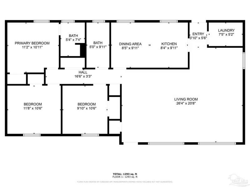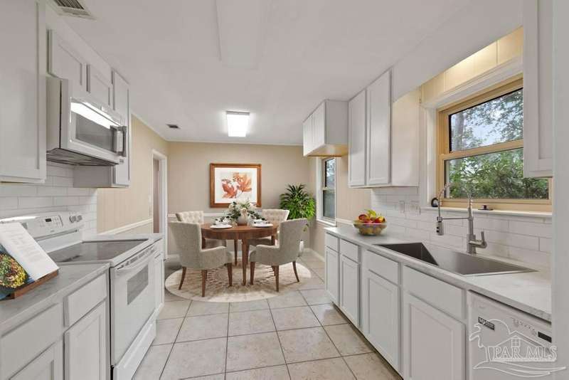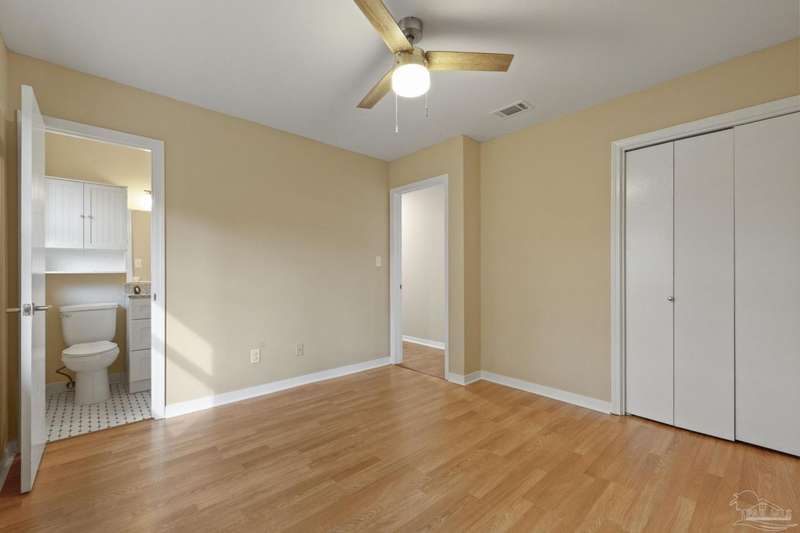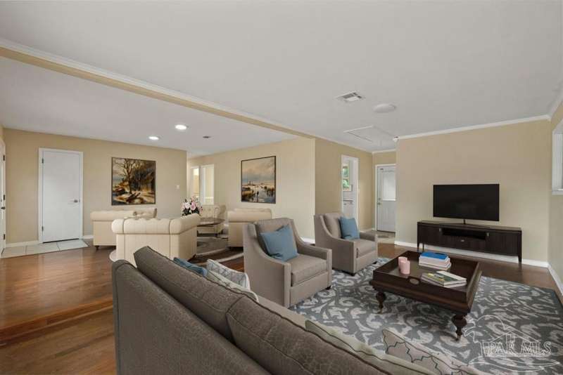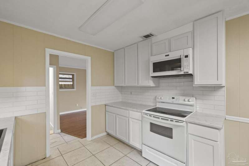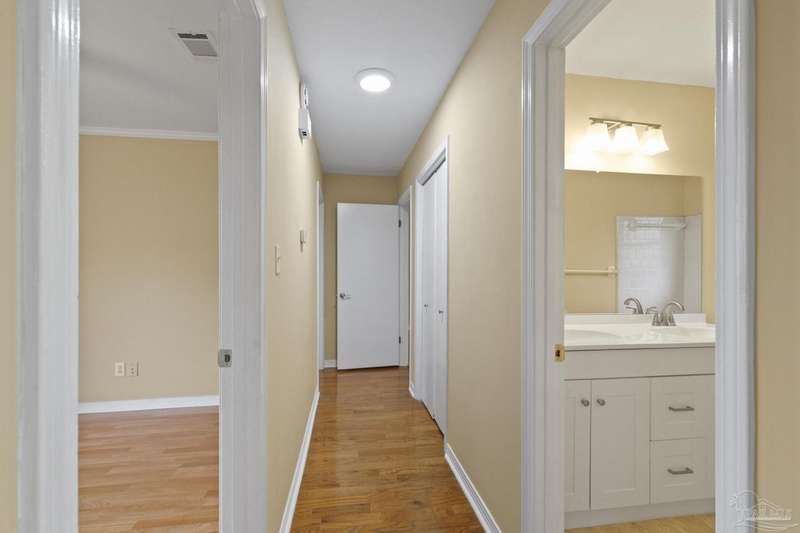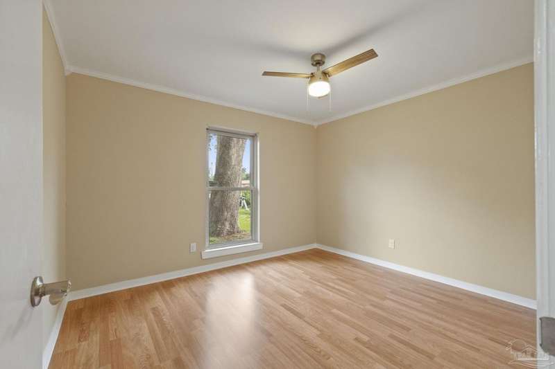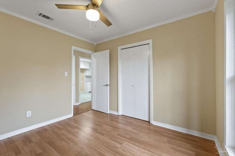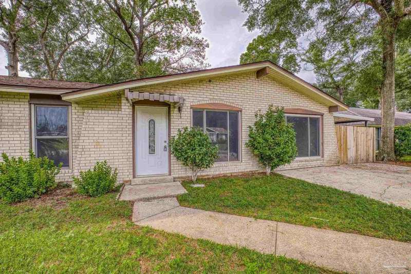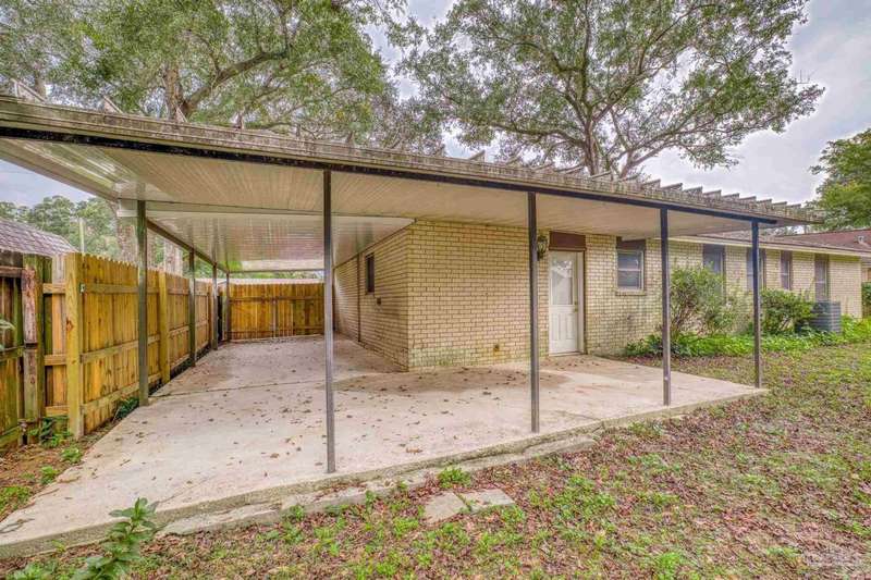 BACK ON MARKET DUE TO NO FAULT OF THE SELLERS! BRAND NEW ROOF, HVAC, HOT WATER HEATER & ALL COPPER WIRING! This 3 bedroom 2 bathroom home is fantastic for a growing family located in North Pensacola, just minutes from the interstate. The backyard of the .2 acre lot is fully fenced in and has a covered patio that is connected to the carport that could be used to store a vehicle or as an additional covered outdoor flex area. The major highlight of the interior of the home is the double open living spaces that you are immediately greeted by upon entering the home. The front wall of windows allows gorgeous natural light to shine in on the huge open space that is complemented by wood-look LVP flooring. The living areas lead you back to the eat-in kitchen, keeping the main traffic areas close to the front of the home. The kitchen has light cabinetry and white subway tile that accents as backsplash on both sides of the kitchen, and the dining space has wainscoting as an accent. The hallway leading to the back of the home grants access to all three of the bedrooms and the guest bathroom. The guest bathroom was renovated with new cabinetry, countertop for the double vanity and stylish gold fixtures. All three of the bedrooms have a warm wood-look LVP flooring, updated fans, baseboards and crown molding to bring the rooms together. The master bedroom does have an ensuite bathroom with a standing shower.