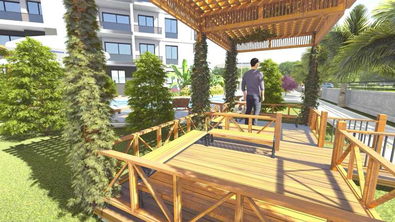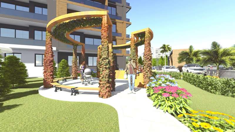 The apartment complex offers a single 11-storey block on its 3.370 m² total plots The complex offers an outdoor swimming pool, outdoor parking, playground, gazebo, barbeque area, Turkish bath, sauna, cinema, fitness, lift, generator, 24/7 security service, and security cameras.