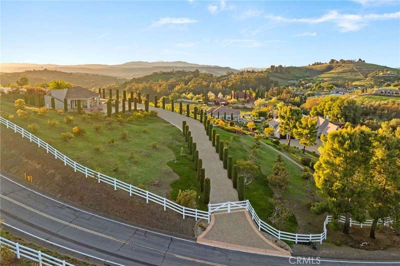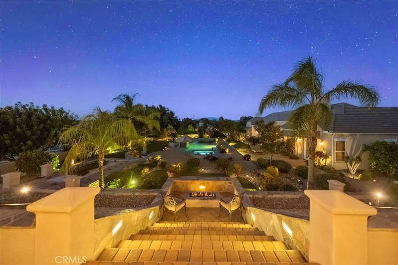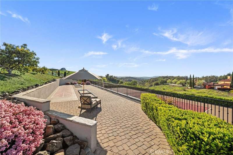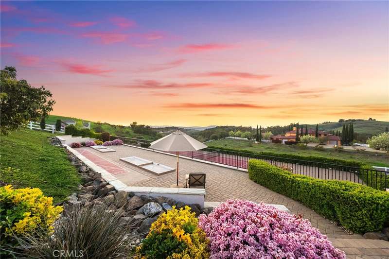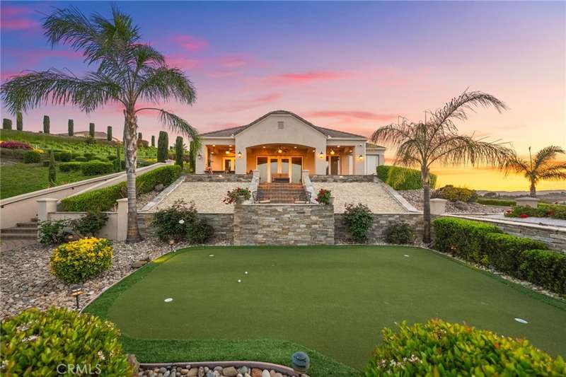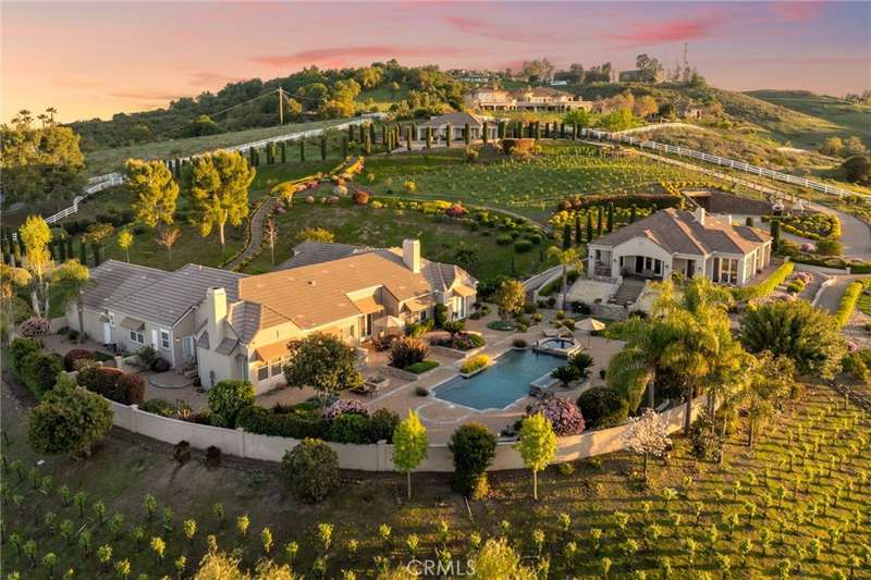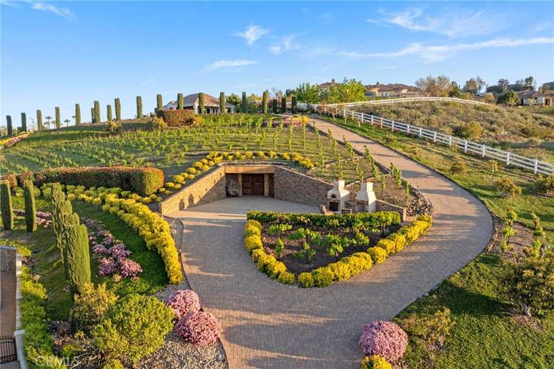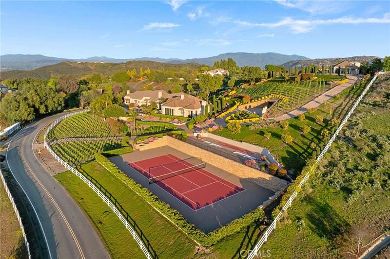 One-of-a-kind estate located just 5 minutes from the charm & culture of Old Town Temecula. Set behind 3 private gated entrances, this sprawling 4.19 acre compound features 3 separate single-story residences & an underground wine cellar all totaling approx. 6100 sq ft, masterfully positioned to capture breathtaking sunset views across rolling hills. The grounds truly set this estate apart; meticulously manicured landscapes framed by stately Italian cypress trees create an outdoor setting unlike any other. A dramatic stone stairway leads from the main home to the elevated studio residence. Entertain w/ ease and elegance w/resort style amenities; sparkling pool, two separate spas, water features, outdoor fireplaces, 2 putting greens, a sports court, & a post-tensioned tennis court w/ breathtaking views. Plus 2 built-in BBQ islands & pizza oven. Approx. 30,000 sq ft of stone pavers weave through the property. The main residence is approx. 3,275 sq ft w/ travertine flooring & architectural arches. It features 3 bedrooms, office, & 3.5 baths. The gourmet kitchen complete with granite countertops, 2 sinks, stainless steel appliances, built-in refrigerator, walk-in pantry, wine fridge, butler's pantry, & bar seating-all flowing seamlessly into the family room w/ views of the pool & gardens. The primary suite offers a private retreat w/ its own fireplace & French doors leading to the amazing pool & spa. The guest house offers approx. 1,600 sq ft of luxury living w/ 2 bdrms, 2 baths, a chef's kitchen, & fully retractable glass doors opening to commanding views of the surrounding countryside. At the estate's highest point, the studio offers approx. 600 sq ft of open-concept living, complete with an elevated desk area, curved wine bar, a built-in spa, putting green, rooftop lounge, ATV-sized garage, & unmatched panoramic vistas. A 600 sq ft stand-alone reinforced concrete wine cellar is the perfect sanctuary for wine-making enthusiasts - complemented by approx. 1,000 wine grapevines and 21 table grapevines, as well as approx. 100 avocado trees, and various fruit trees. Additional features include upgraded mahogany garage doors, extensive landscape lighting, whole house & outdoor sound systems, multiple whole-house fans for year-round comfort, & a comprehensive security system. Perfect for a multigenerational compound, vineyard retreat, or entertainer's paradise, this Temecula estate redefines California luxury living with a setting that must be seen to be believed.