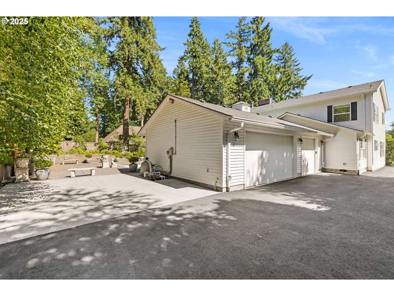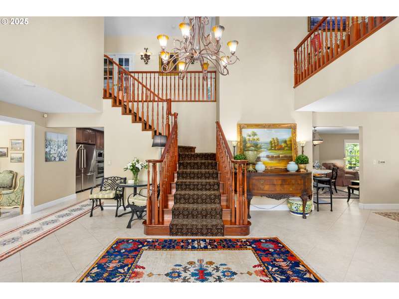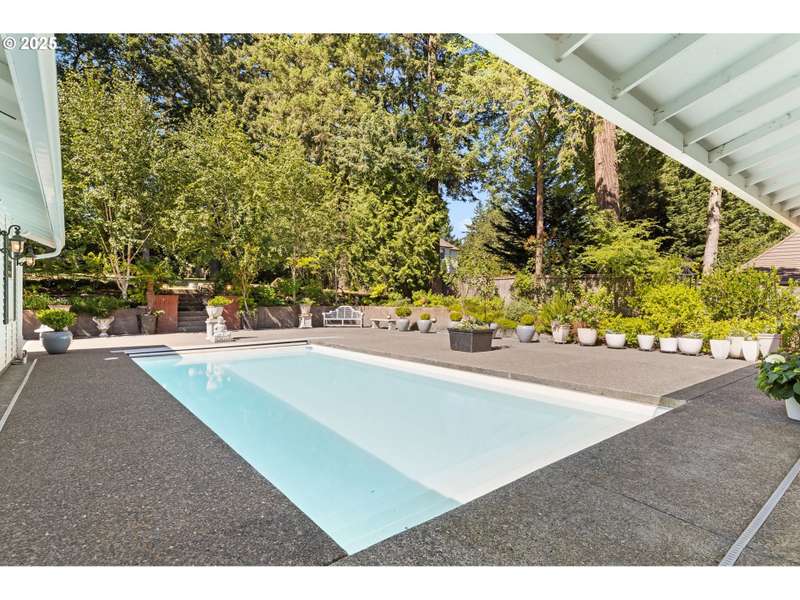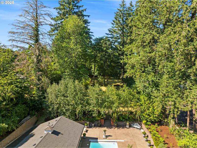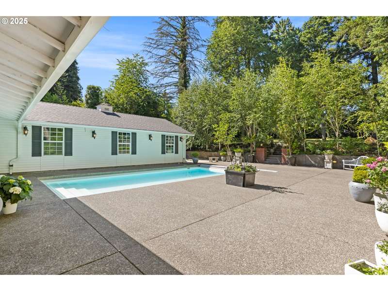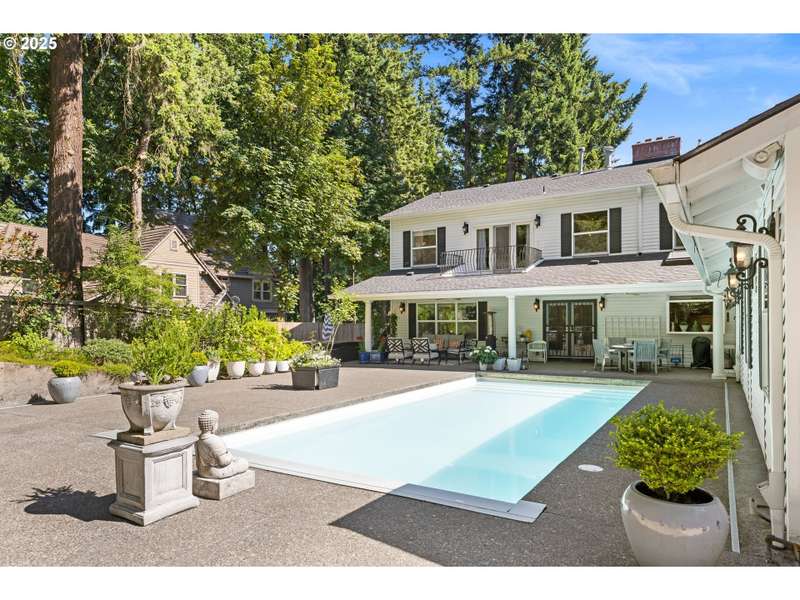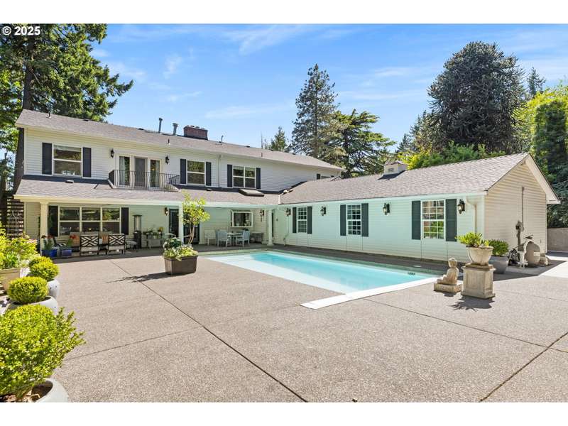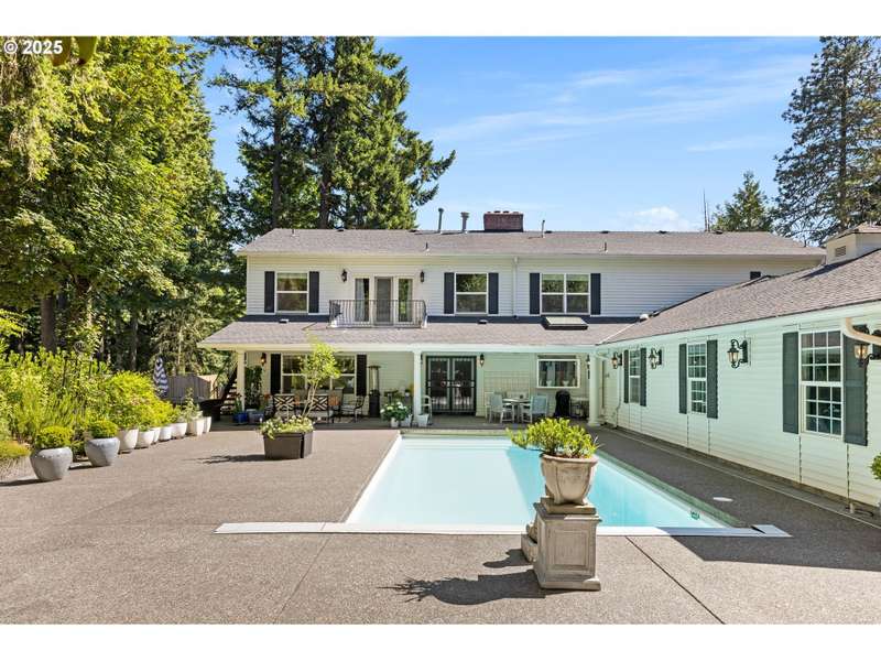 OPEN TUESDAY JULY 22ND FROM 11AM TO 1PM. Set back on a beautifully landscaped lot with a newer garden design and circular driveway, this impressive traditional residence offers timeless style and modern comfort. Nestled on 1.03 acres, the home features an attached 3-car garage and a serene, park-like backyard with a sparkling pool—perfect for entertaining or quiet relaxation. The expansive grounds provide ample room for play or potential development of an ADU or separate guest house; buyer to do due diligence. Inside, a dramatic foyer with soaring ceilings opens to a second-floor wraparound balcony, creating an immediate sense of grandeur. The classic layout includes a formal living room, elegant dining room, and a cozy reading nook—all seamlessly flowing into the heart of the home. The oversized entertainer’s kitchen is a showstopper, complete with high-end appliances, casual dining space, and a spacious family room that opens to a covered patio. From here, enjoy panoramic views of the lush garden, pool, and surrounding property. The generous owner's suite is a private retreat featuring a fireplace, a sun-filled dressing room, and a spa-inspired bathroom with a walk-in shower and soaking tub. Upstairs, you'll find two additional bedrooms, a full bath, and a highly desirable home office with abundant natural light. One of the bedrooms is ideally located on the main floor, perfect for guests, in laws, or aging in place. The unfinished lower level offers endless possibilities—whether you envision a game room, home theater, wine cellar, or ample storage space. Located just minutes from Lake Oswego’s renowned dining, shopping, top-rated schools, and Oswego Lake Country Club, this property is a rare opportunity to own a slice of classic luxury with room to grow.